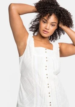 Gewebtes Top mit Knöpfen in Metall-Optik, von sheego by Joe Browns. Die ärmellose Form besitzt elastische, leicht gekräuselte Träger, ein femininer Karree-Ausschnitt bringt dabei wunderschön das Dekolleté zur Geltung. Viele kleine Details wie Biesen und Spitzenbesätze runden den Style modisch ab. Im Rücken betont ein Bindeband feminin die Taille, die darunter ausgestellte A-Linie fällt locker über die Hüftpartie.