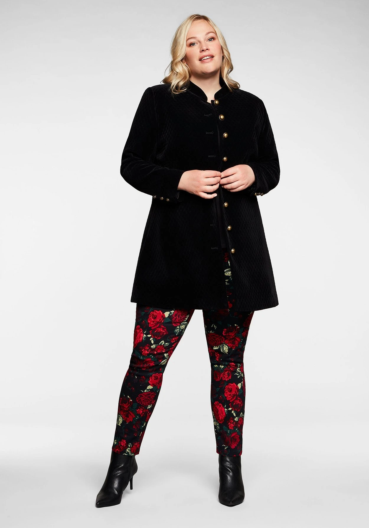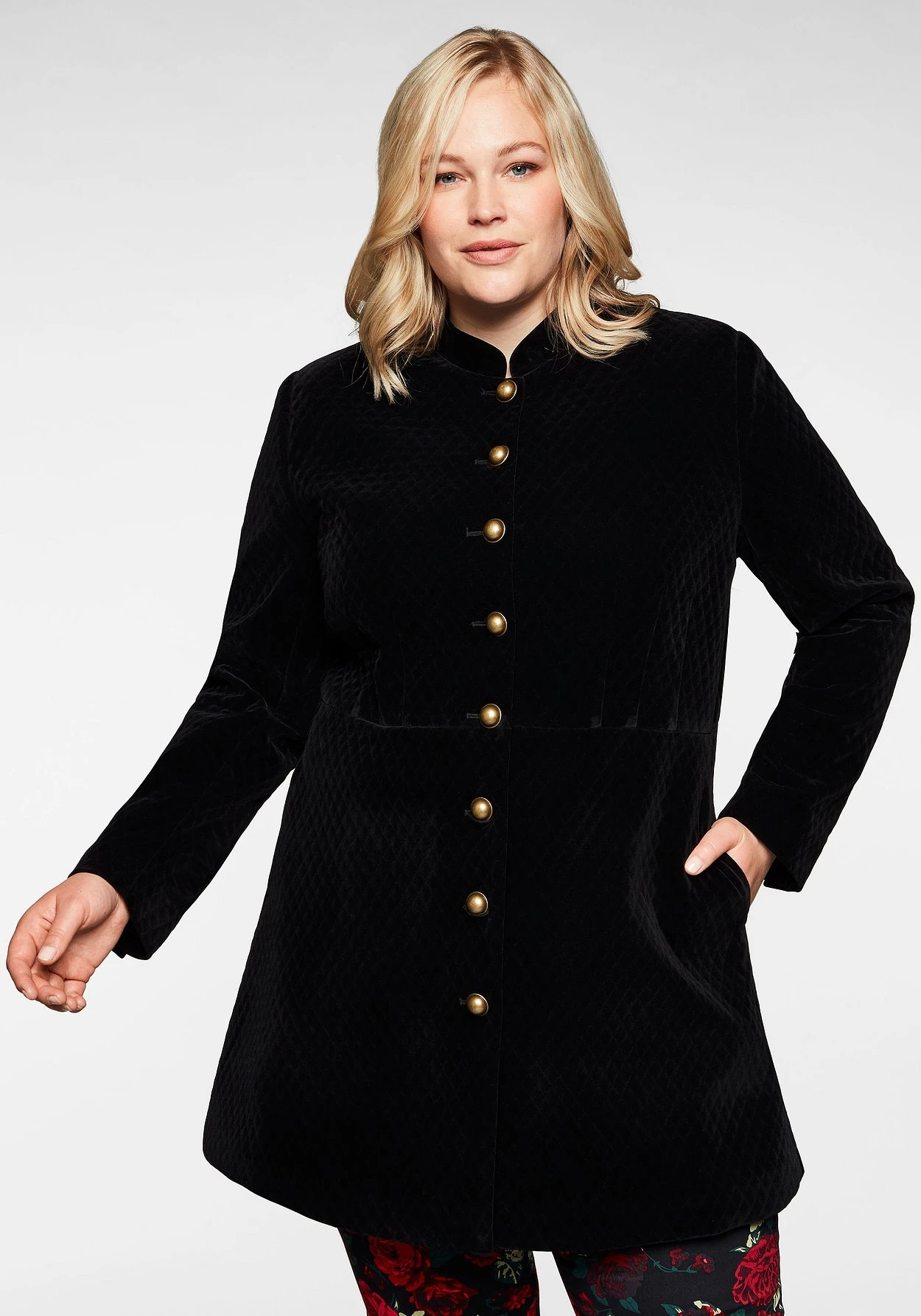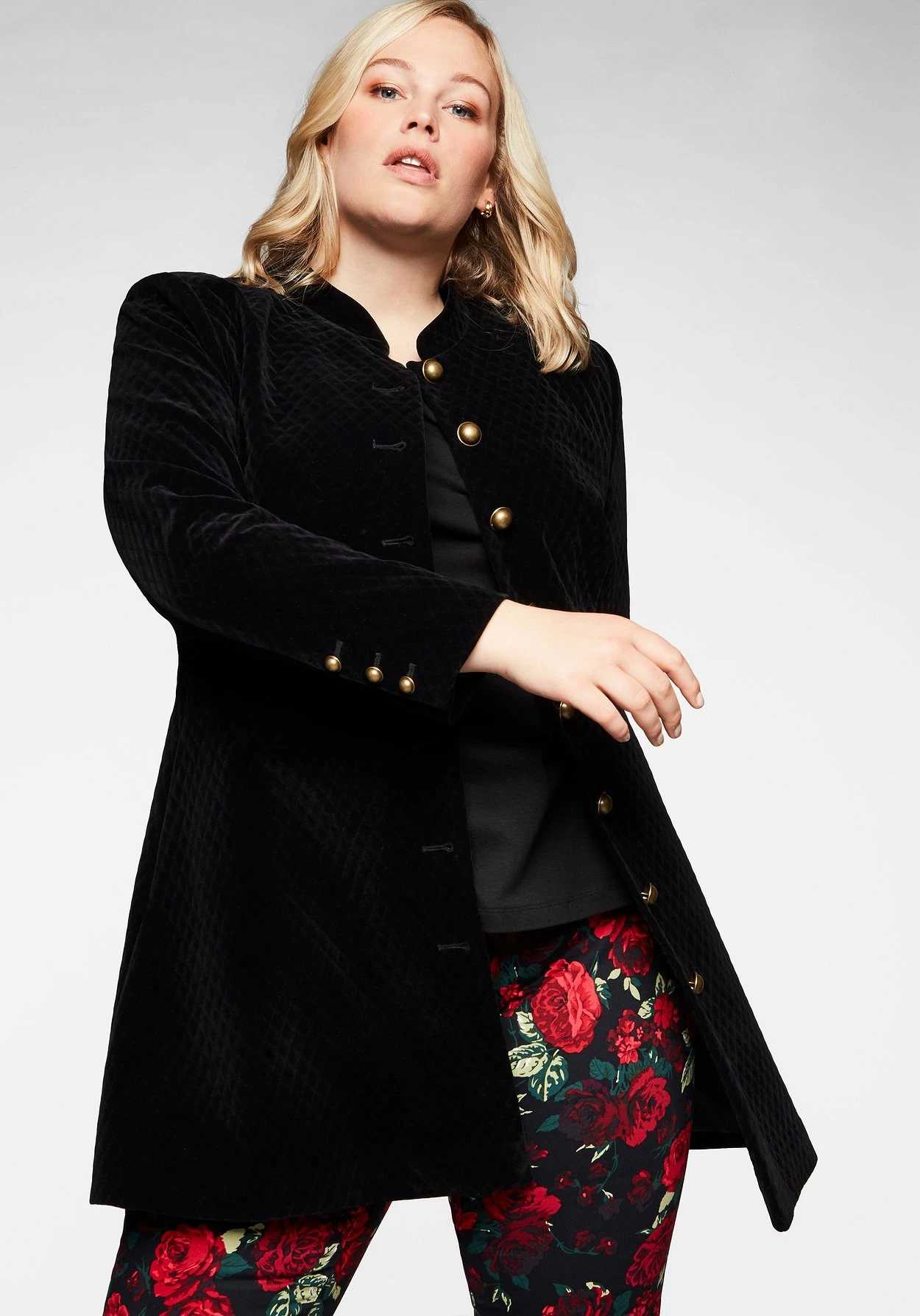 Jacke in weicher Samt-Qualität von sheego by Joe Browns. Der Stehkragen und die auffälligen Knöpfe an der Knopfleiste sowie an den Ärmeln geben ihr eine besondere Note. In die Seiten sind Eingrifftaschen eingefasst, figurschmeichelnde Teilungsnähen befinden sich hinten.