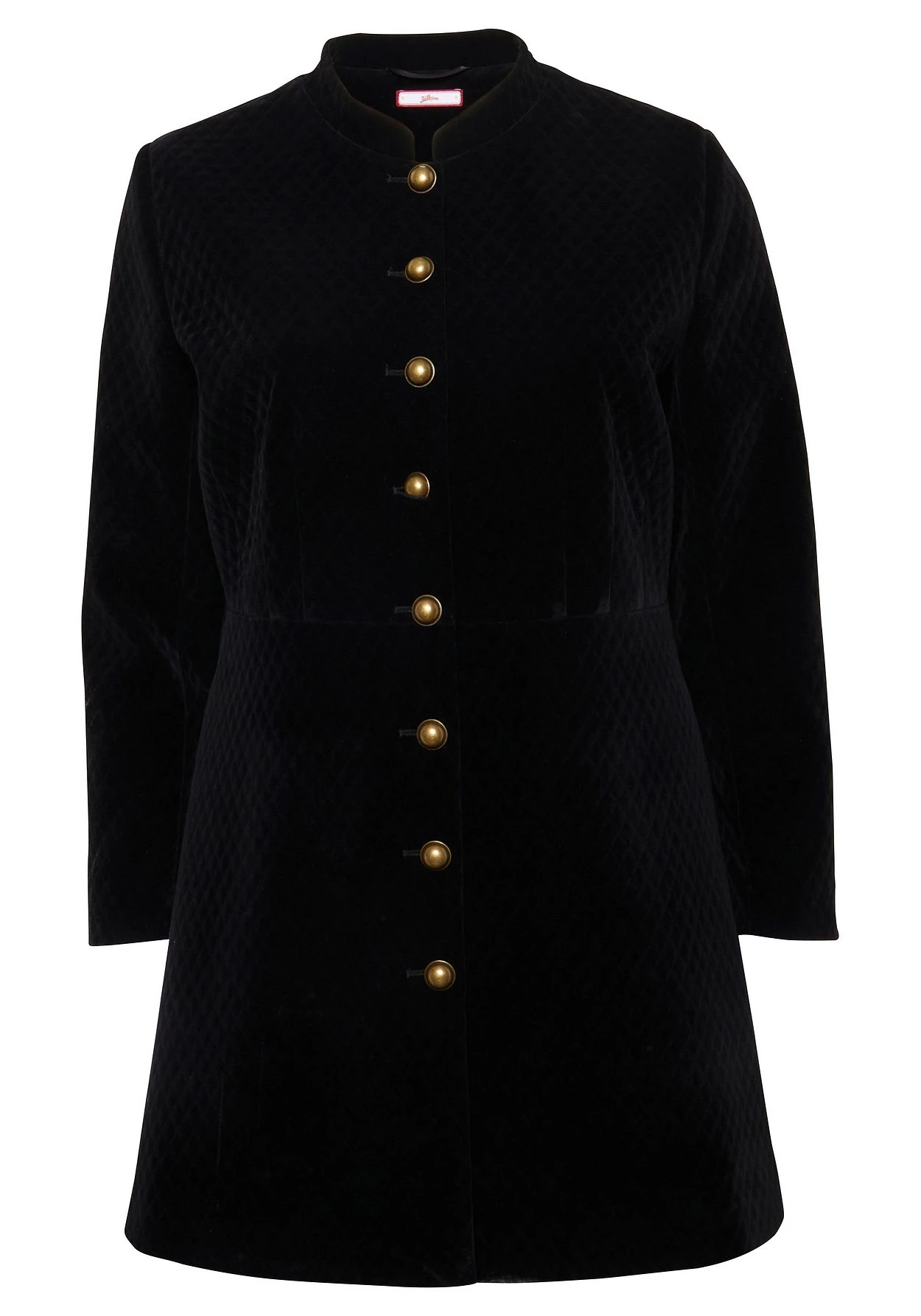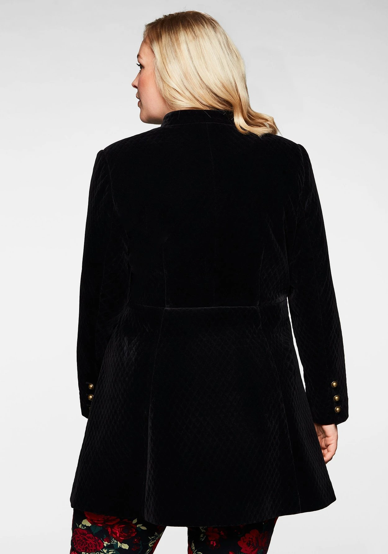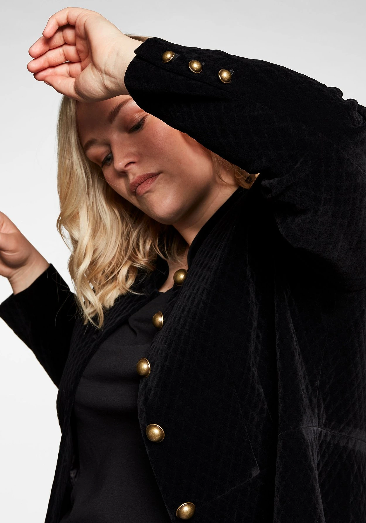 Jacke in weicher Samt-Qualität von sheego by Joe Browns. Der Stehkragen und die auffälligen Knöpfe an der Knopfleiste sowie an den Ärmeln geben ihr eine besondere Note. In die Seiten sind Eingrifftaschen eingefasst, figurschmeichelnde Teilungsnähen befinden sich hinten.
