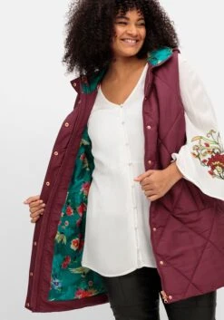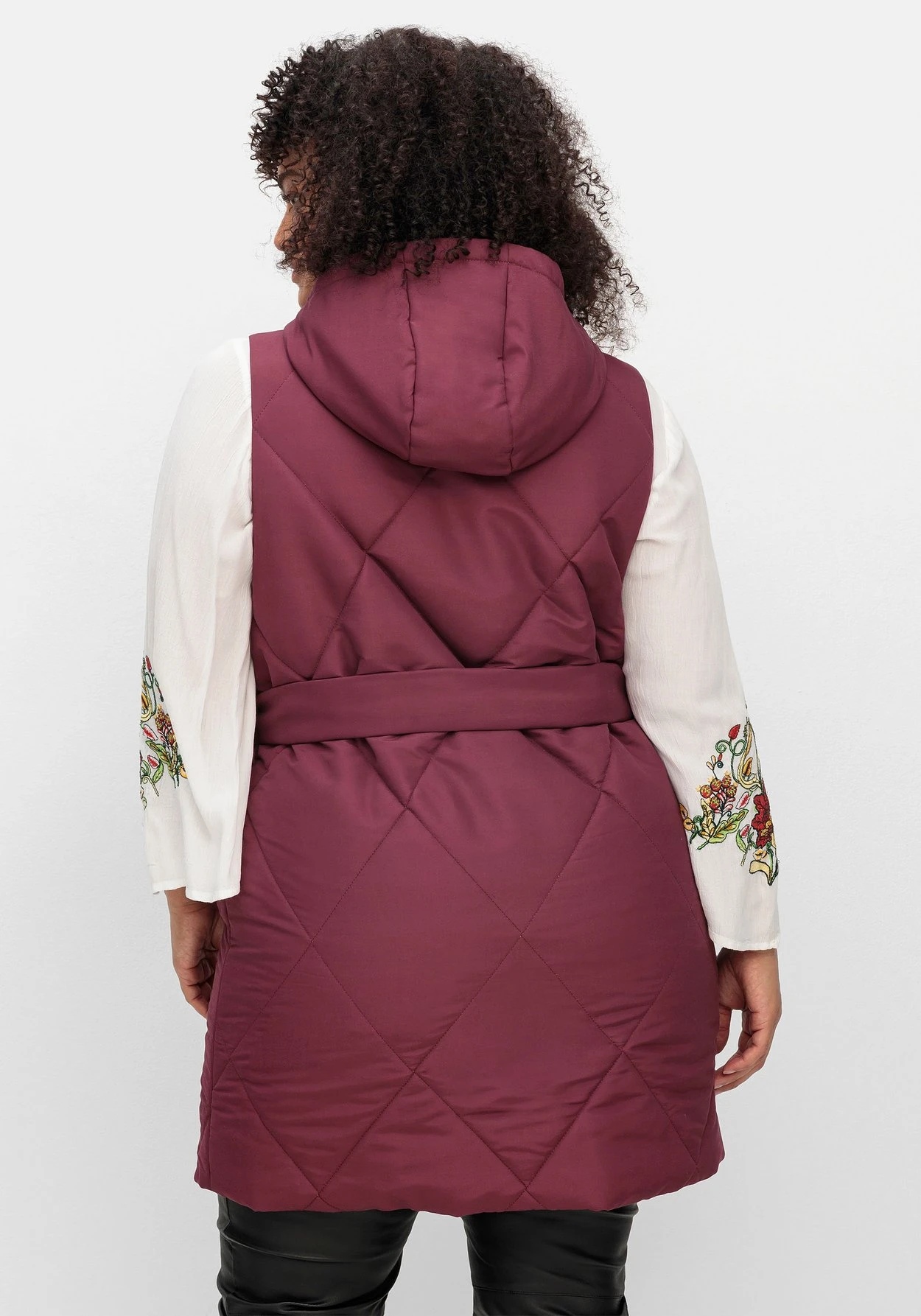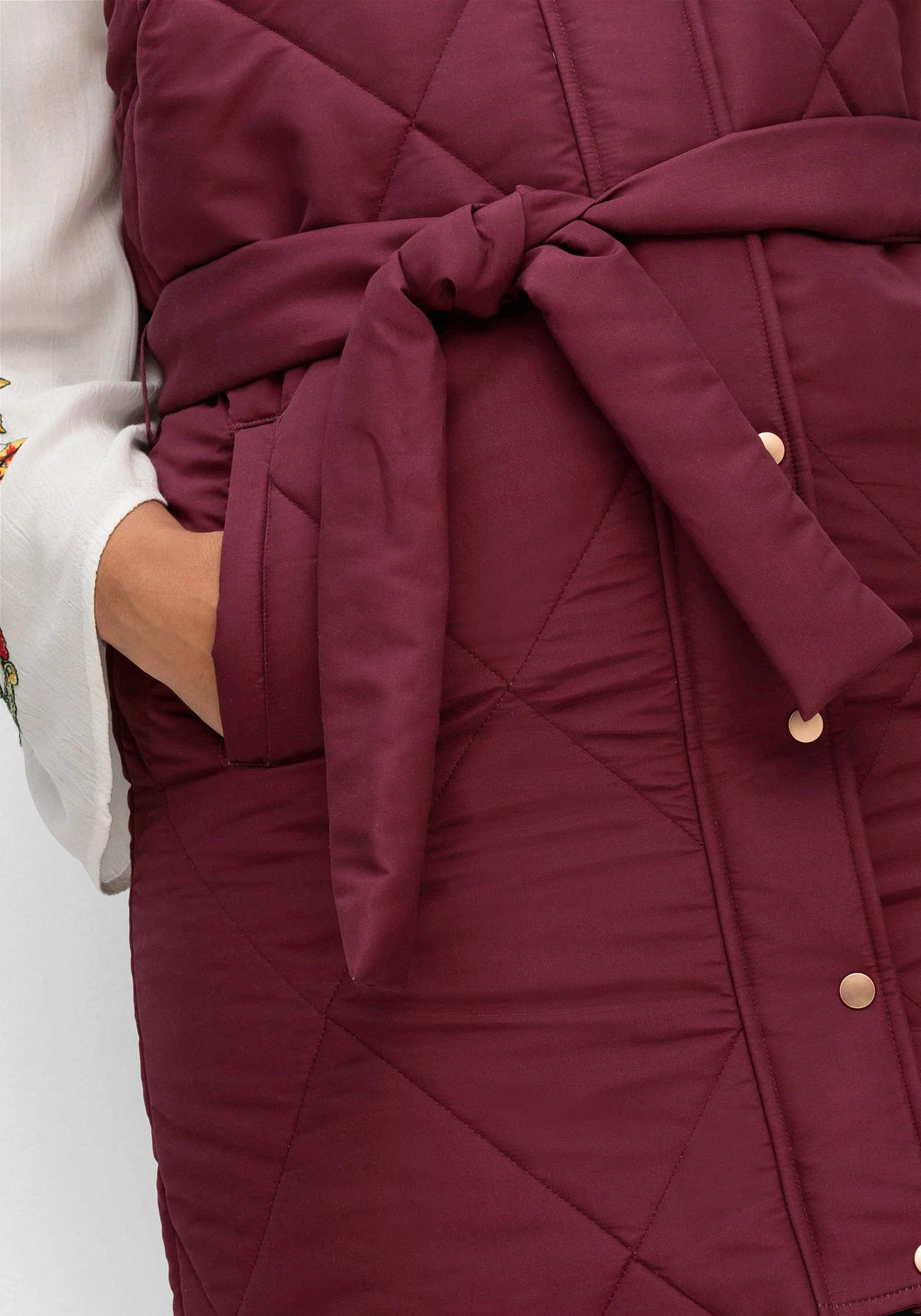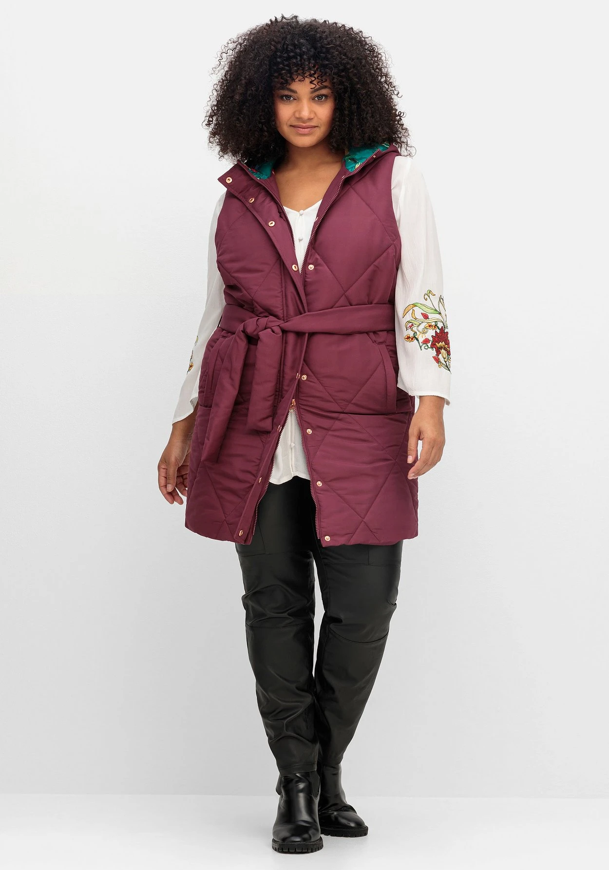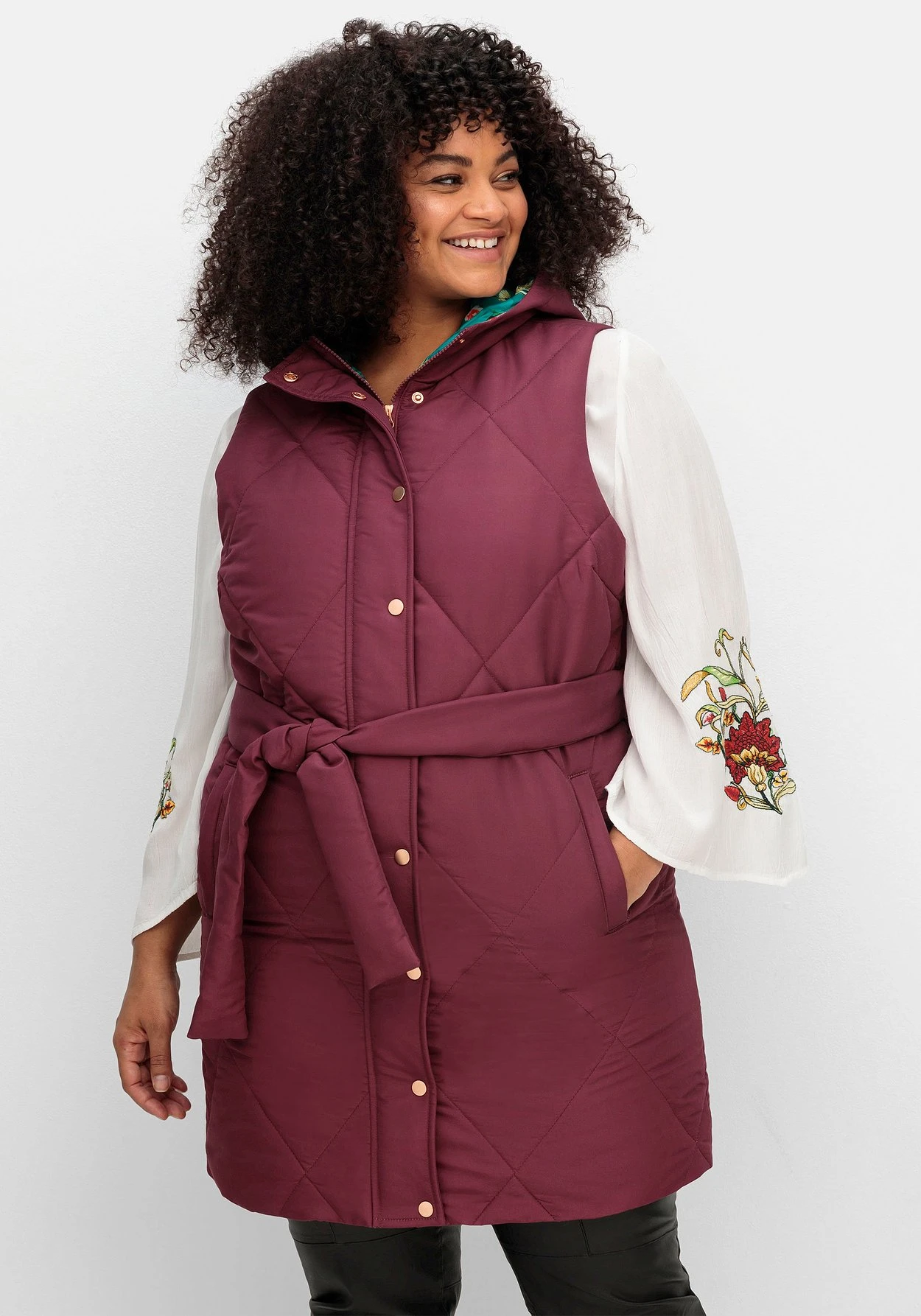 Steppweste mit Kapuze, von sheego by Joe Browns. Die Weste ist leicht wattiert und fällt durch die dekorative Rautensteppung ins Auge. Der Bindegürtel formt eine feminine Silhouette, kann aber auch abgenommen werden. Für optimale Bewegungsfreiheit sorgt der 2-Wege-Reißverschluss, der sich ganz bequem von oben und unten öffnen lässt. Roségoldfarbene Knöpfe verleihen der Weste eine elegante Note, hübsches Detail ist das kontrastfarben bedruckte Innenfutter. Schräge Eingrifftaschen ergänzen den Look.