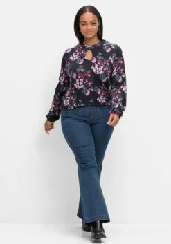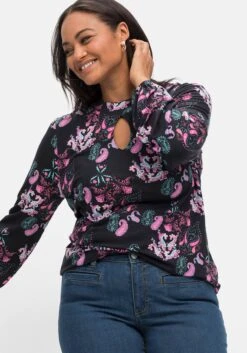 Langarmshirt mit Alloverdruck, von sheego by Joe Browns. Der dekorative Paisley-Print tritt durch den dunklen Hintergrund stärker hervor und wirkt dadurch schick und modern. Auch der kleine Stehkragen, der ovale Cut-out sowie der Schlüssellochausschnitt im Nackenbereich unterstreichen den femininen Look. Lange Ärmel mit elastischen Ärmelbündchen ergänzen den Style.