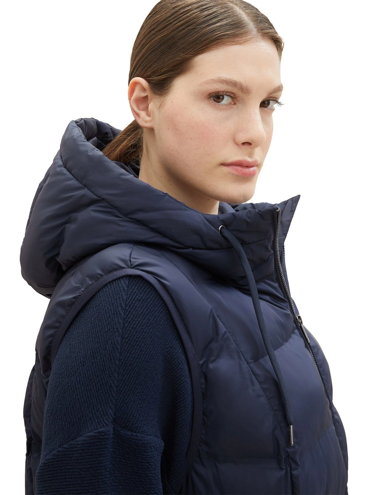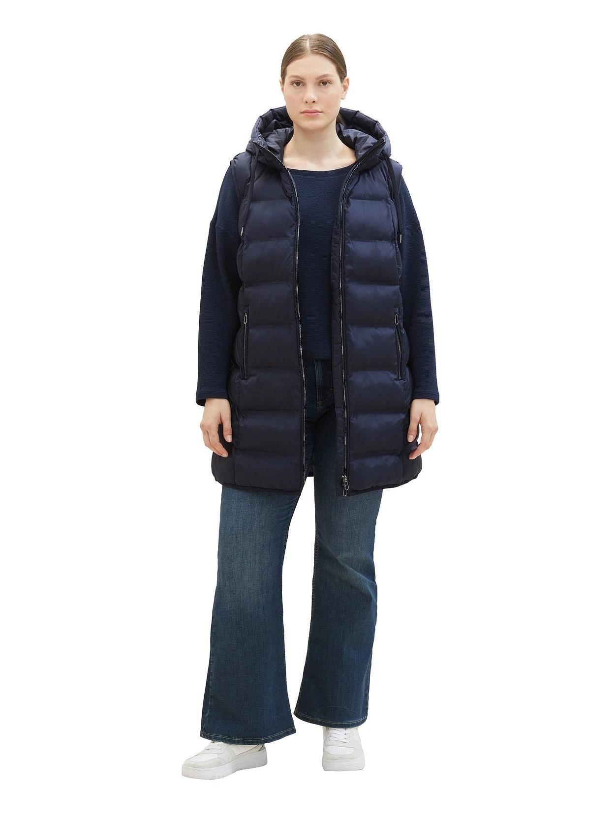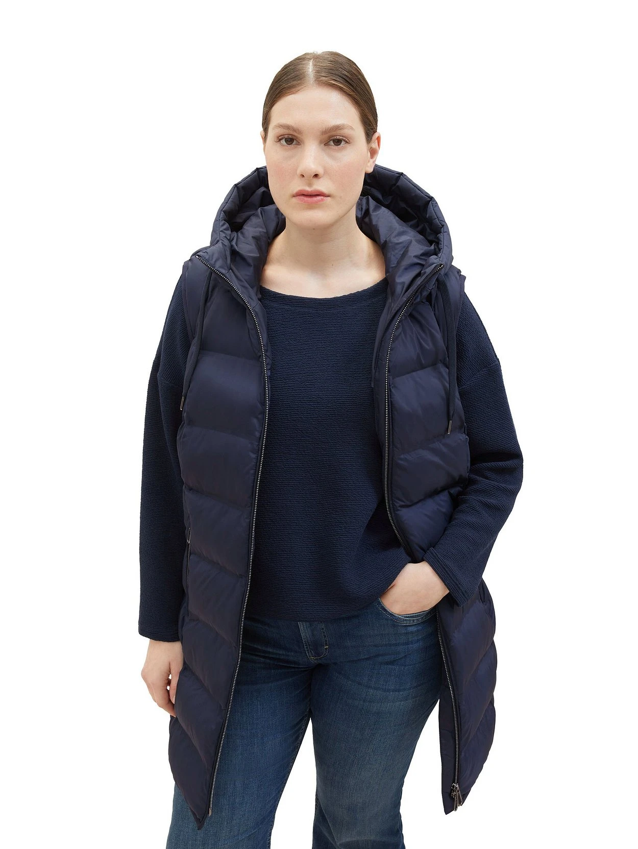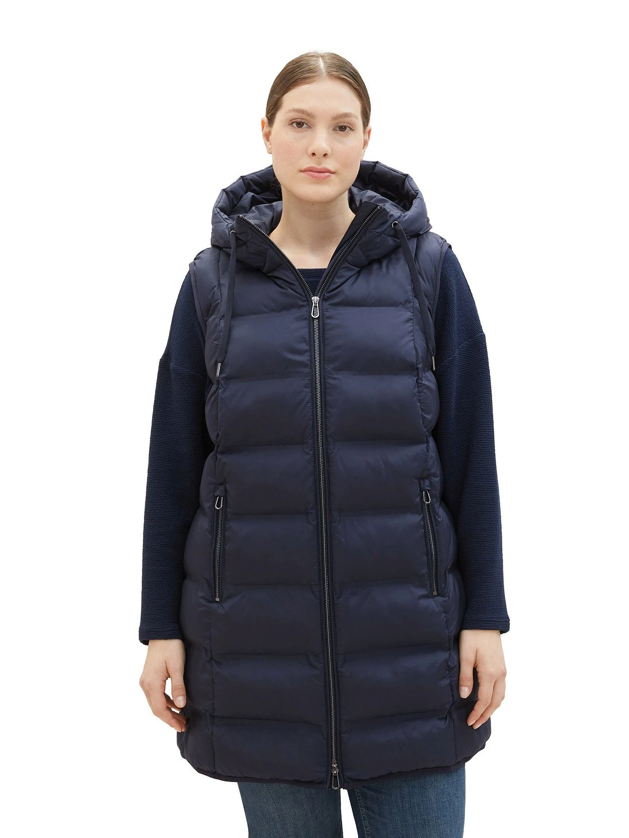 Steppweste von TOM TAILOR Plus. Das angenehm leichte Material und der lange Schnitt machen sie zum idealen Begleiter durch die Übergangszeit. Sie ist mit Kapuze und Bindeband gearbeitet, praktisch sind die beiden seitlich eingesetzten Reißverschlusstaschen.