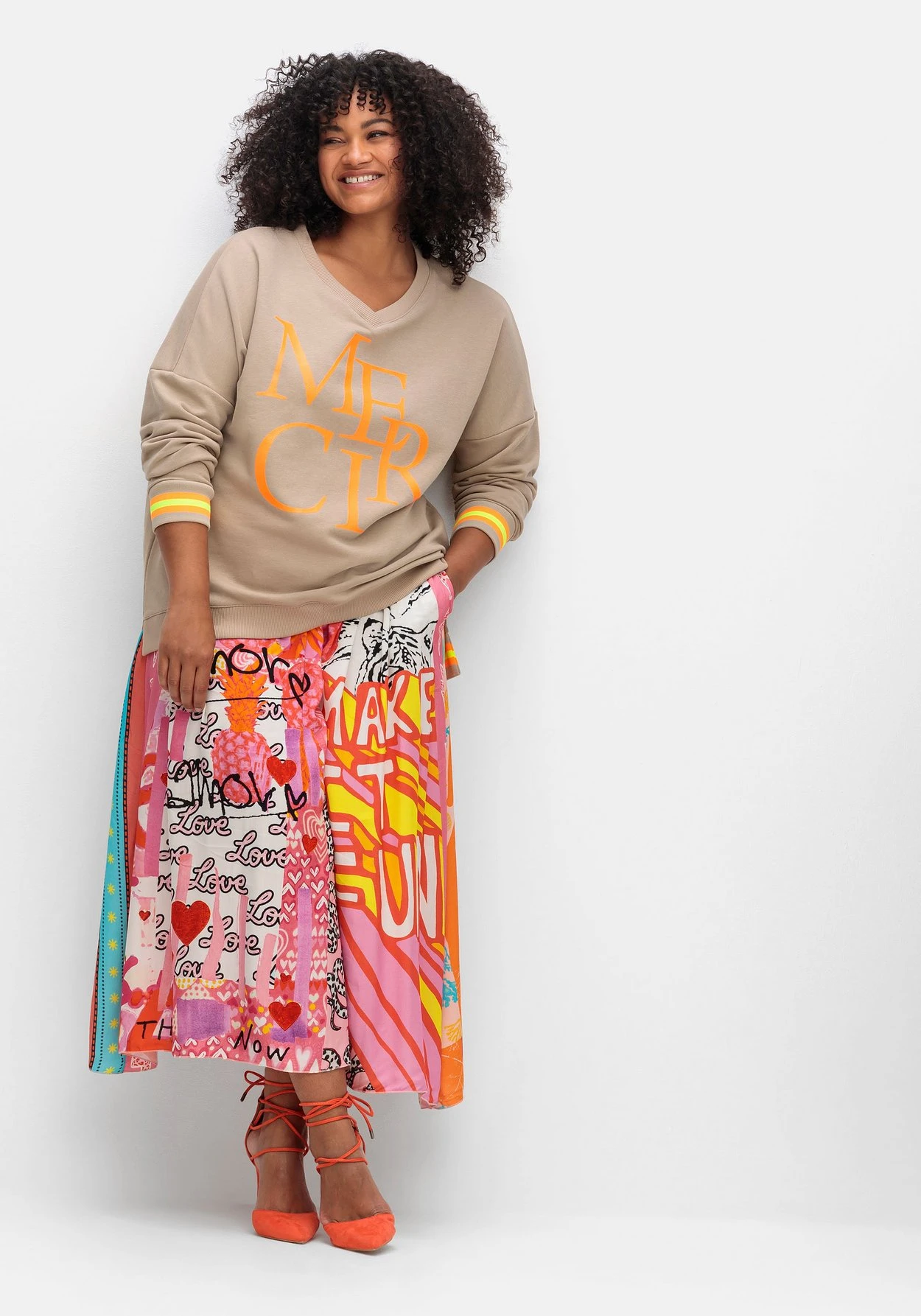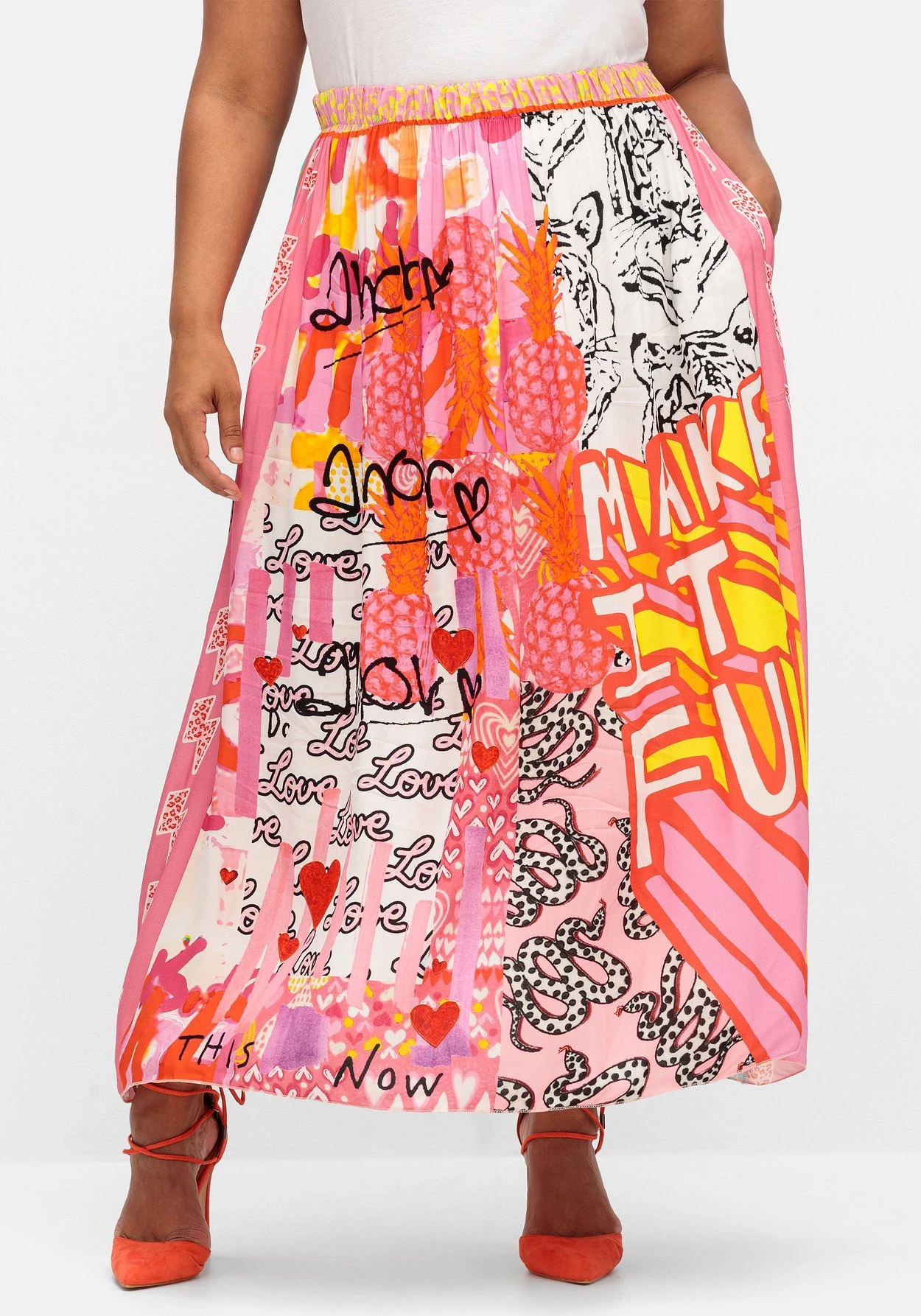 Maxirock in weich fließender Satin-Qualität von sheego loves miss goodlife. Der extravagante Mustermix lebt durch seinen ausdrucksstarken Print und die leuchtenden Farben – ein echter Blickfang! Mit elastischem Formbund sitzt der Rock bequem, praktisch sind die seitlichen Eingrifftaschen.
