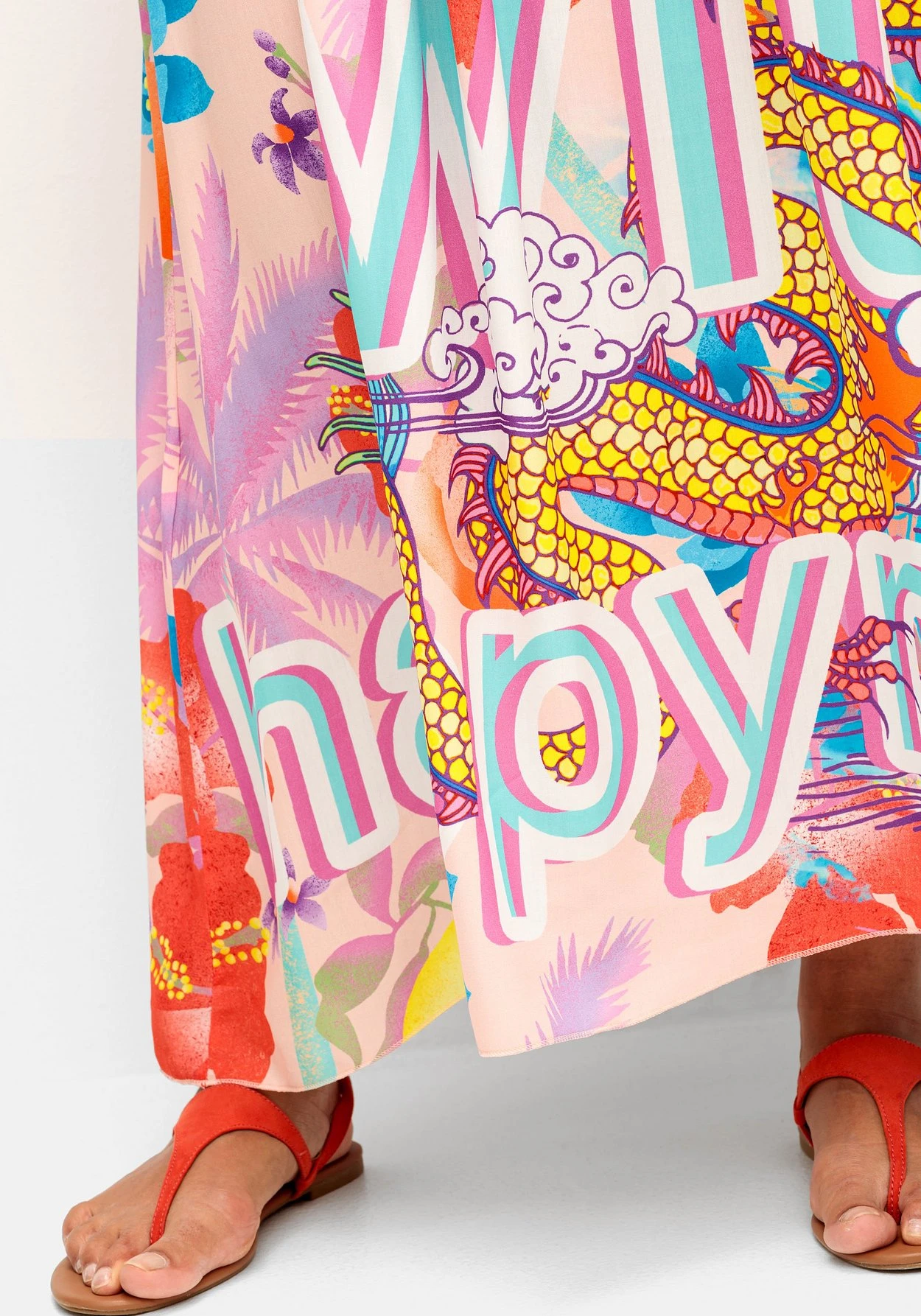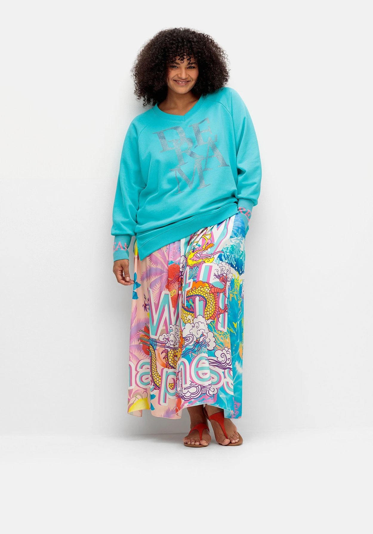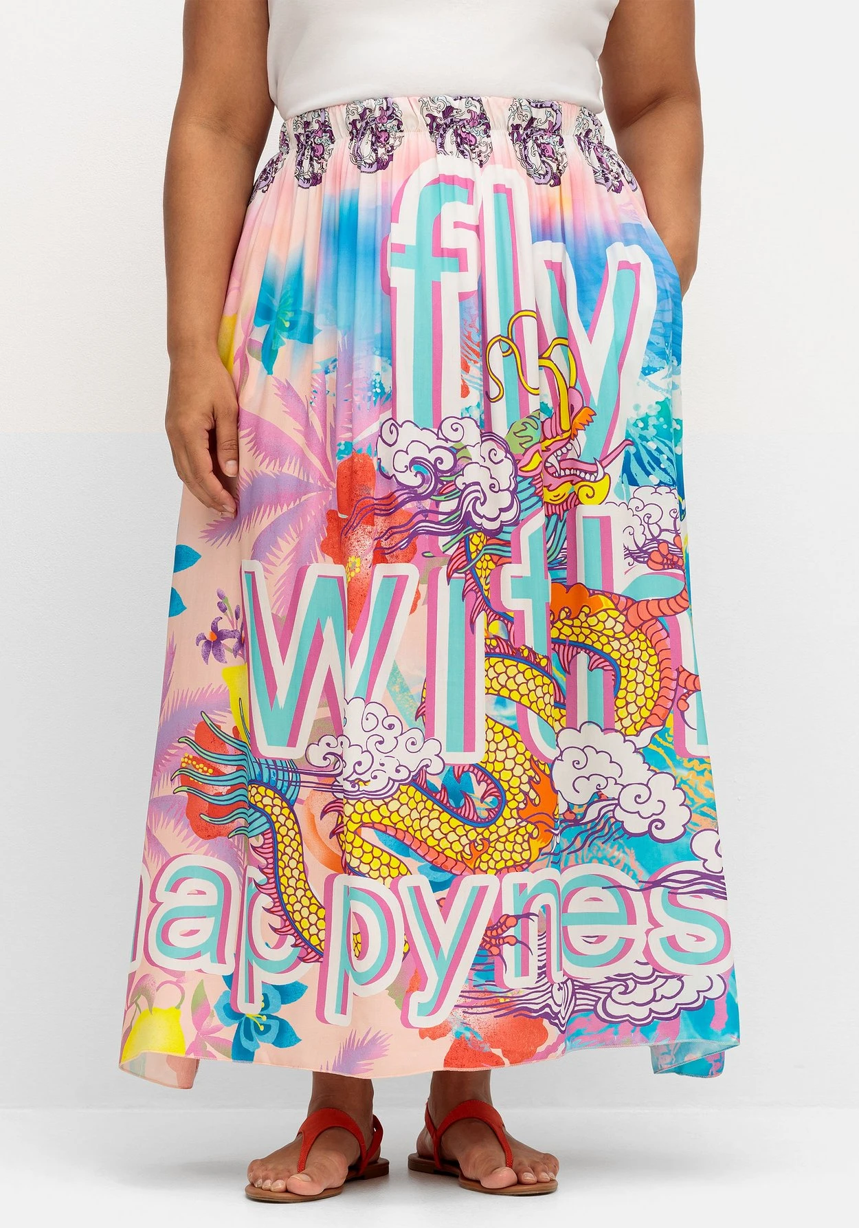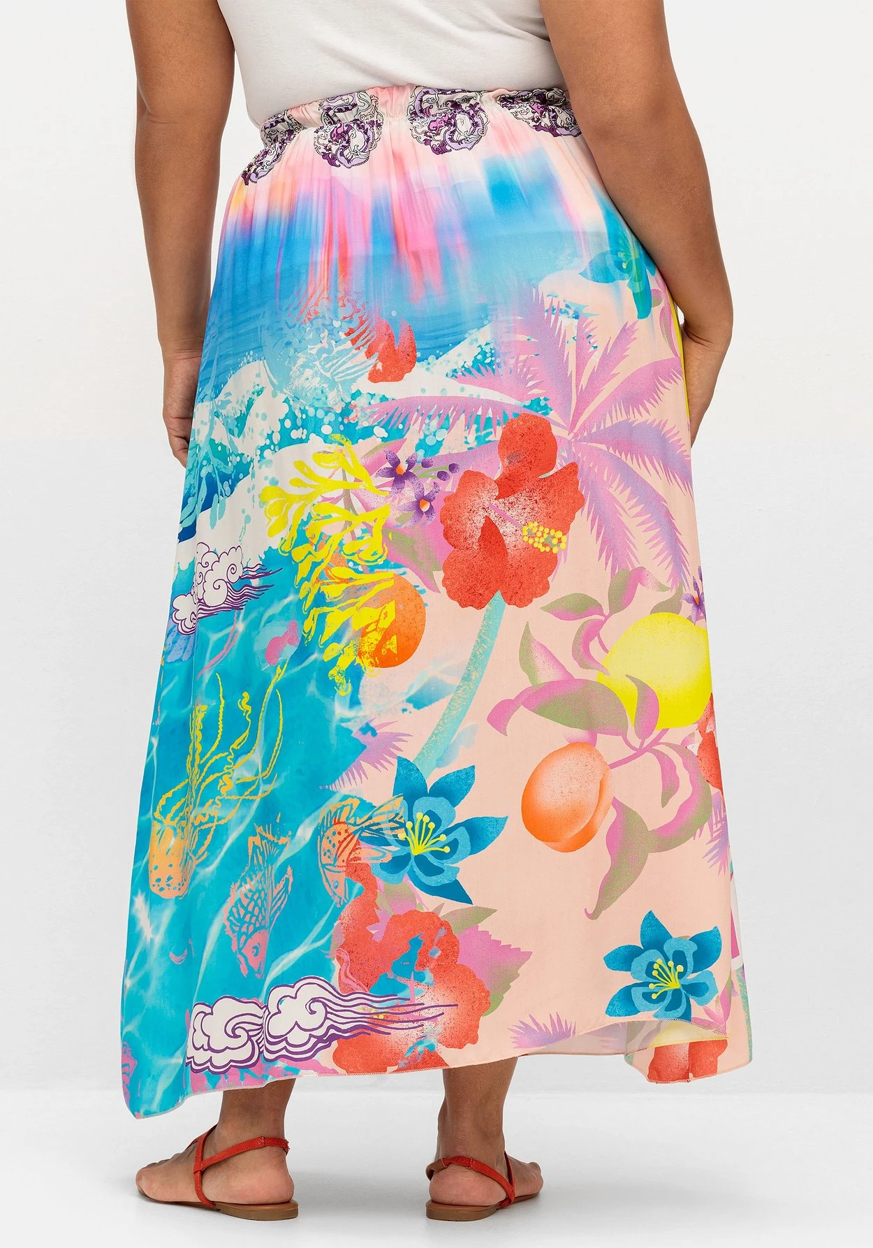 Maxirock in weich fließender Satin-Qualität von sheego loves miss goodlife. Der farbenfrohe Mustermix bringt wunderschön Tropical- und Asia-Flair zusammen – ein echter Styling-Highlight! Mit elastischem Formbund sitzt der Rock bequem, praktisch sind die Eingrifftaschen in der Seite.