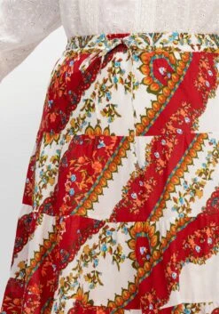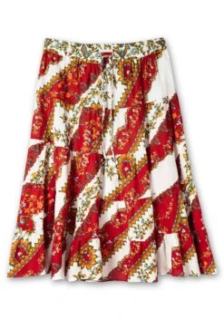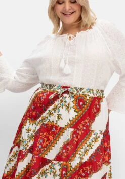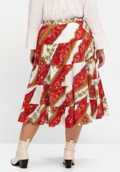 Rock in Maxilänge von sheego by Joe Browns. Das farbenfrohe, versetzt angelegte Muster macht aus jedem Teil ein Unikat. Der leicht ausgestellte Schnitt mit Stufen und Volant am Saum gibt dem Rock Schwung und verspielten Charme. Durch den elastischen Schlupfbund sitzt er bequem in der Taille, ein Bindeband dient als feminines Finish.