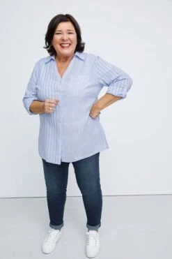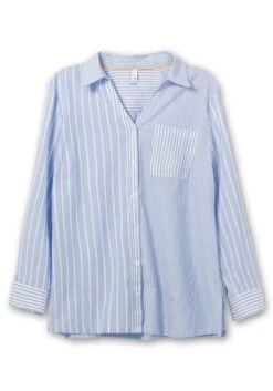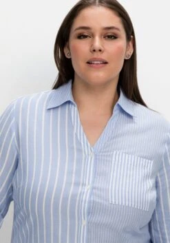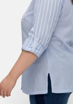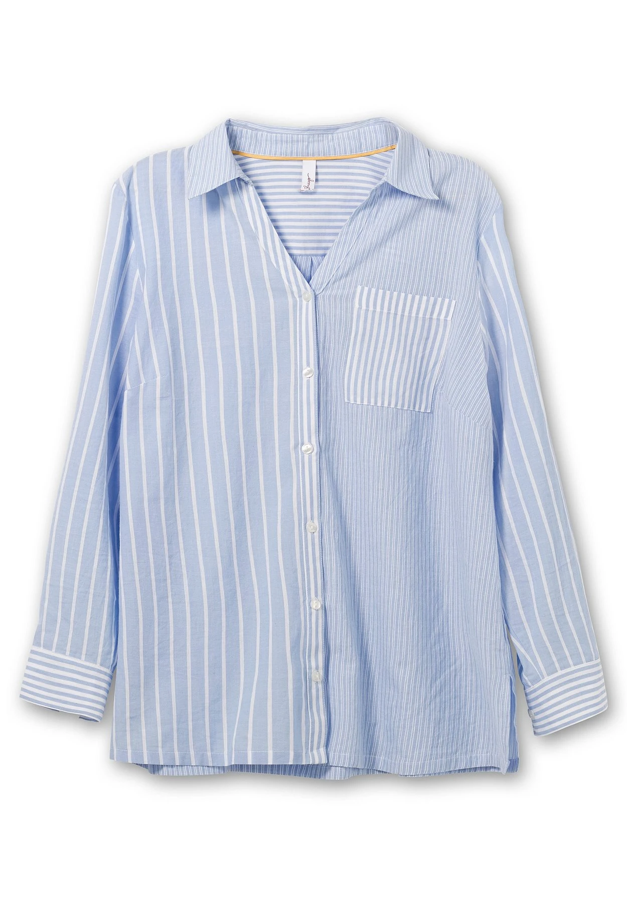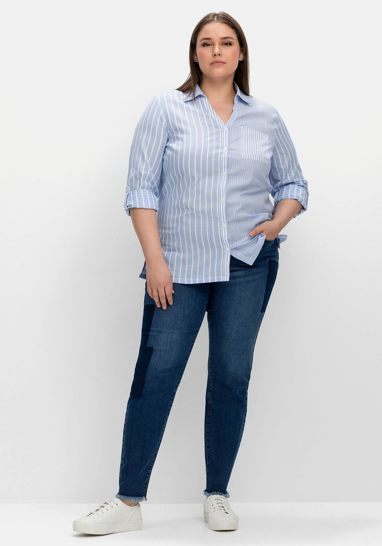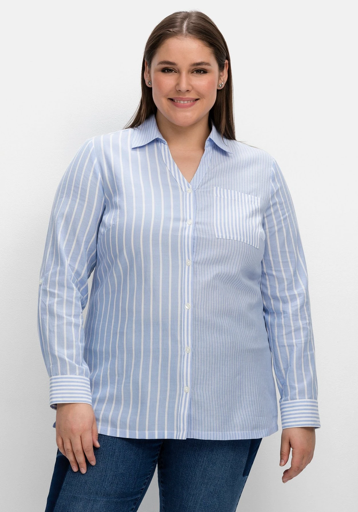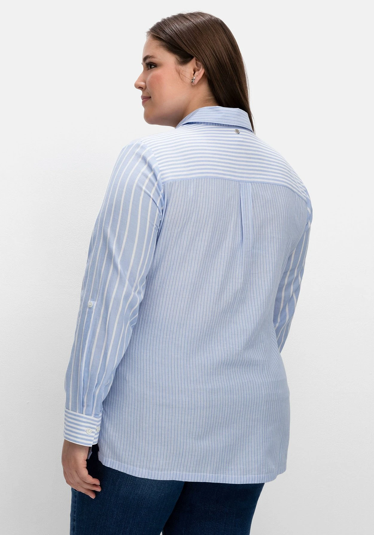 Bluse im Mix aus verschiedenen Streifen. Zum dekorativen Muster kommt ein klassischer Schnitt: Das Oberteil ist mit Blusenkragen und einer durchgehenden Knopfleiste versehen, vorn befindet sich eine Brusttasche. Die langen Ärmel enden mit Manschetten und Knöpfen. Die Passe mit Quetschfalte hinten sowie seitliche Schlitze machen den Tragekomfort perfekt.