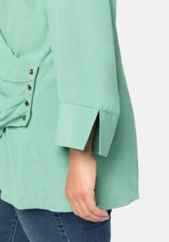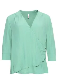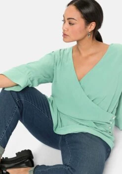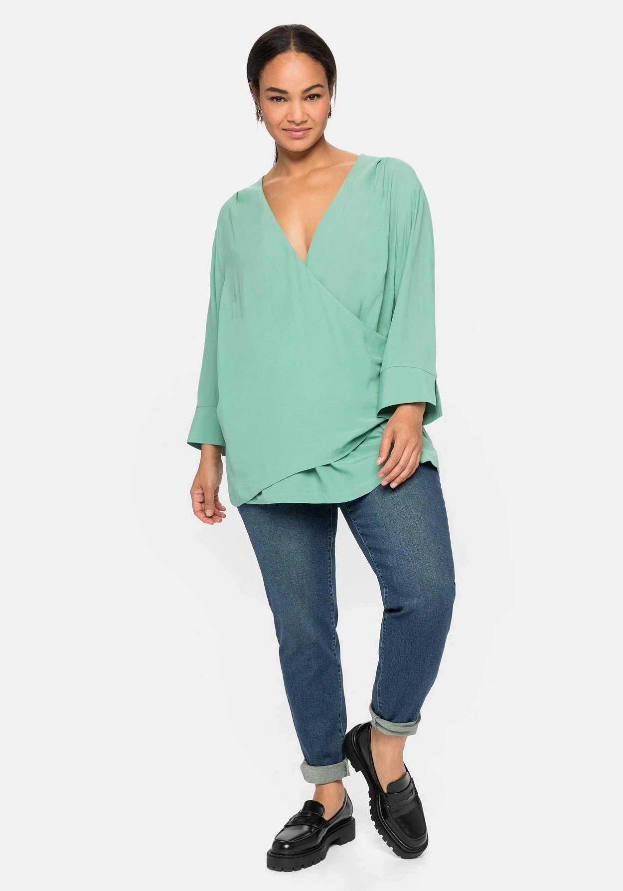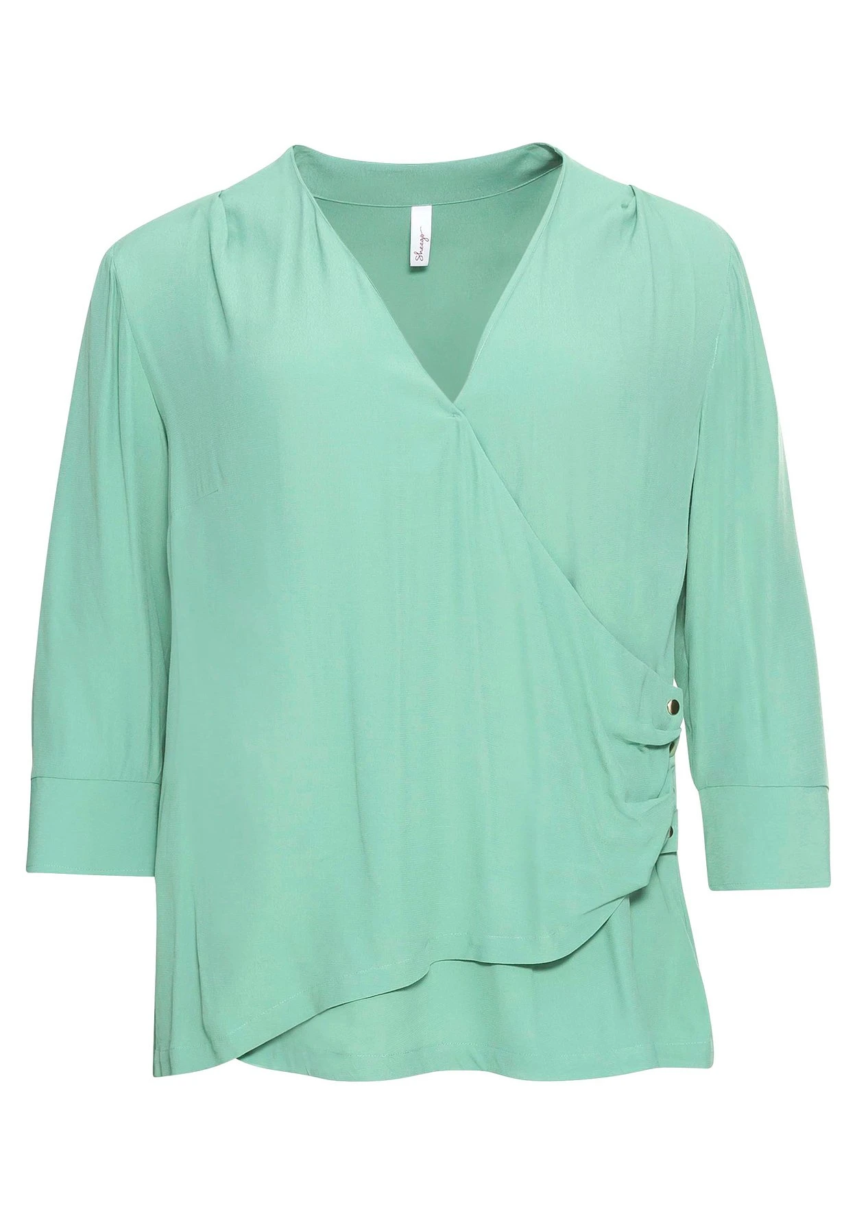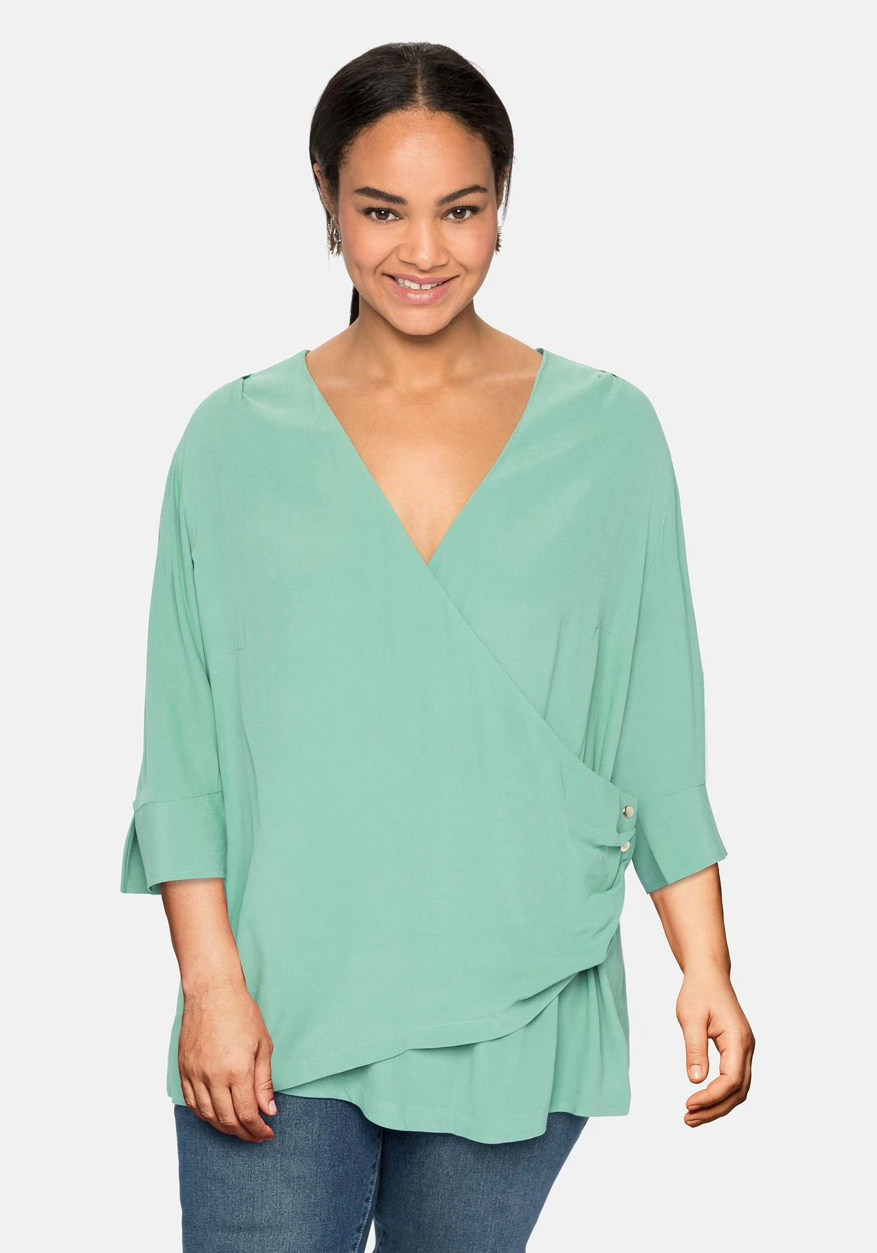 Bluse aus Viskose. Die gewickelte Optik lässt einen tiefen V-Ausschnitt entstehen, als Verschluss dient ein Druckknopf. Die Bluse besitzt einen 3/4-langen Ärmel, der mit Manschette und Schlitz endet.