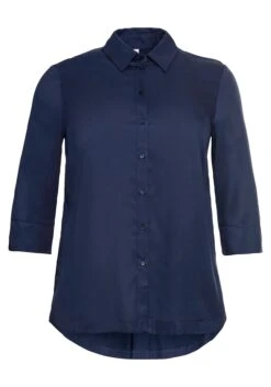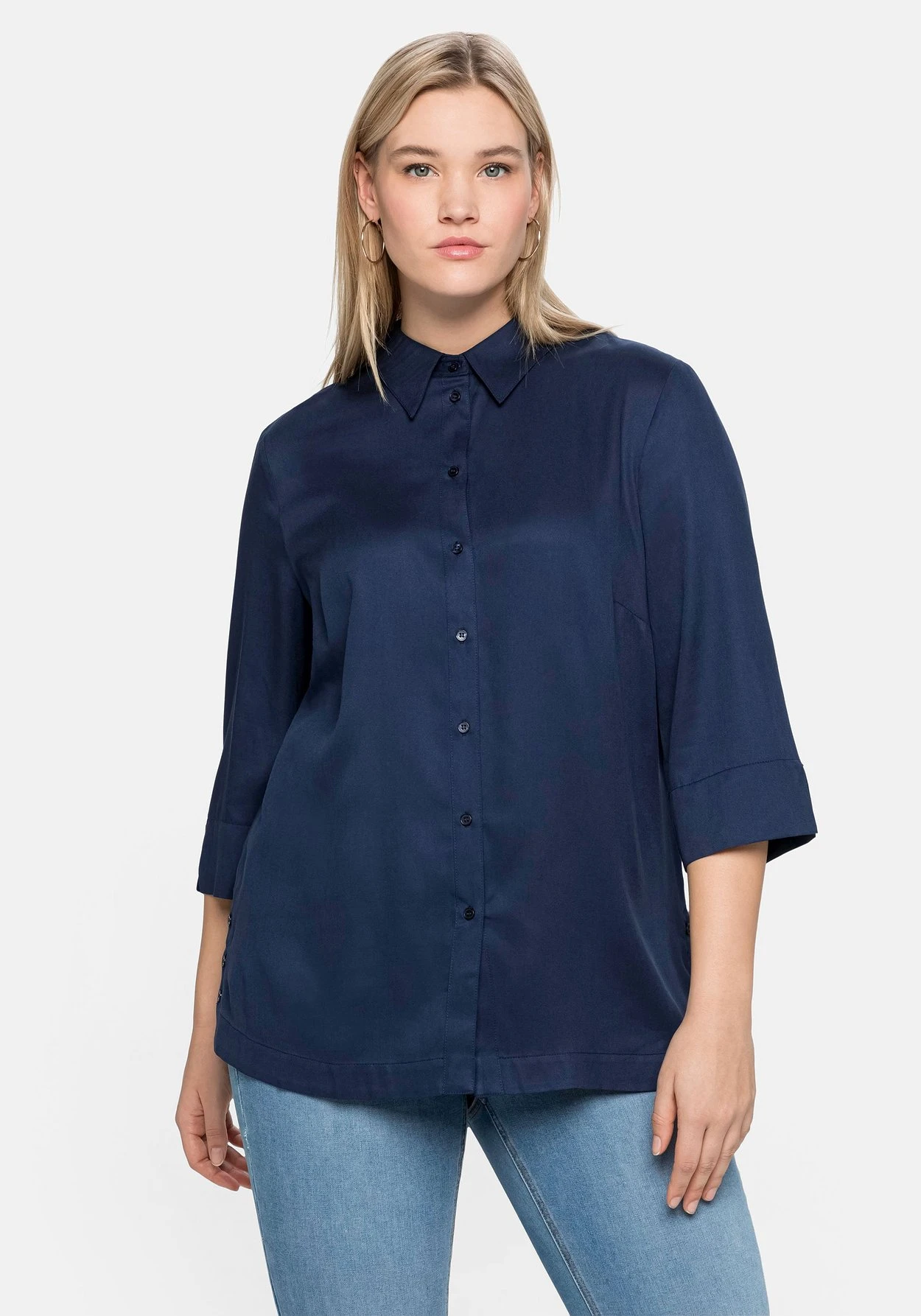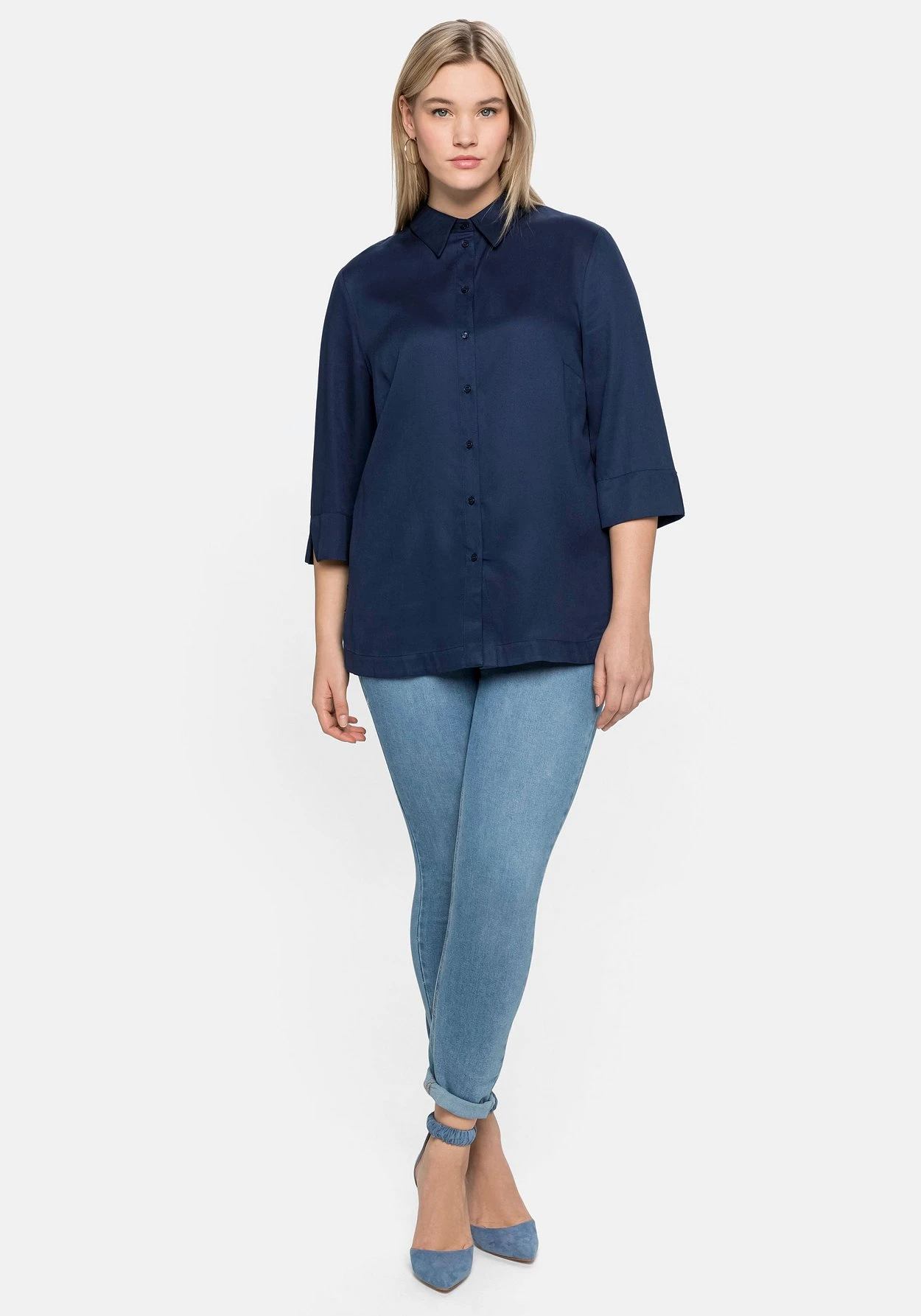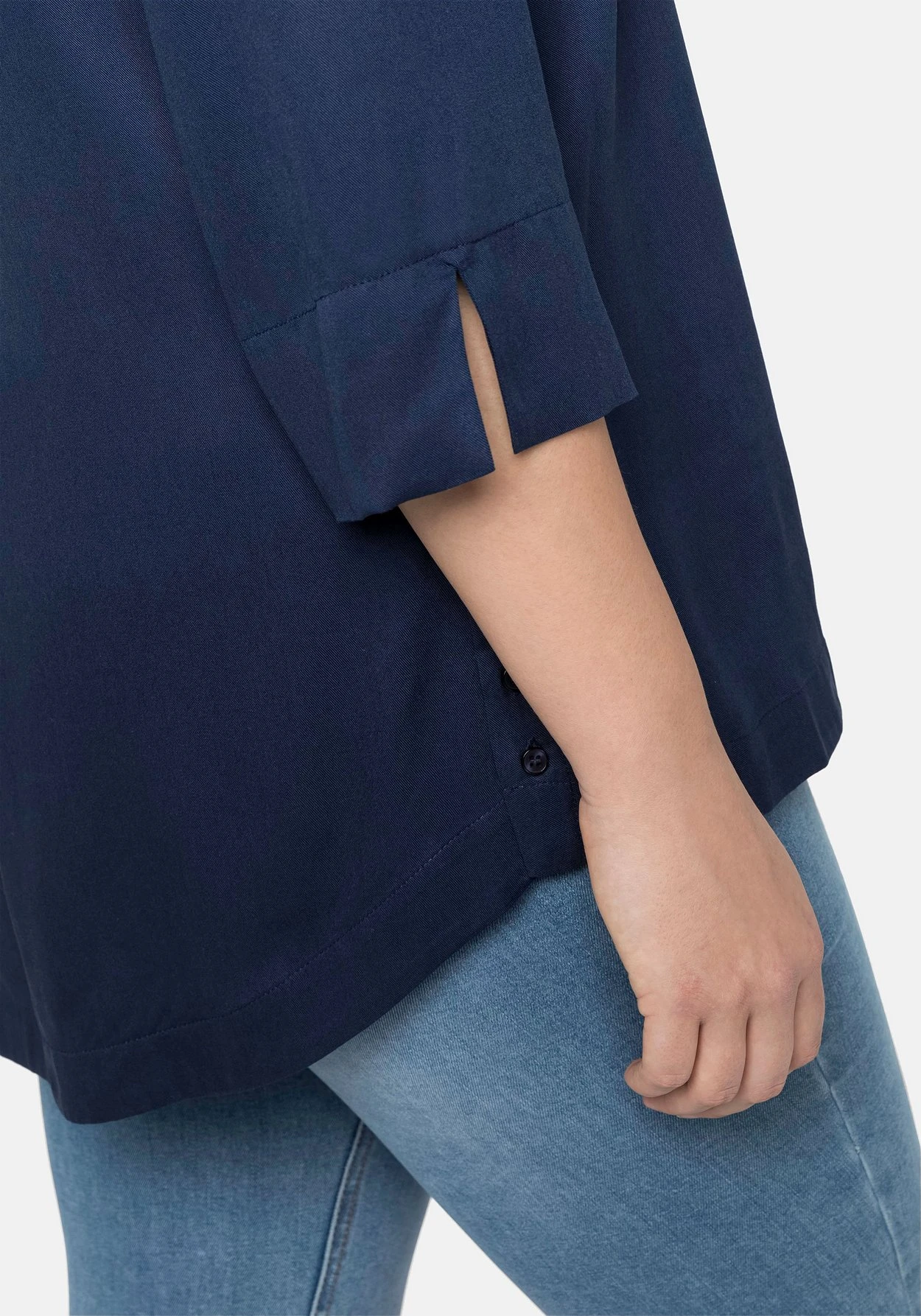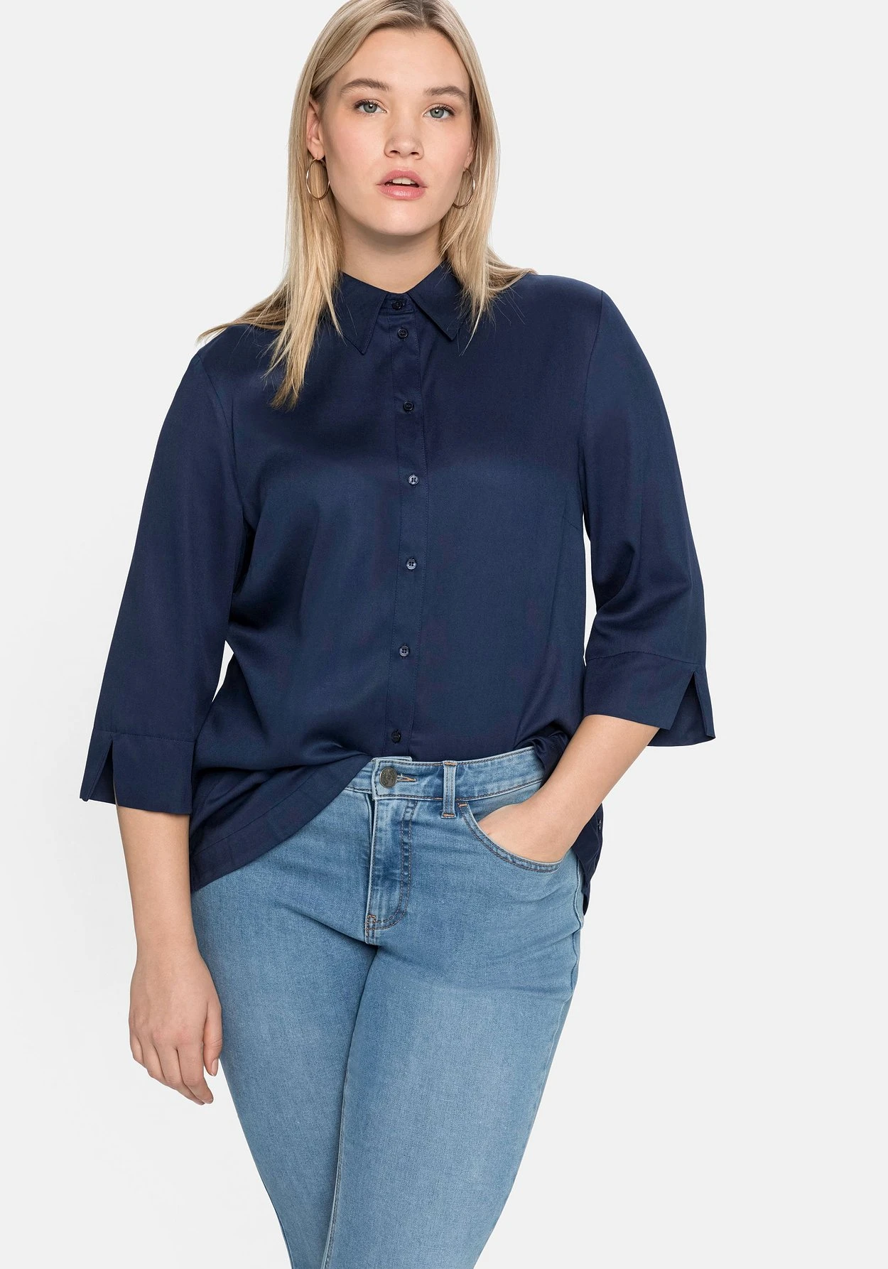 Hemdbluse mit 3/4-Arm. Der klassische Fit ist mit Blusenkragen und durchgehender Knopfleiste gearbeitet. Die 3/4-Ärmel sind bequem geschlitzt, auch seitlich sorgen Schlitze für mehr Bewegungsfreiheit. Hinten ist die Bluse länger geschnitten, eine Kellerfalte gibt ihr modische Weite.