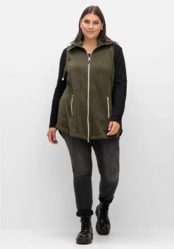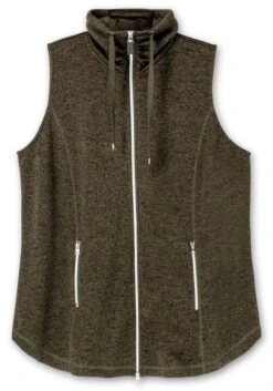 Lange Fleeceweste in leichter A-Linie. Die sportive Weste zeigt sich mit einem hohen Stehkragen und Tunnelzug. Sie ist mit einem Reißverschluss zu schließen, auch die seitlich in der Wienernaht eingesetzten Taschen sind mit Reißverschlüssen gearbeitet. Farblich abgesetzte Teilungsnähte strecken optisch die Figur.