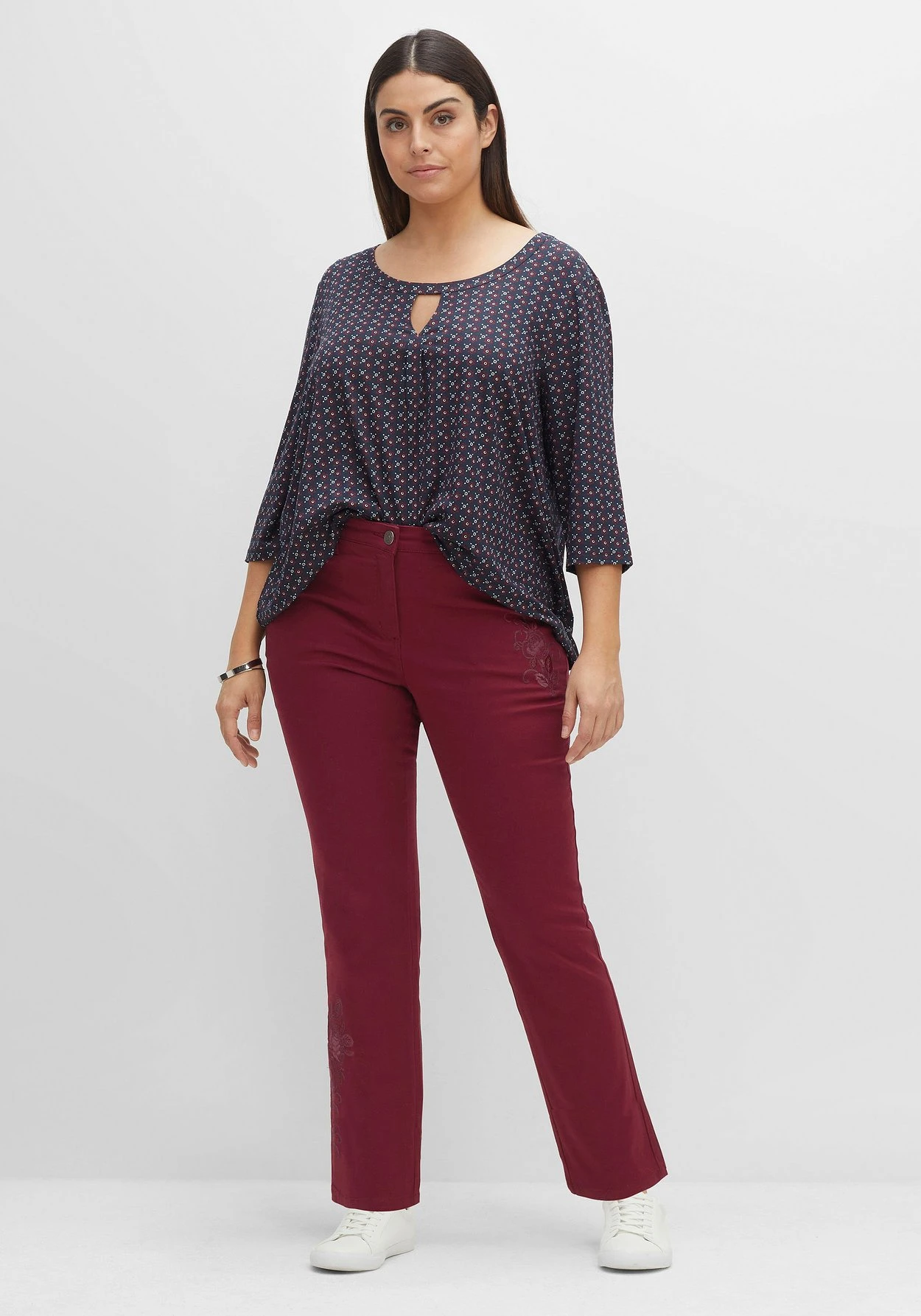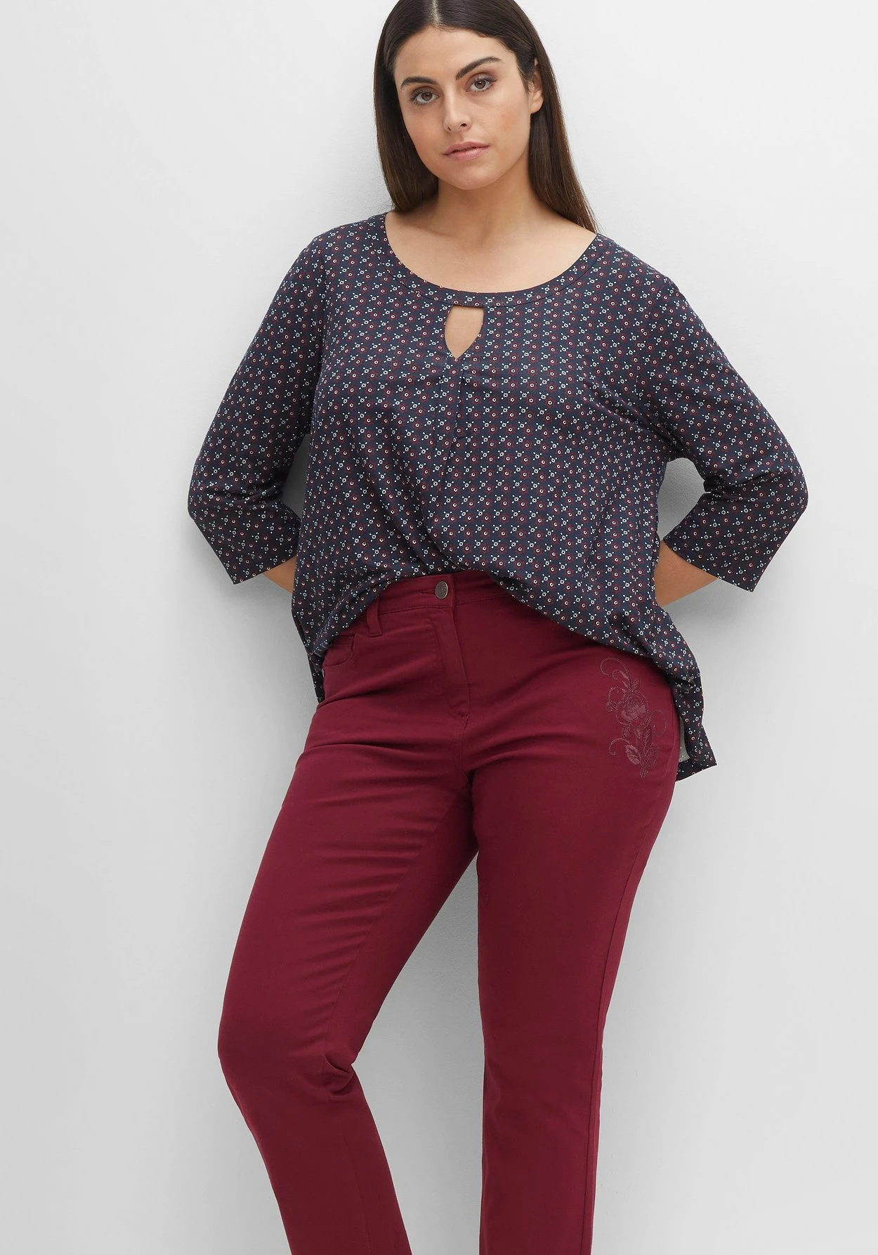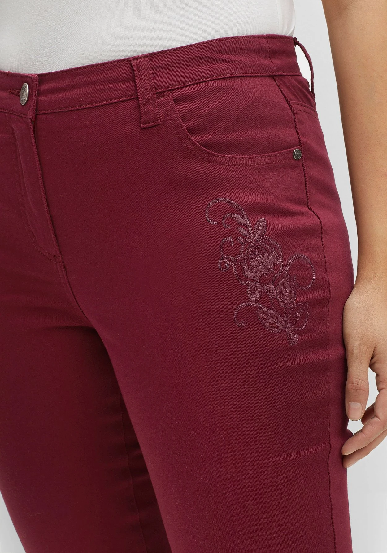 Twillhose im geraden Schnitt. Farblich harmonisch abgestimmte Blumenstickereien schmĂĽcken Oberschenkel und Beinabschluss und verleihen der Hose so eine feminine Note. Ansonsten zeigt sich der Fit sehr klassisch mit fĂĽnf Taschen sowie GĂĽrtelschlaufen am Formbund.