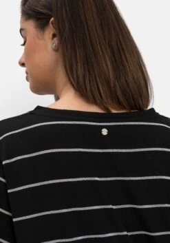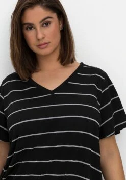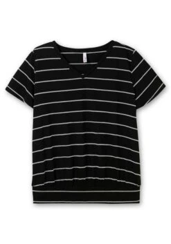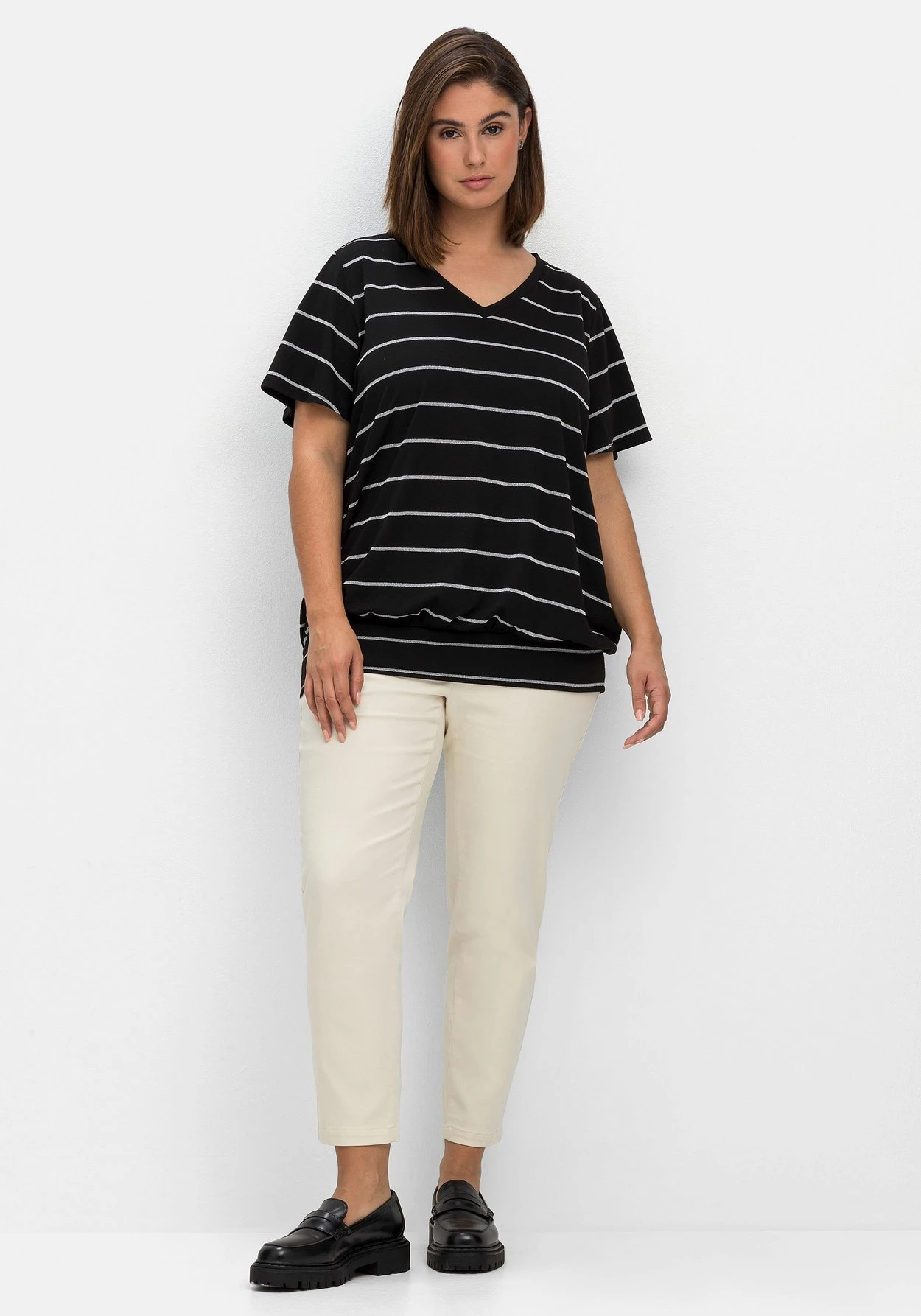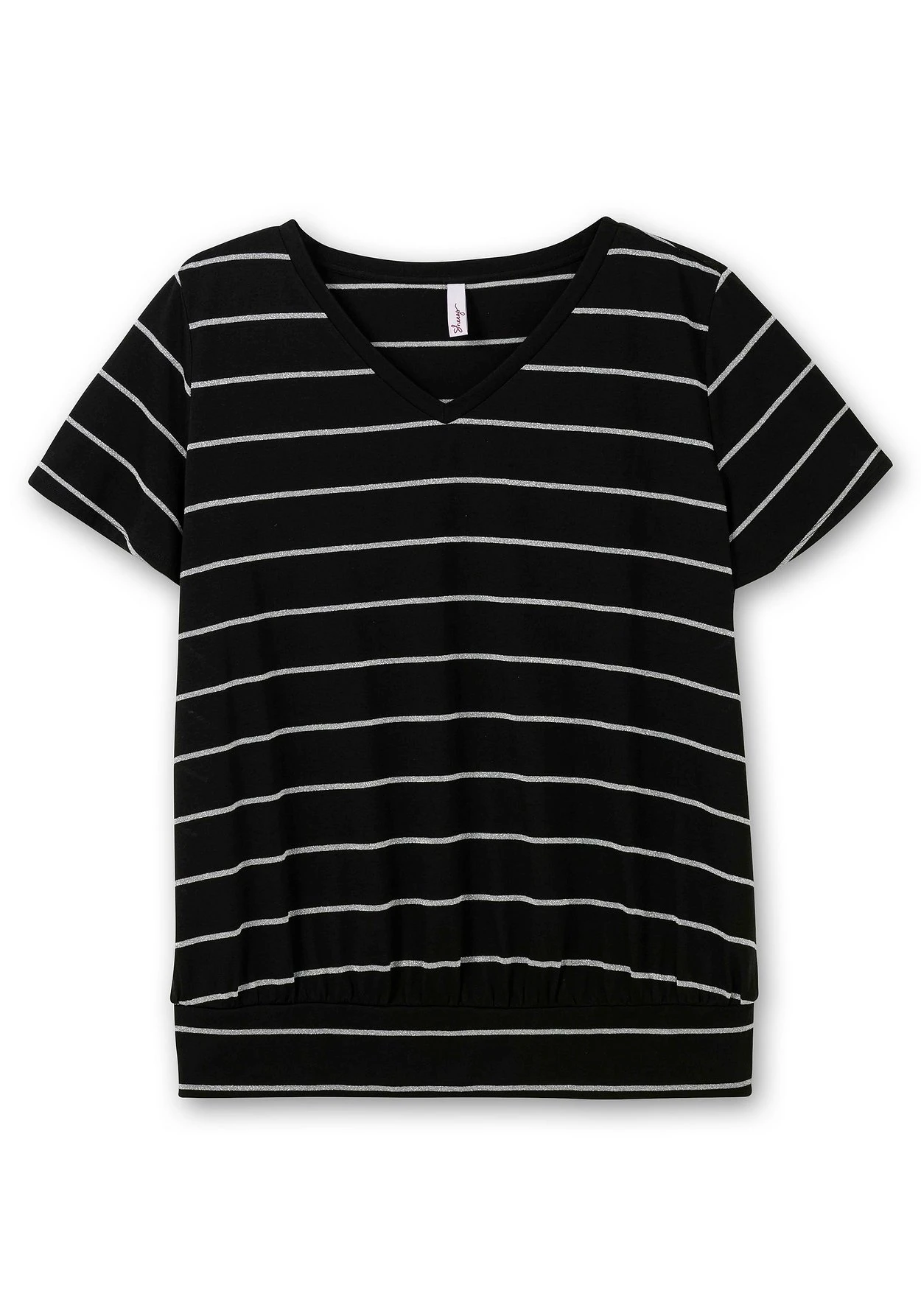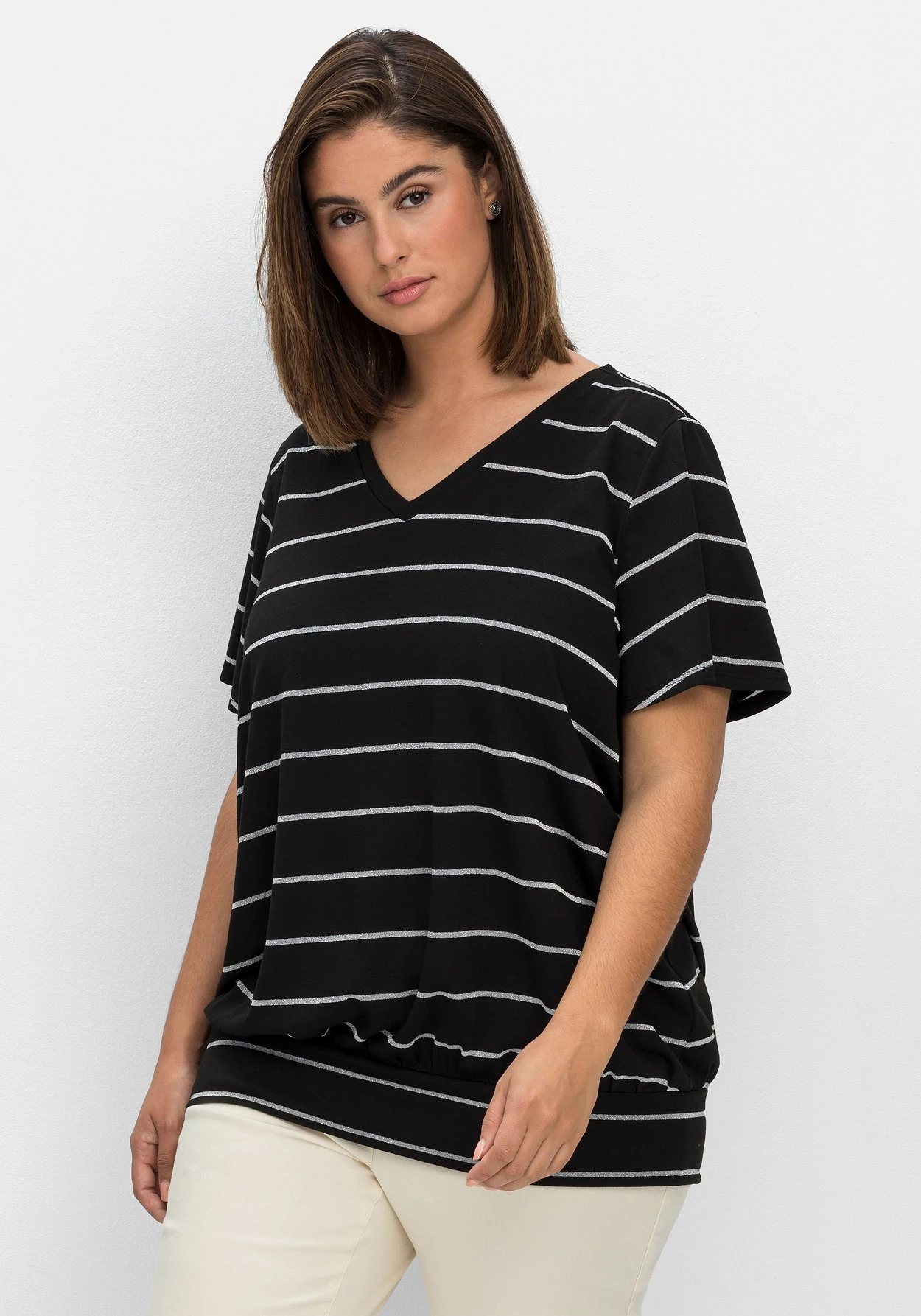 Shirt mit V-Ausschnitt und garngefärbten Ringeln. Der lässige Look erhält durch das eingearbeitete Glitzergarn an den Streifen eine dezent glamouröse Note. Für Bequemlichkeit sorgt der breite Saumbund, die kleinen Kräuselungen oberhalb des Saums verleihen der Bauchpartie entspannte Weite. Kurze Flügelärmelchen sind eine feminine Ergänzung.