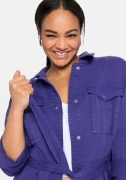 Blusenjacke aus Denim. Der Hemdkragen, die aufgesetzten Pattentaschen auf Brusthöhe und die Ärmelbündchen mit Druckknopfverschluss sind typische Stilelemente. Mit dem Gürtel kann die etwas längere geschnittene Jeansjacke auf Taille gebracht werden. Hochgekrempelte Ärmel bringen mehr Lässigkeit in den Style, die leichte Waschung sorgt für Modernität.