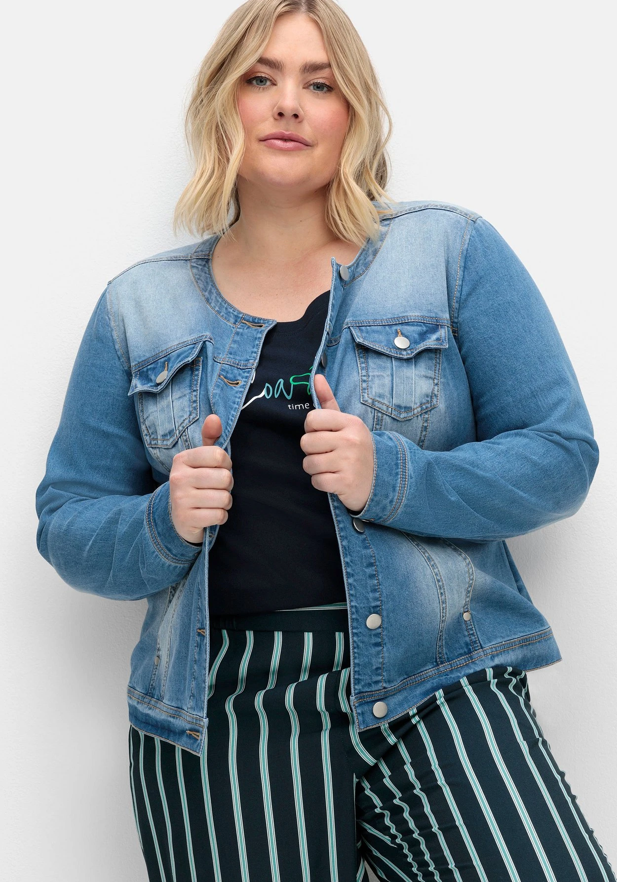 Jeansjacke in verkürzter, taillierter Form. Ohne Kragen und mit individueller Waschung erhält die Jacke eine moderne Optik. Ansonsten ist sie klassisch mit durchgehender Knopfleiste und zwei Brusttaschen gearbeitet, zwei seitliche Eingrifftaschen dienen als praktische Ergänzung. Markante Nähte strecken die Silhouette und schmeicheln so der Figur. Als Finish dienen die weitenverstellbaren Riegel am Saum.