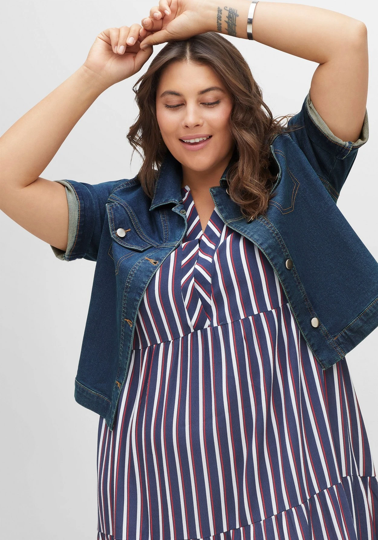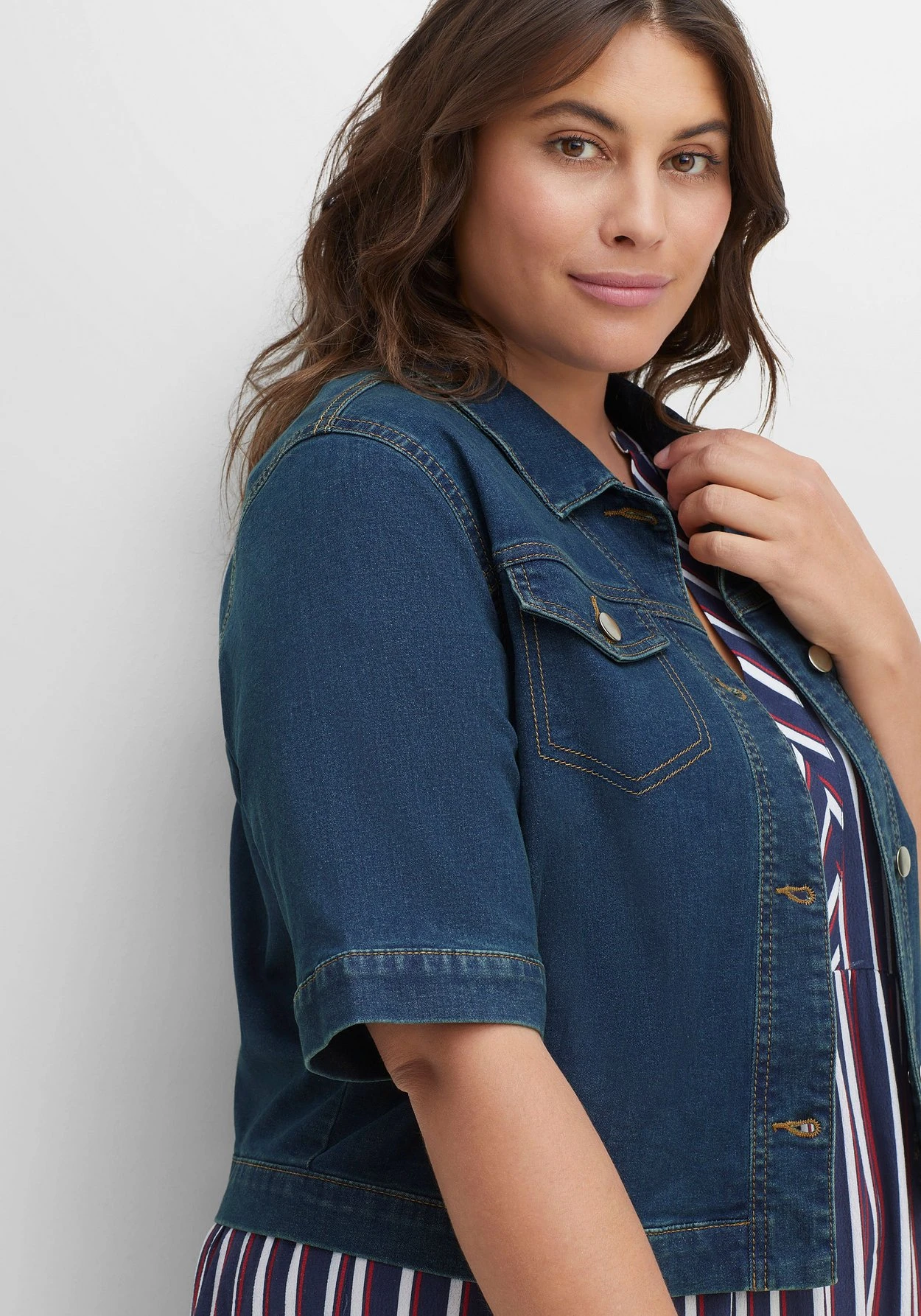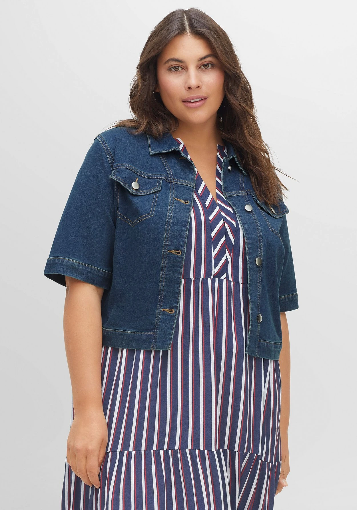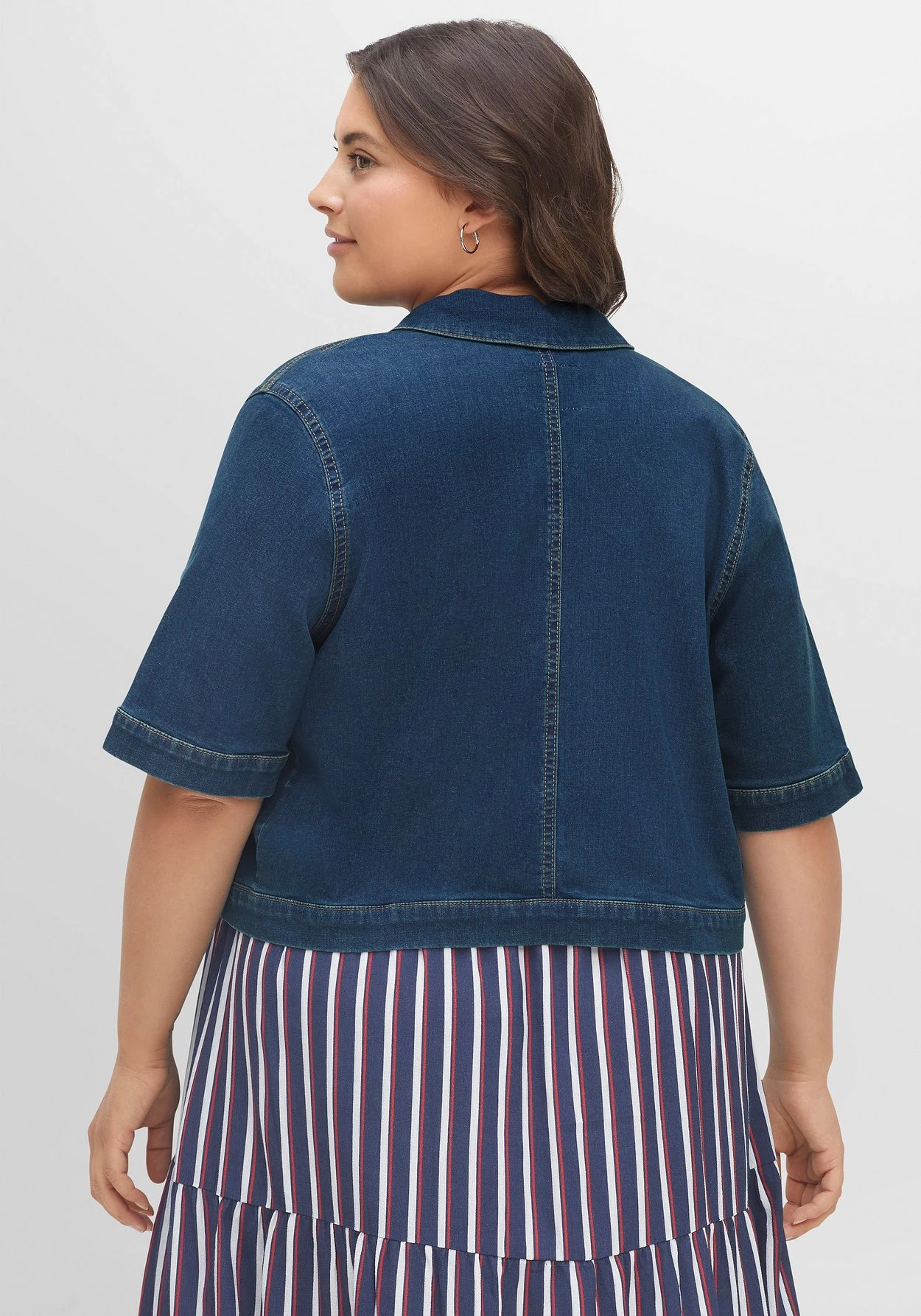 Jeansjacke in individueller Waschung. Mit etwas länger geschnittenen Halbarmen und der kurzen, kastigen Form lässt die Jacke eine sommerliche und zugleicht sehr moderne Optik entstehen. Dazu kommen markante Kontrastnähte, dekorative Zierbrusttaschen, eine Knopfleiste sowie der klassische Umlegekragen.