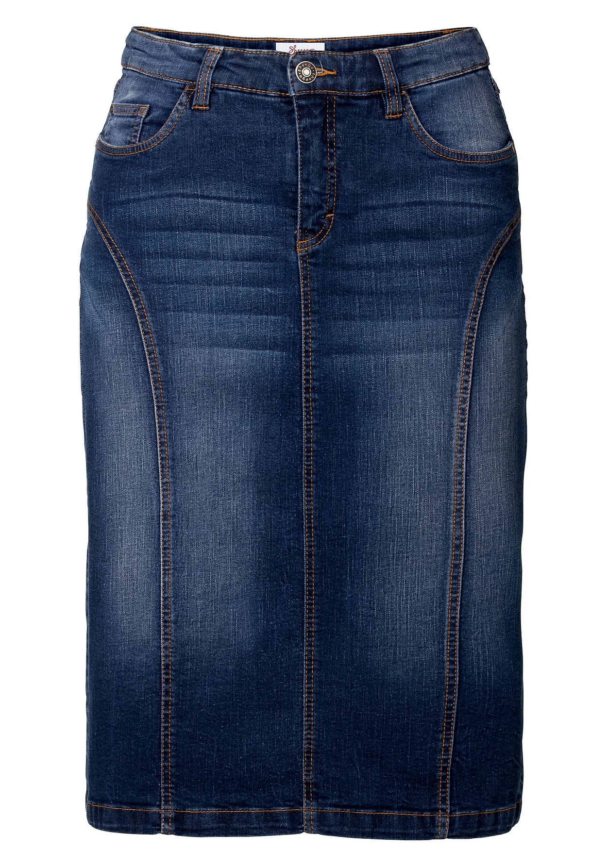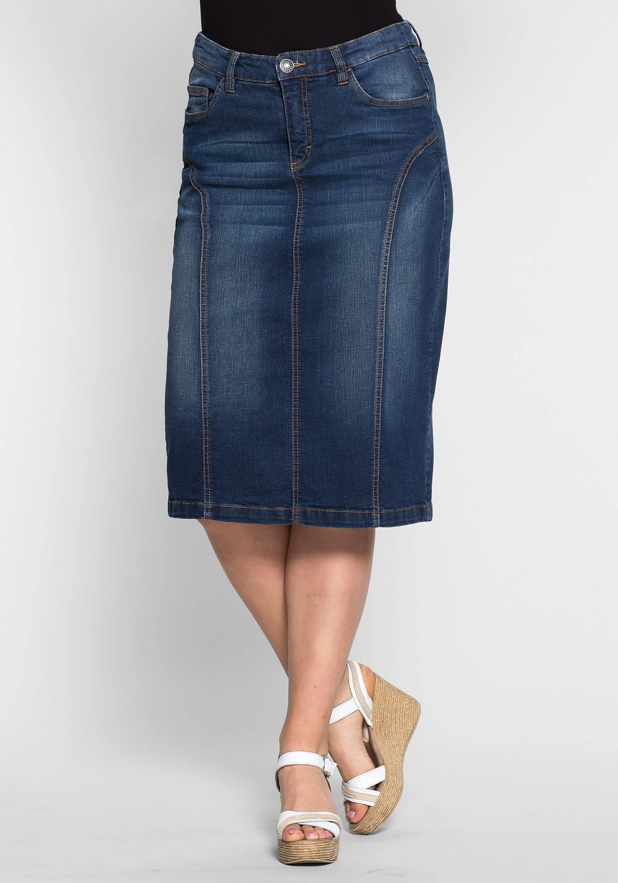 Der gerade geschnittene 5-Pocket-Jeansrock präsentiert sich in besonders vorteilhaftem Schnitt: Die kniebedeckende Länge schmeichelt den Beinen, die elastische Qualität bringt Kurven toll zur Geltung.