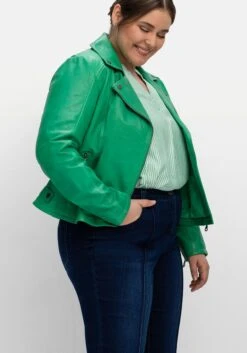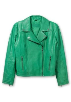 Kurze Lederjacke im Biker-Stil. Die typischen Stilelemente wie der Reverskragen mit Zier-Druckknöpfen, der asymmetrisch versetzte Reißverschluss, die schrägen Zipper-Taschen sowie die Reißverschlüsse am Ärmelabschluss sind charakteristisch für den zeitlosen Look. Der Riegel mit Knopf dient als Finish am Saumabschluss.