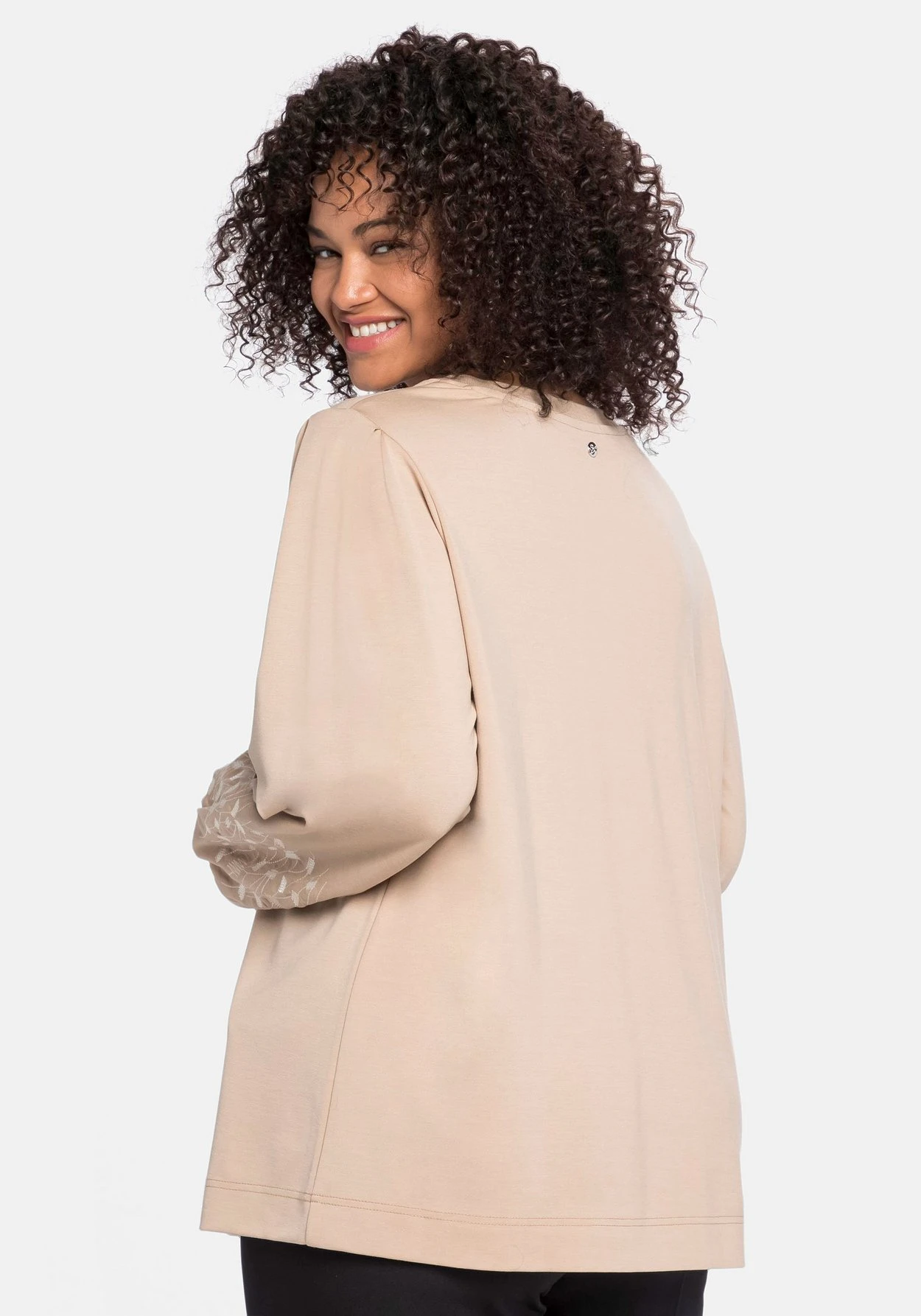 Langarmshirt mit Rundhalsausschnitt. Die zarten Stickereien an den Ärmeln geben ihm einen femininen Look. Dazu setzen die Rippbündchen einen sportiven Kontrast.
