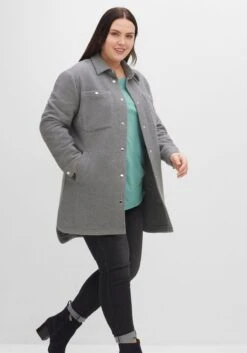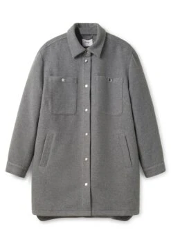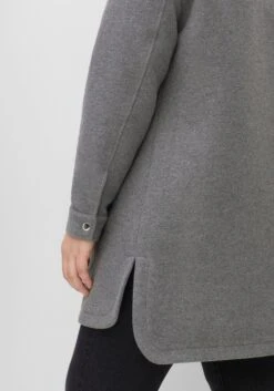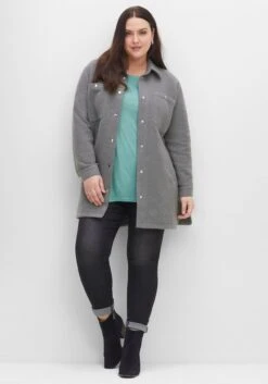 Shacket in Longform. Im sportiven Hemdblusenstil gehalten, definiert sich die modische Jacke durch einen Umlegekragen, Brusttaschen und Ärmelmanschetten. Sie ist mit einer Druckknopfleiste gearbeitet, auch an den Manschetten der Ärmel und auf den Brusttaschen fallen Druckknöpfe ins Auge. Seitliche Schlitze geben mehr Bewegungsfreiheit, die abgerundeten Kanten wirken weich und harmonisch.