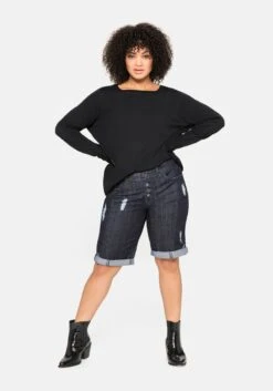 Der Pullover ist etwas länger, gerade und figurumspielend geschnitten.