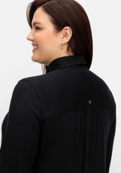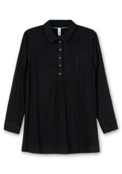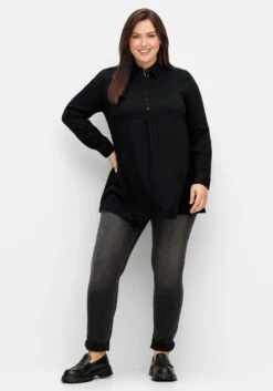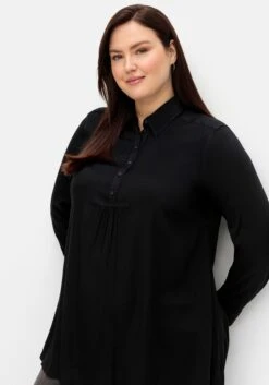 Longtunika in A-Linie. Dieses Oberteil wird durch einen Hemdblusenkragen mit Knopfleiste und Dekotape verziert. Eine Passe im Rücken lässt eine gepflegte Optik entstehen. Die langen Ärmel schließen mit Manschetten und Knöpfen ab.