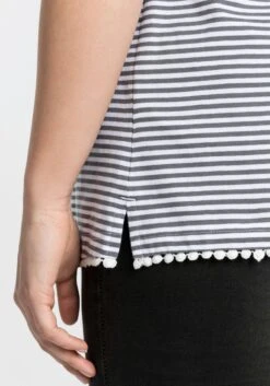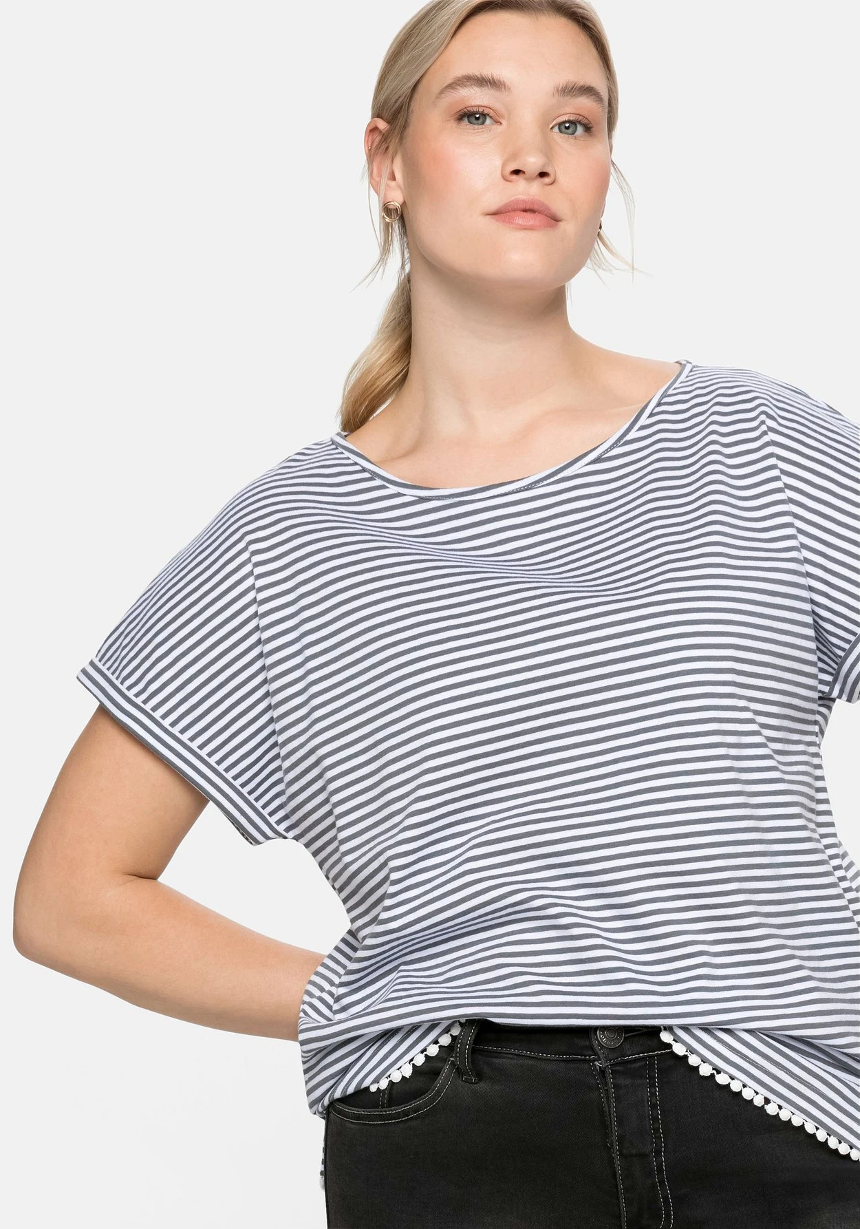 Ringelshirt mit höher geschnittenem Rundhalsausschnitt. Die feinen garngefärbten Ringel sorgen für den Frischekick und unterstreichen den maritimen Stil. Überschnittene Schultern bringen zusätzliche Lässigkeit, konträr verlaufende Streifen am fixierten Ärmelaufschlag sowie am Ausschnitt brechen den Look modisch auf. Eine Dekokante am Saumabschluss rundet den sportiven Look feminin ab.
