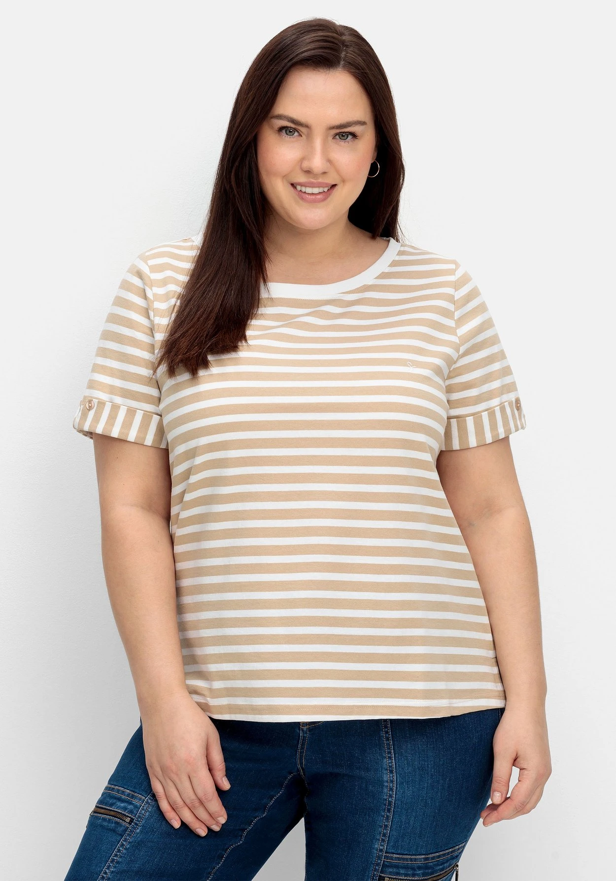 Die Jerseyqualität besteht aus recycelter Baumwolle und recyceltem Polyester. sheego cares!