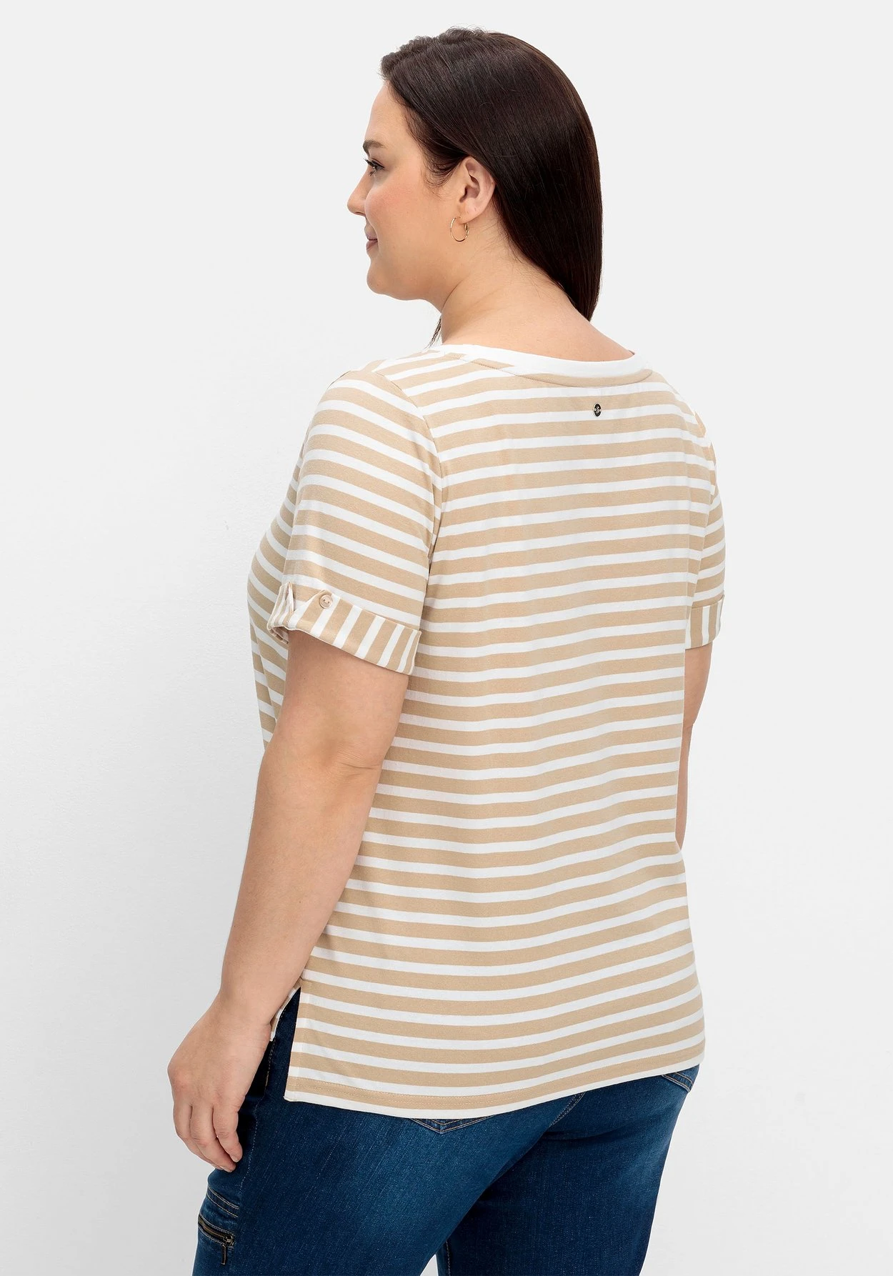 Shirt mit garngefärbten Ringeln. Der unifarbene Rundhalsausschnitt und die senkrecht verlaufenden Streifen am Ärmelsaum geben dem Muster Lebendigkeit. Als sportives Finish dient der mit Schlitz und Knopf gearbeitete fixierte Ärmelaufschlag.