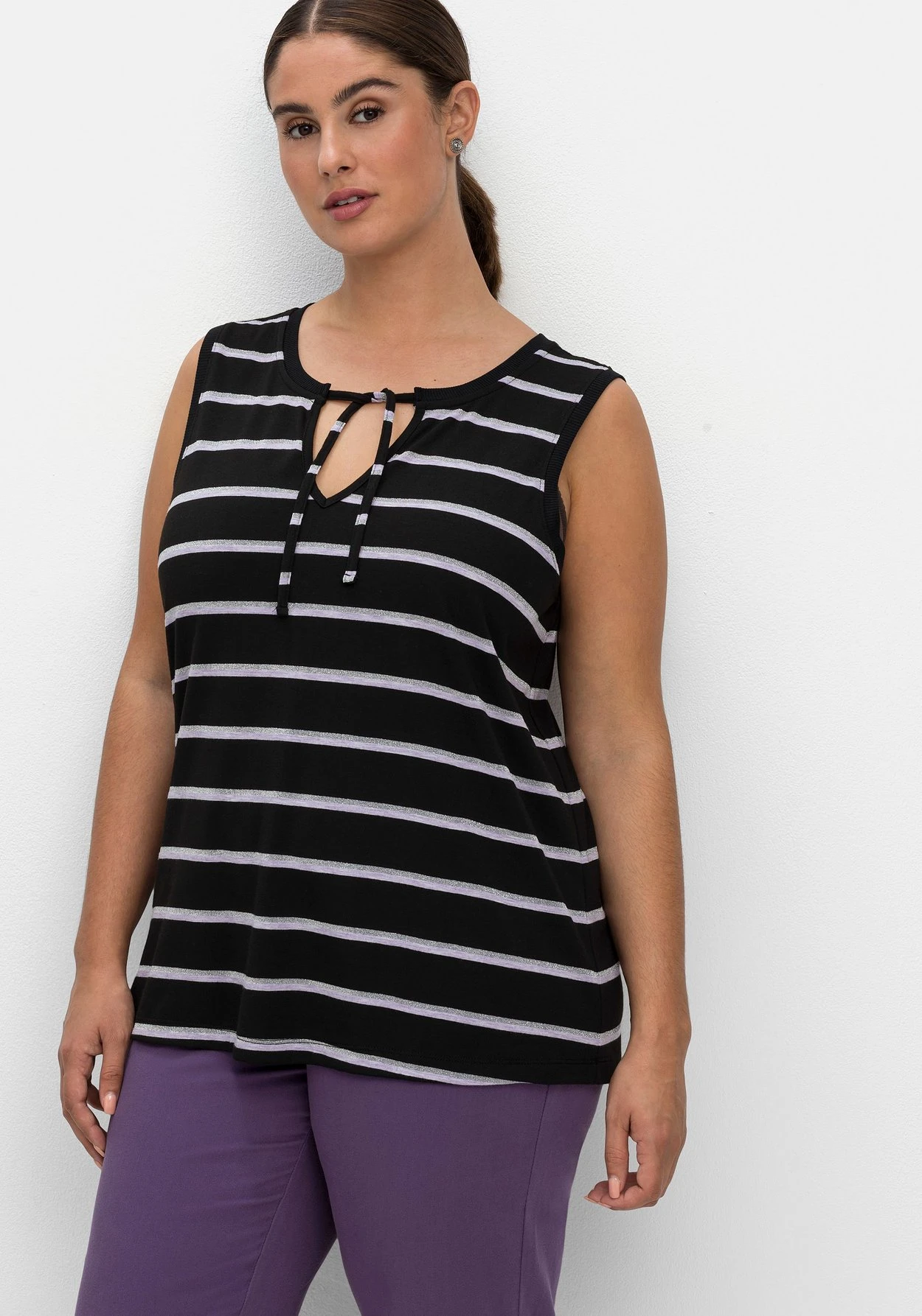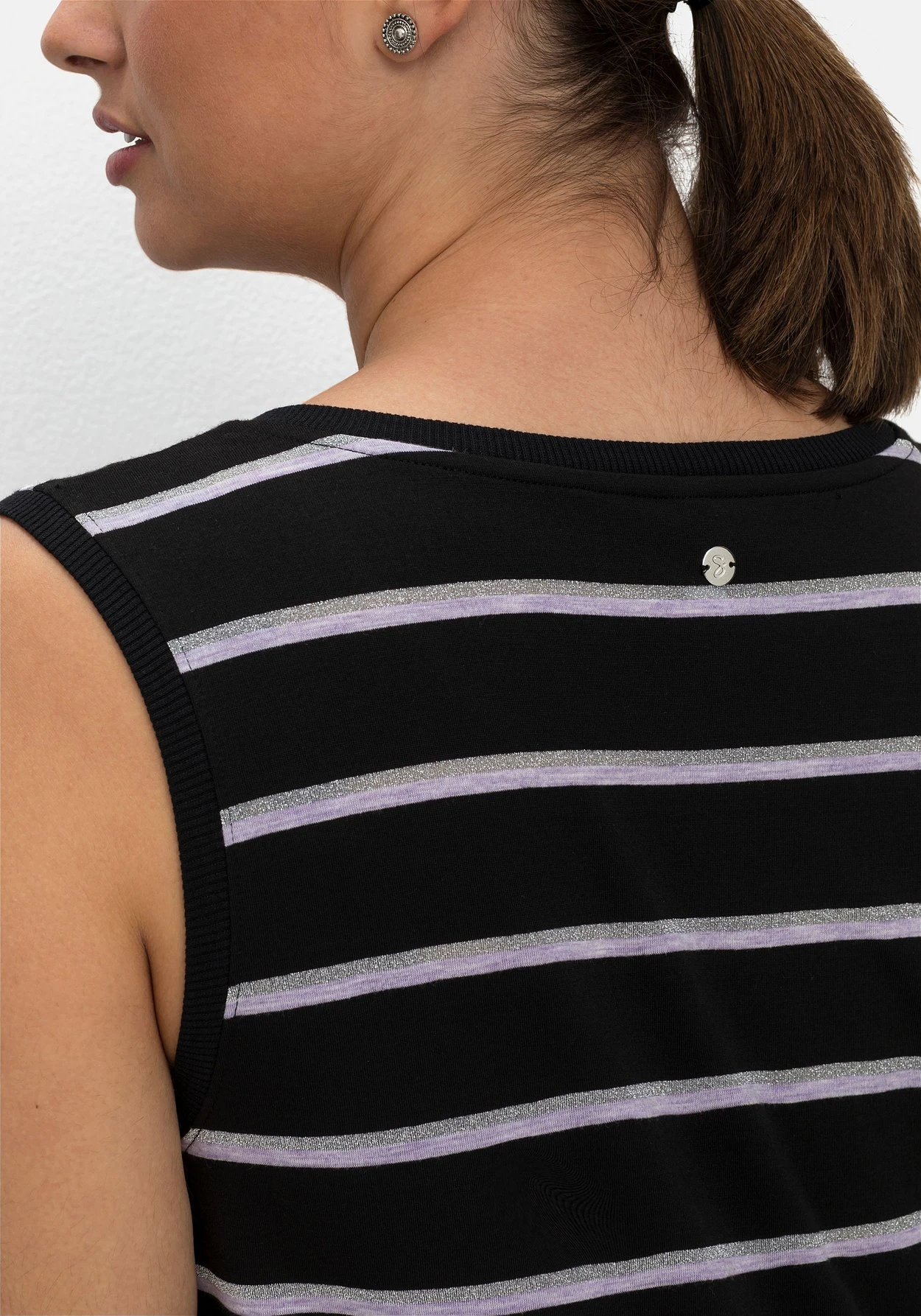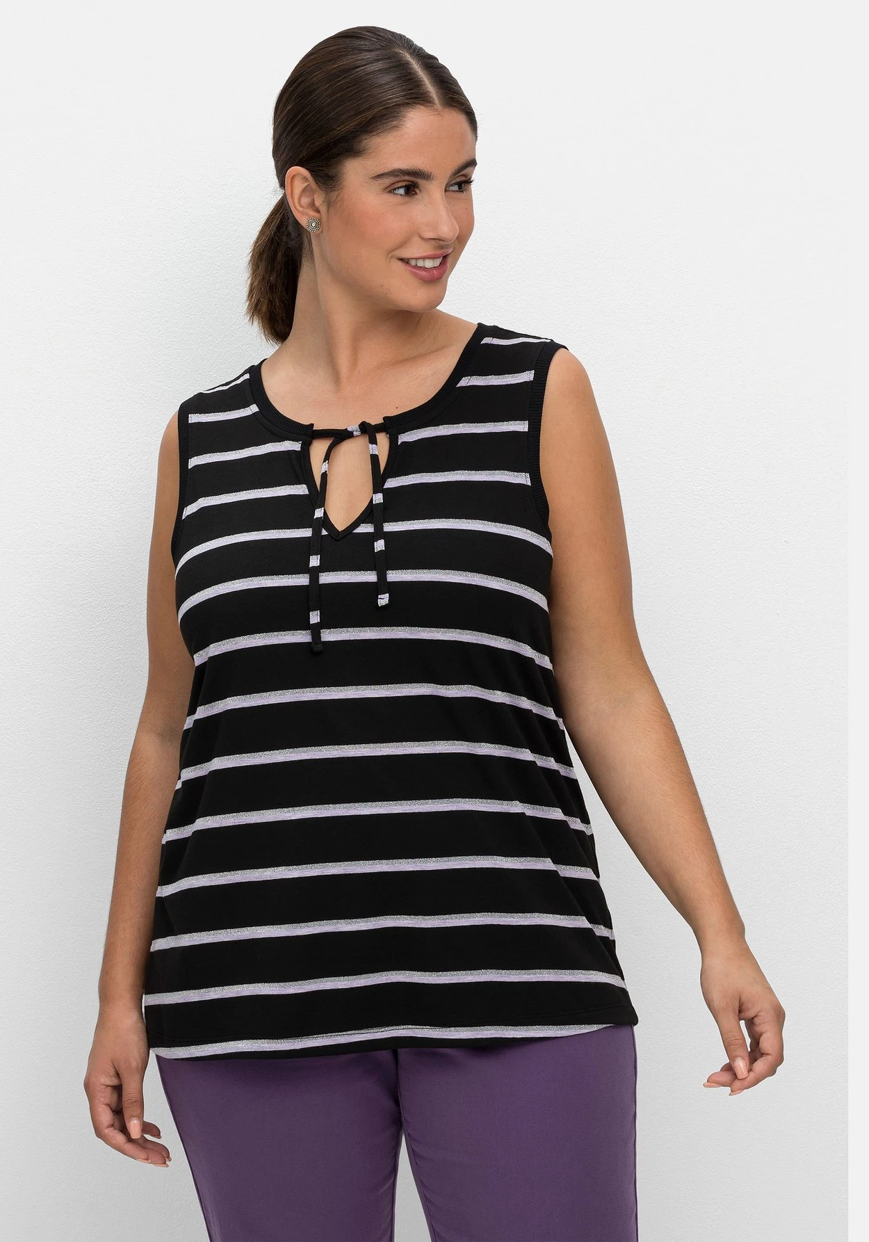 Top mit garngefärbten Ringeln. Das silberfarbene Glitzergarn sorgt hier für den dezenten Glamour-Effekt. Der Rundhalsausschnitt wird durch einen V-förmigen Schlitz mit Bindeband feminin betont. Rippblenden geben dem Look ein gepflegtes Finish.