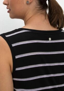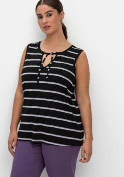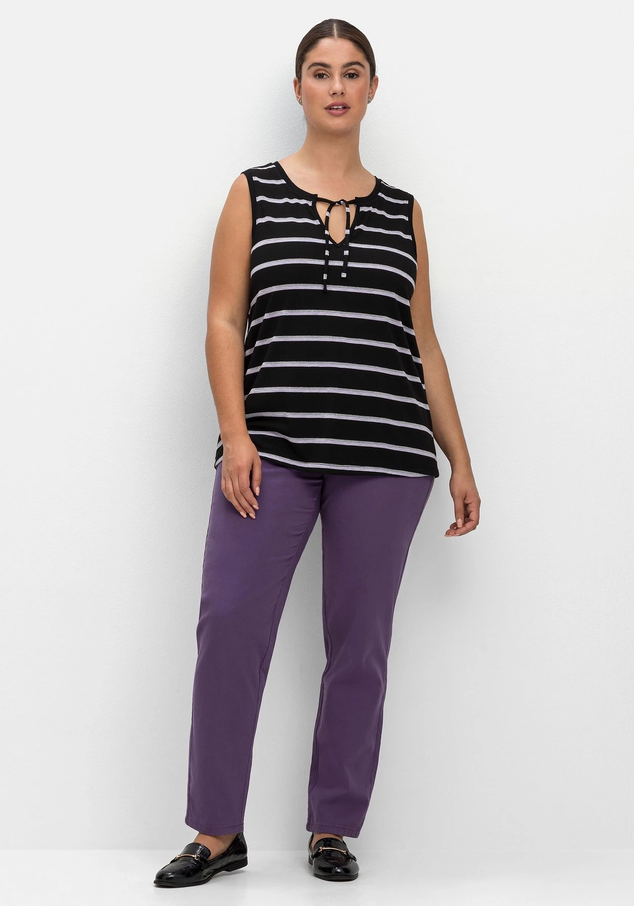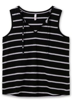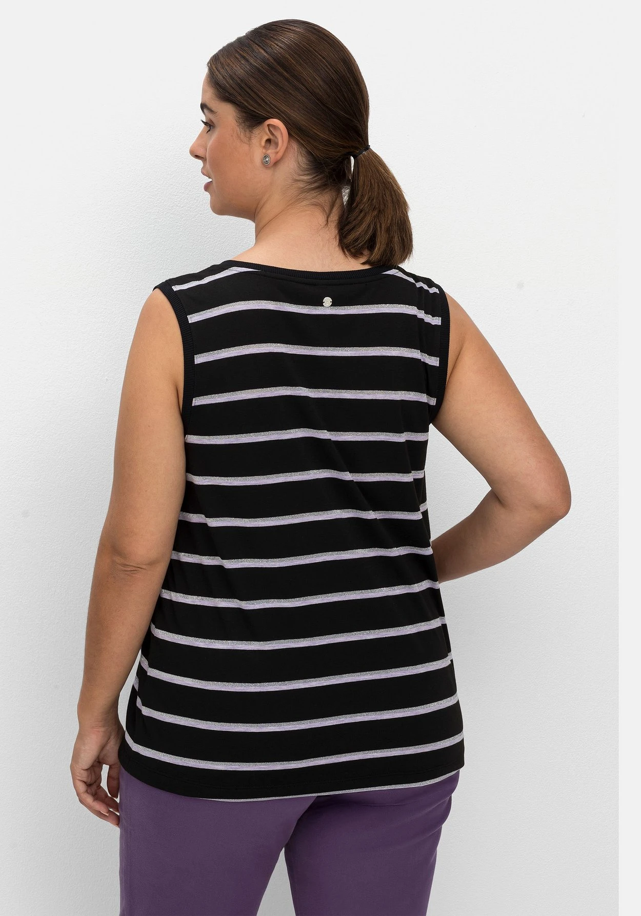 Top mit garngefärbten Ringeln. Das silberfarbene Glitzergarn sorgt hier für den dezenten Glamour-Effekt. Der Rundhalsausschnitt wird durch einen V-förmigen Schlitz mit Bindeband feminin betont. Rippblenden geben dem Look ein gepflegtes Finish.