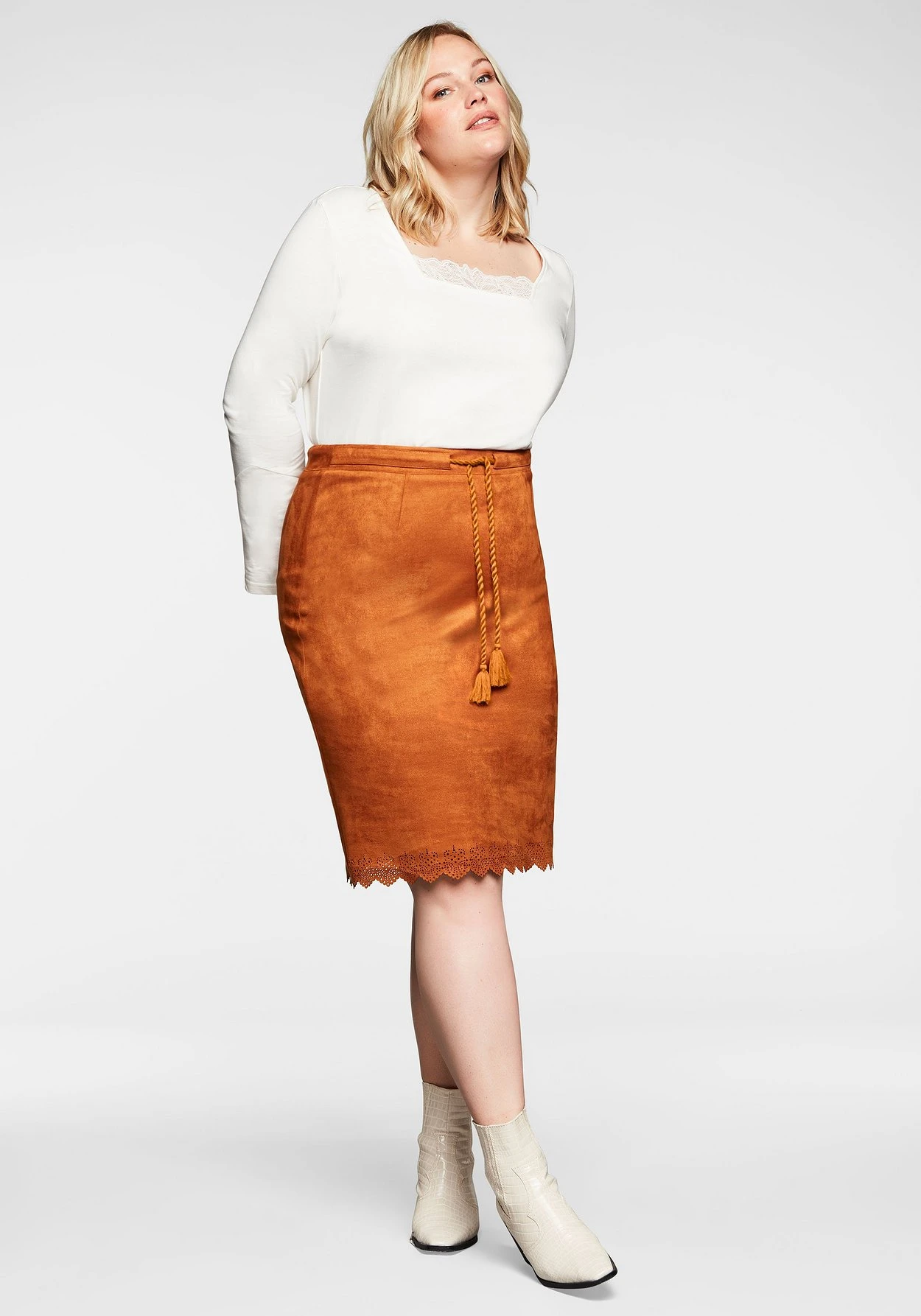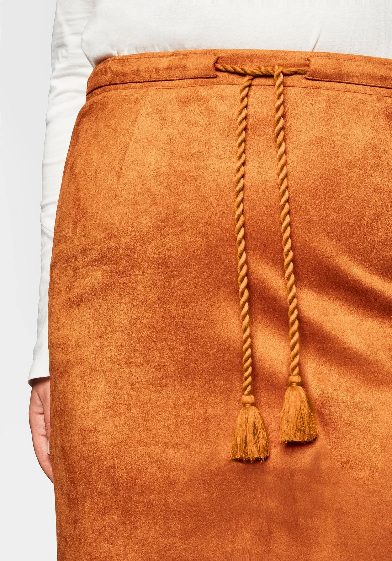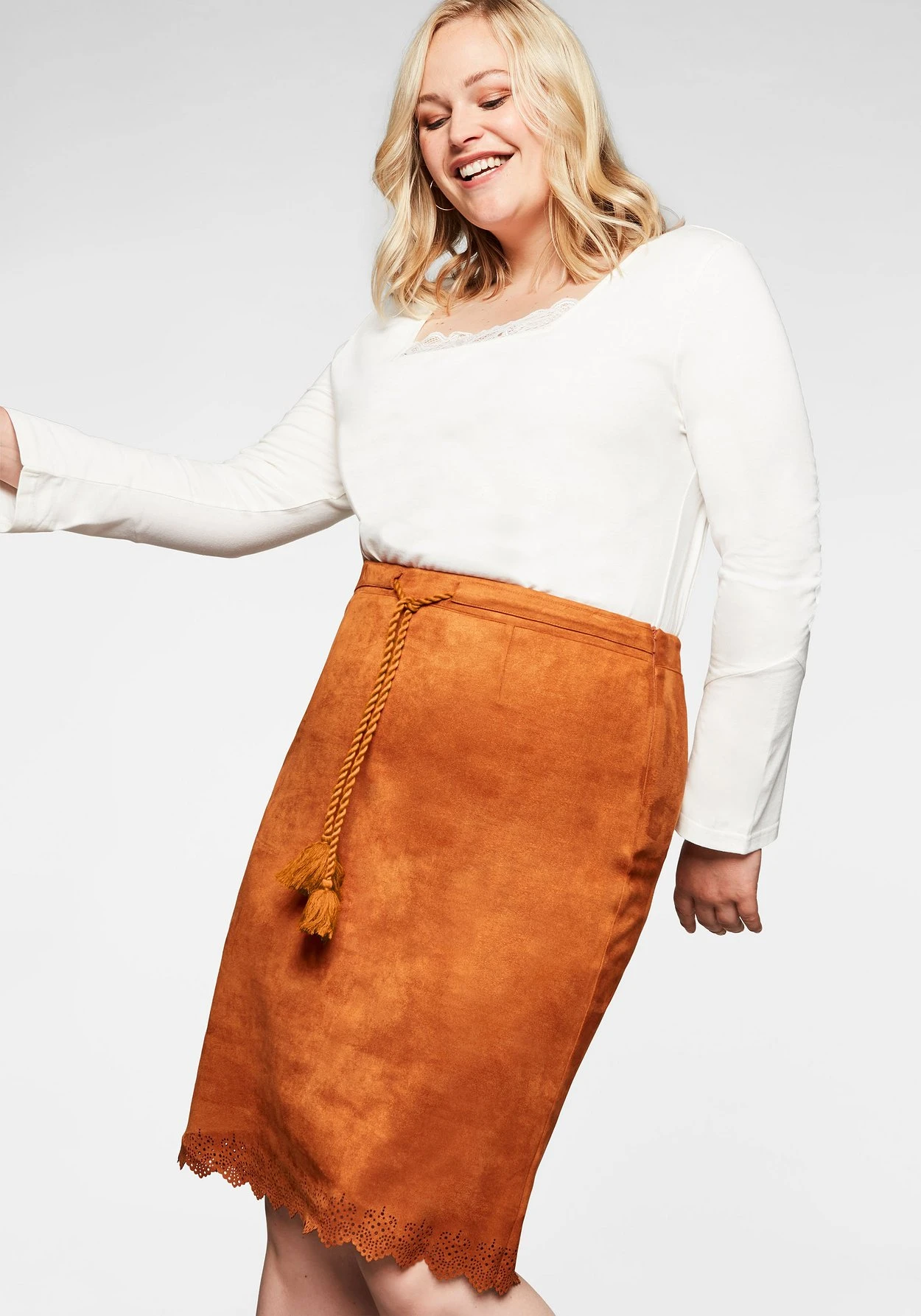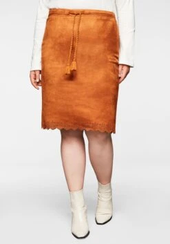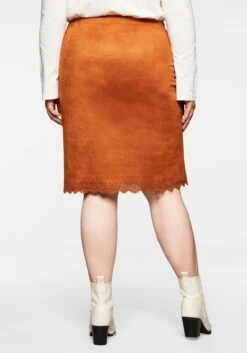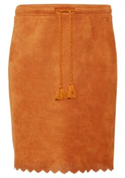 Rock in Veloursleder-Optik. Die Wellensaumkante mit Lasercut am Saum bricht den Look feminin auf, als verspieltes Finish dient das Bindeband in der Taille. Zu schließen ist der Rock durch den Reißverschluss in der Seitennaht.