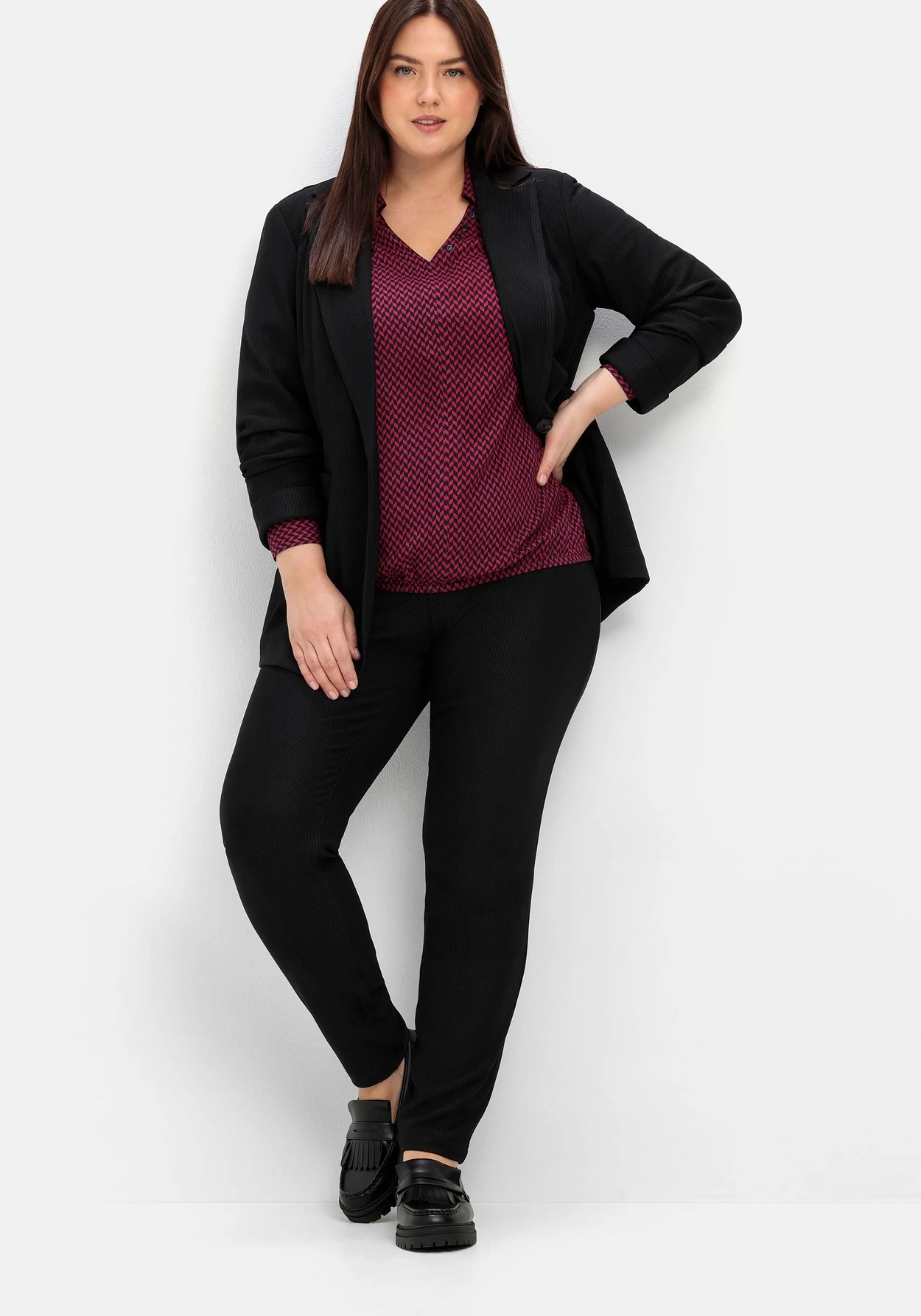 Schmale Hose in Ottoman-Rippe. Die Längsstruktur verleiht der Hose eine figurschmeichelnde Optik, der elastische Bund trägt sich durch den innenliegenden Gummizug besonders komfortabel. So entsteht ein gepflegter und zugleich bequemer Look, der im Alltag genauso passt wie im Büro.