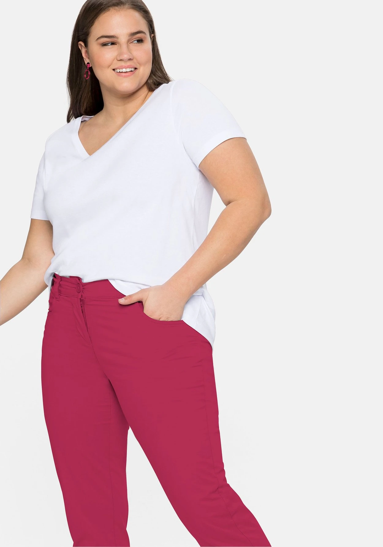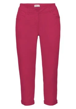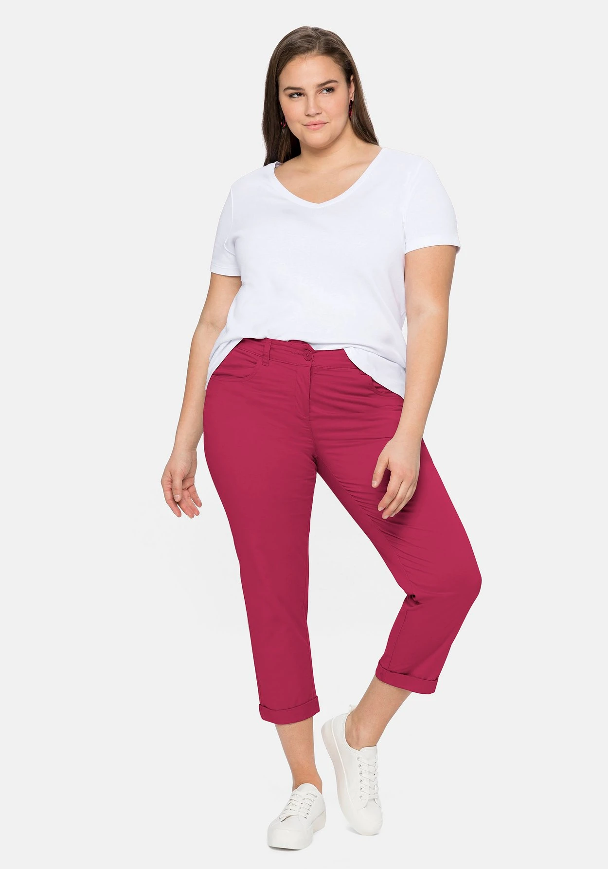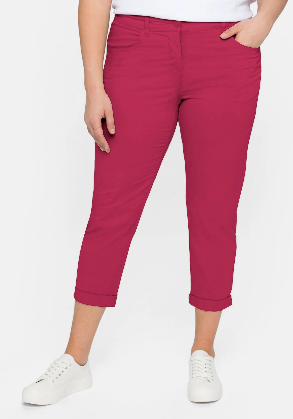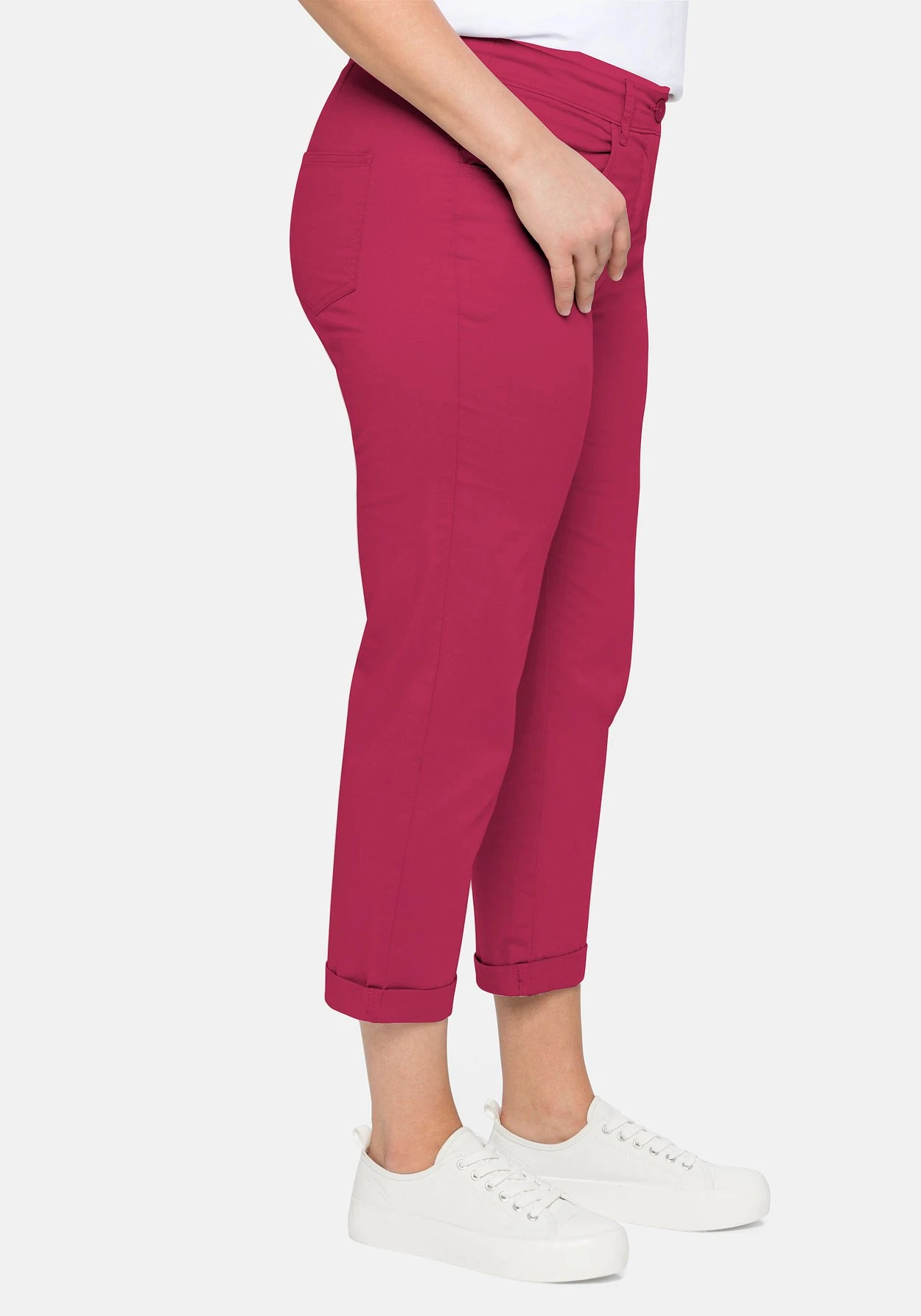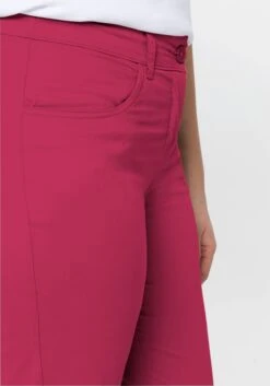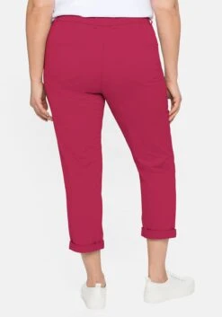 Die schmale Hose kommt in modischer 7/8-Länge. Sie hat eine normale Leibhöhe und einen fixierten Umschlag am Beinabschluss. Vorn befinden sich zwei Eingrifftaschen und hinten zwei Gesäßtaschen. Mit Reißverschluss und zwei Knöpfen zu schließen.