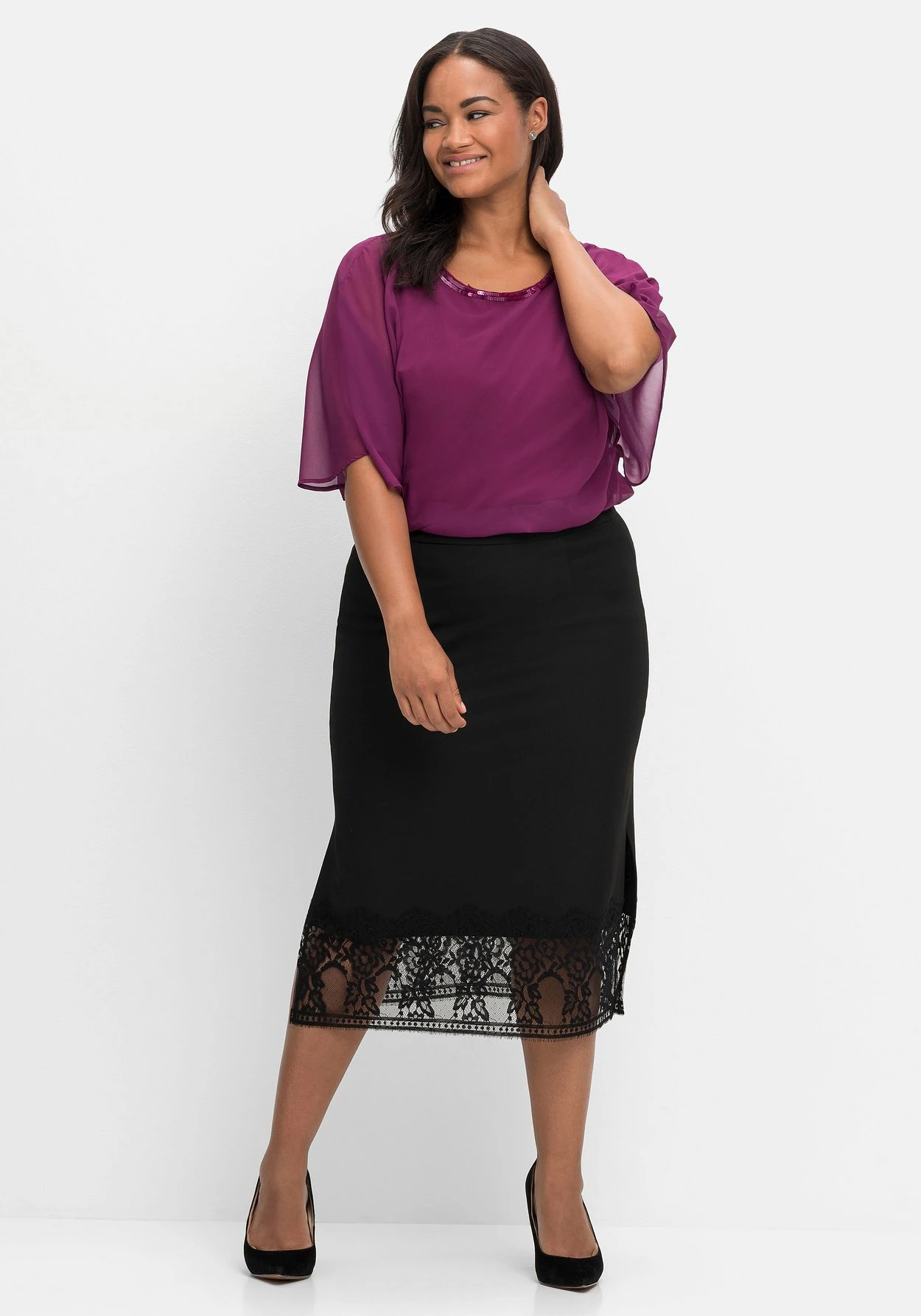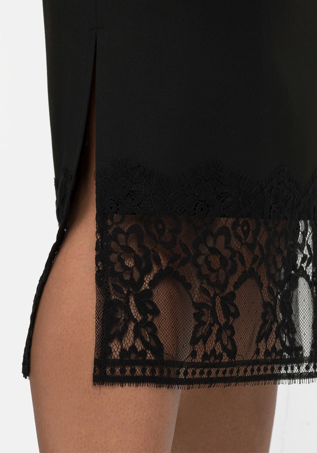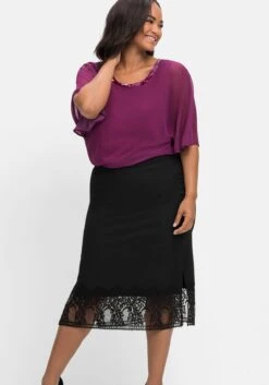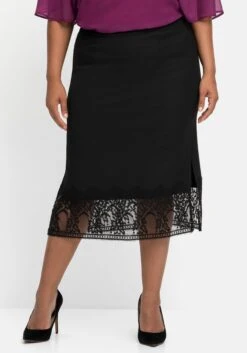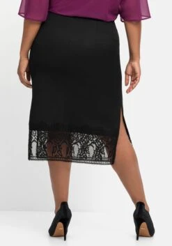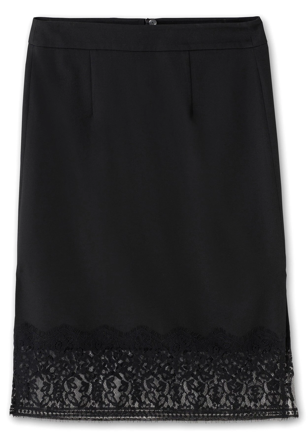 Pencilskirt mit Spitze. Für feminine Eleganz sorgt das breite Band aus zarter Spitze am Saum. Der ansonsten sehr schlicht gehaltene Schnitt zeigt sich mit hohen seitlichen Schlitzen sowie einem Reißverschluss mit innenliegendem Knopf.