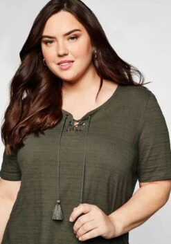 Shirt in Jacquard-Optik. Die kurze Schnürung und das Bindeband mit Quasten am Rundhalsausschnitt unterstreichen den lässig-femininen Look.