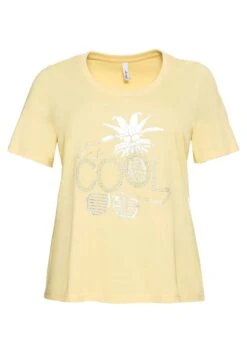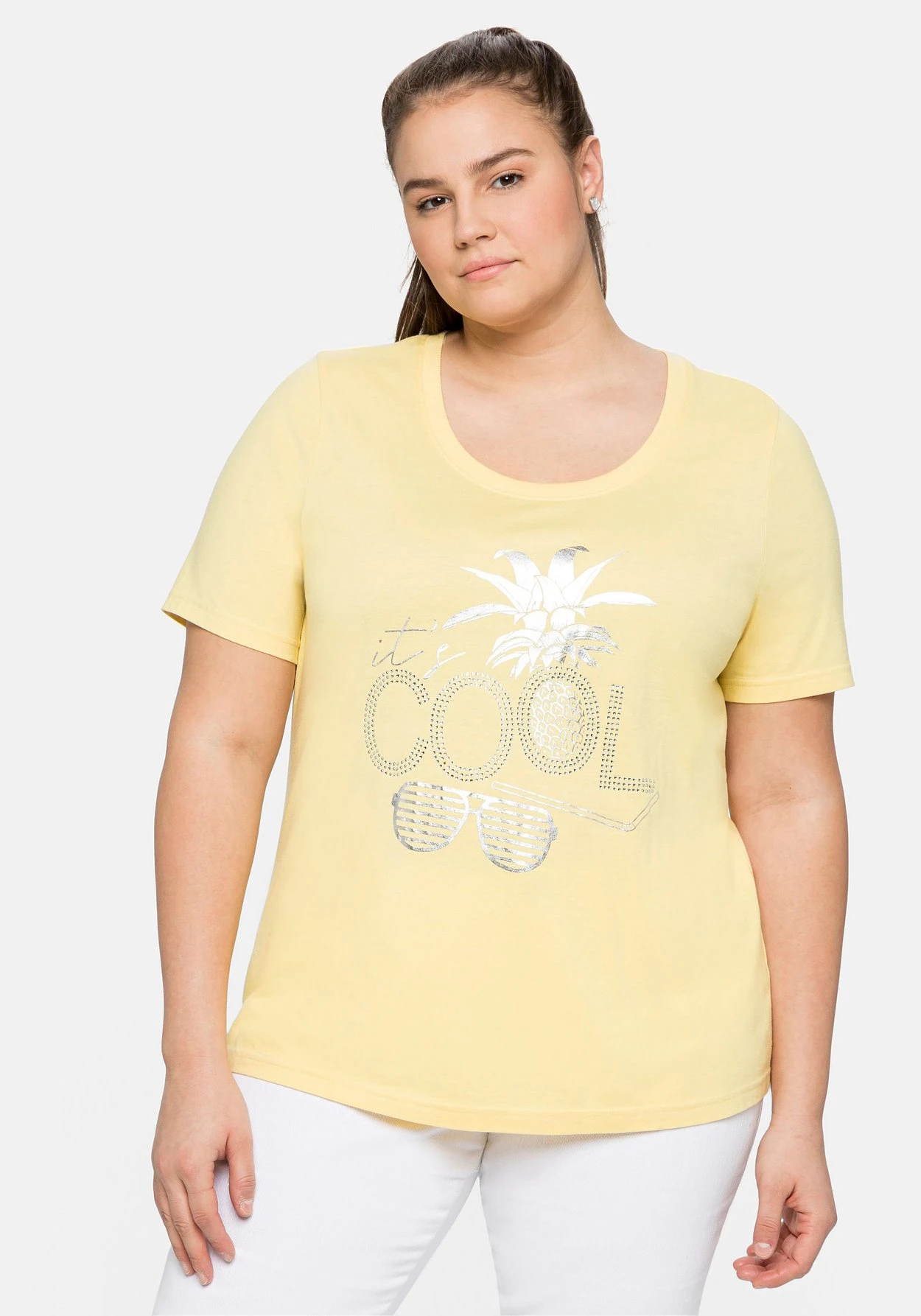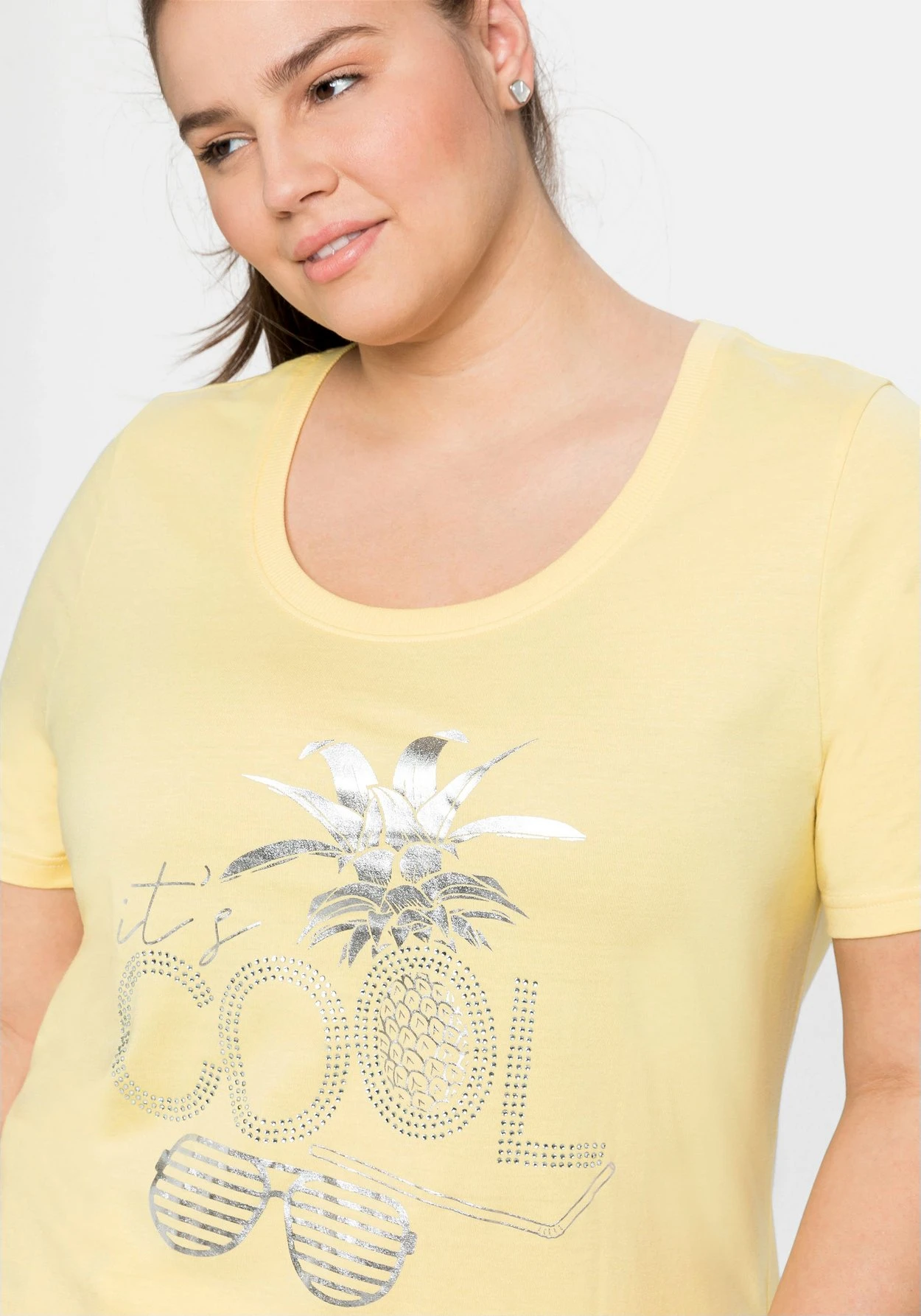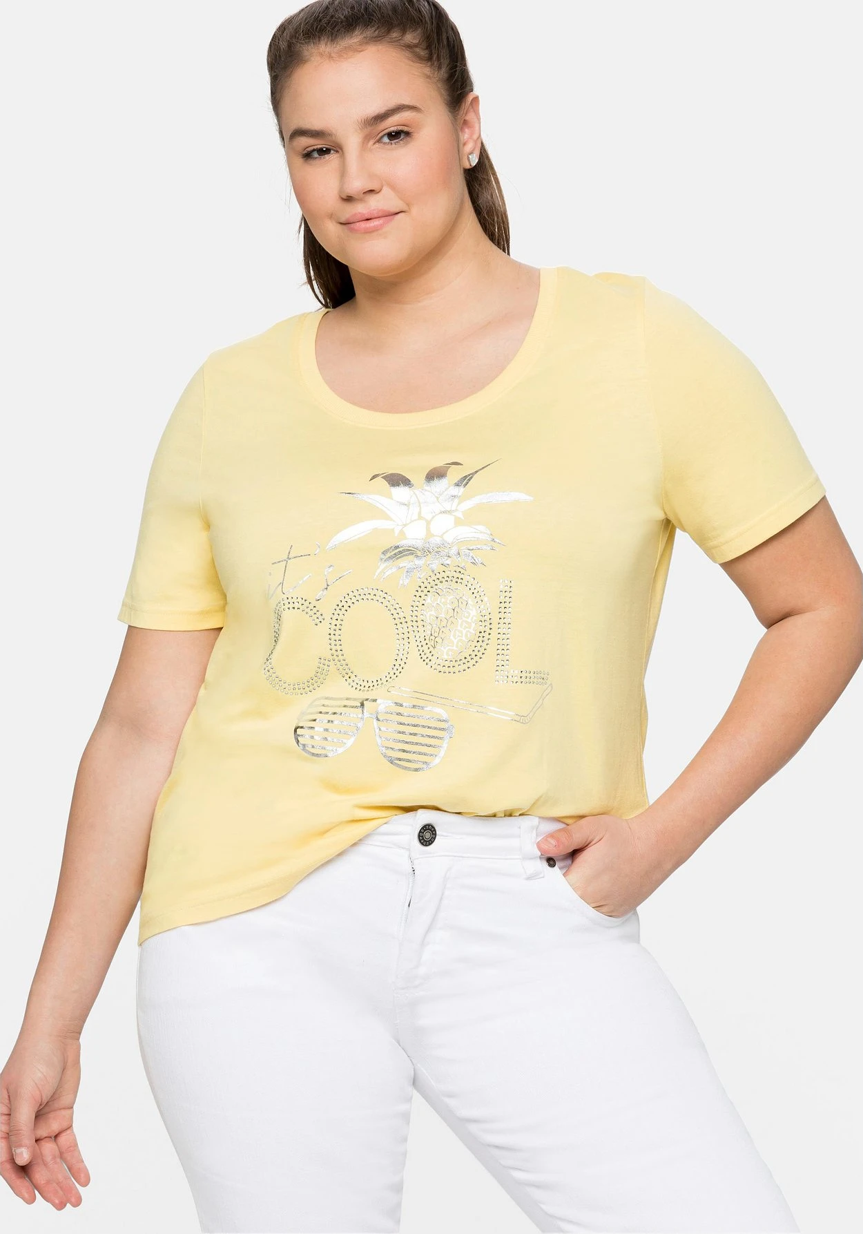 Shirt mit Frontprint. Der Foliendruck ist aufwendig mit Glitzersteinchen verziert und versprüht pure Sommerlaune. Eine Rippblende fasst den Rundhalsausschnitt dezent ein, der etwas länger geschnittene Ärmel schmeichelt den Oberarmen.