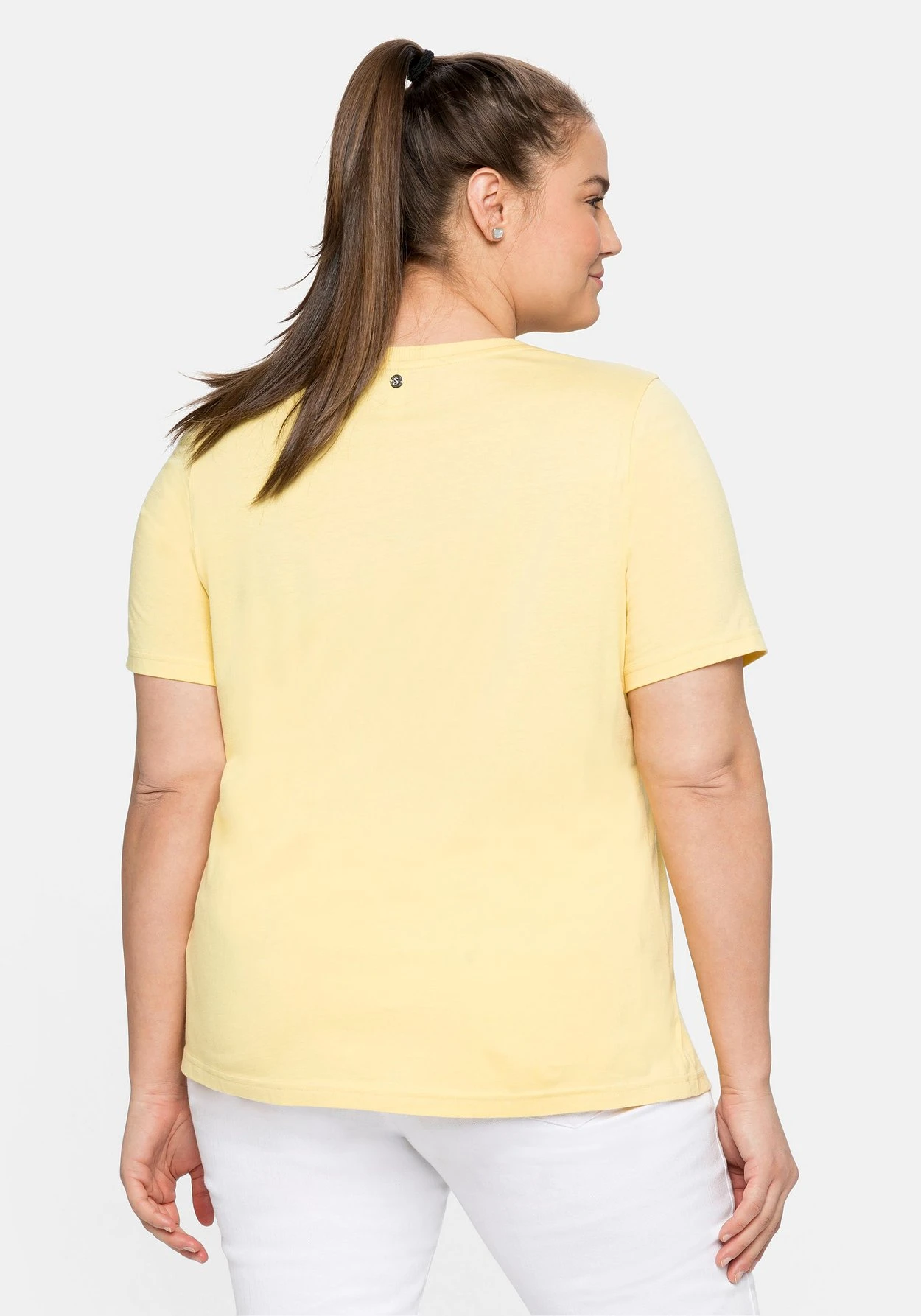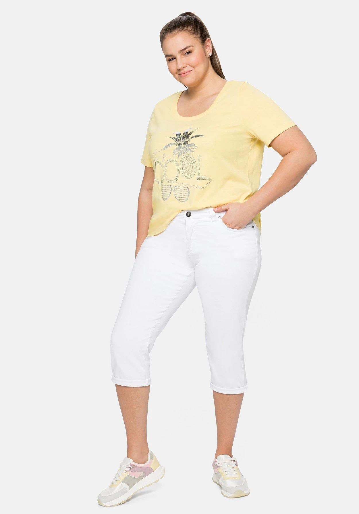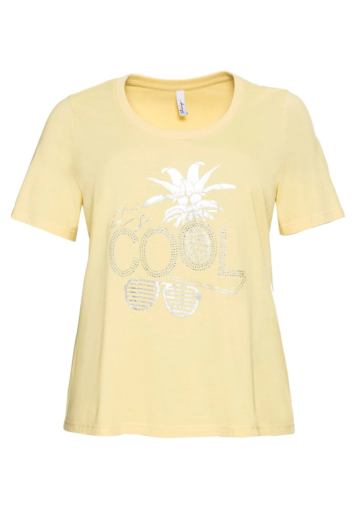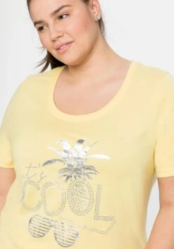Shirt mit Frontprint. Der Foliendruck ist aufwendig mit Glitzersteinchen verziert und versprüht pure Sommerlaune. Eine Rippblende fasst den Rundhalsausschnitt dezent ein, der etwas länger geschnittene Ärmel schmeichelt den Oberarmen.