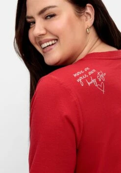Shirt mit Wordingprint. Der kleine glitzernde Druck hinten auf der linken Schulter verleiht dem schlichten Oberteil das besondere Etwas. Glitzernde Nähte an Ärmel- und Saumabschluss sind dazu eine feminine Ergänzung. Ansonsten zeigt sich das Shirt mit klassischem V-Ausschnitt und einem etwas länger geschnittenem Ärmel.