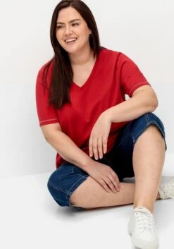 Die Jerseyqualität besteht aus recycelter Baumwolle und recyceltem Polyester. sheego cares!