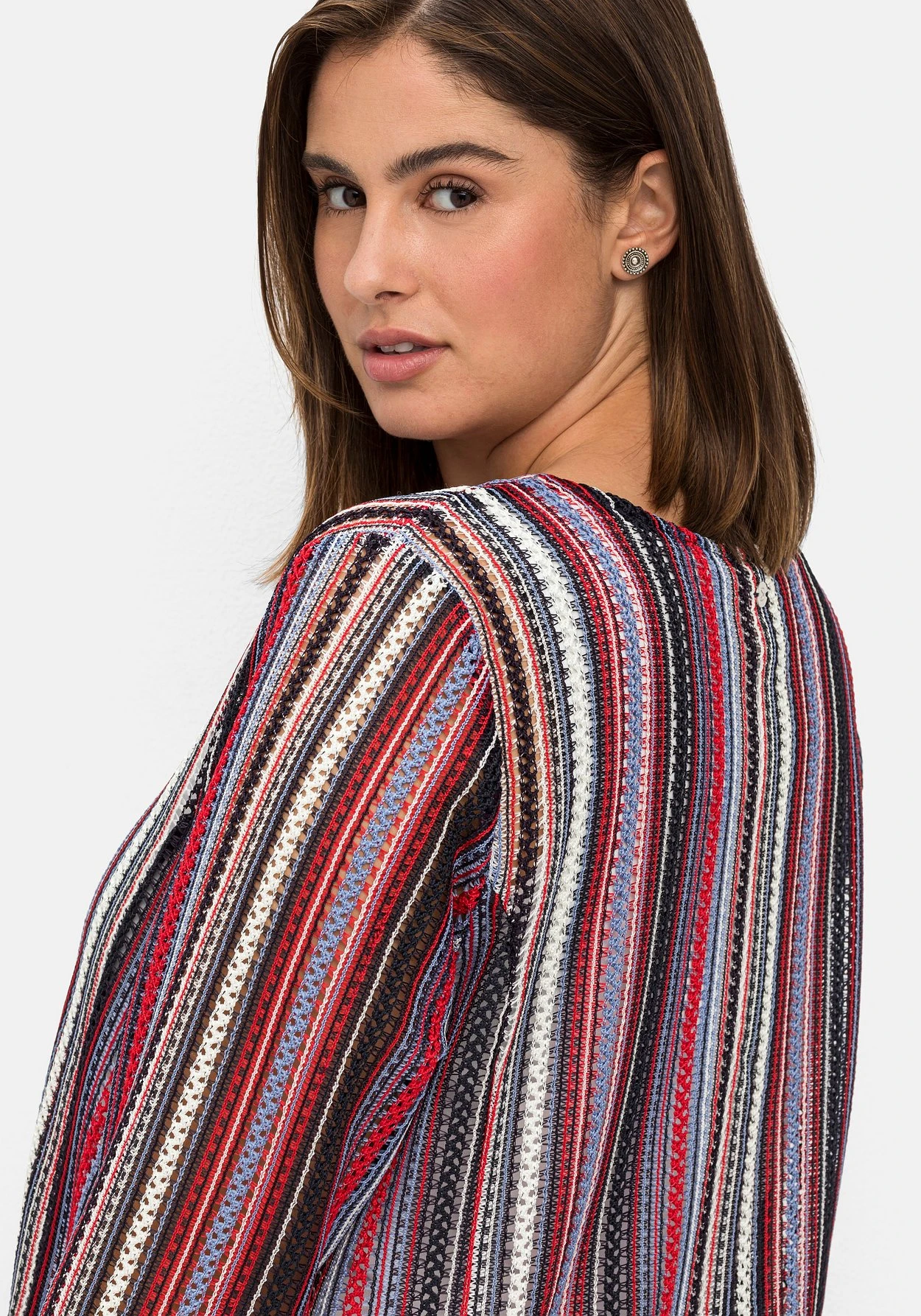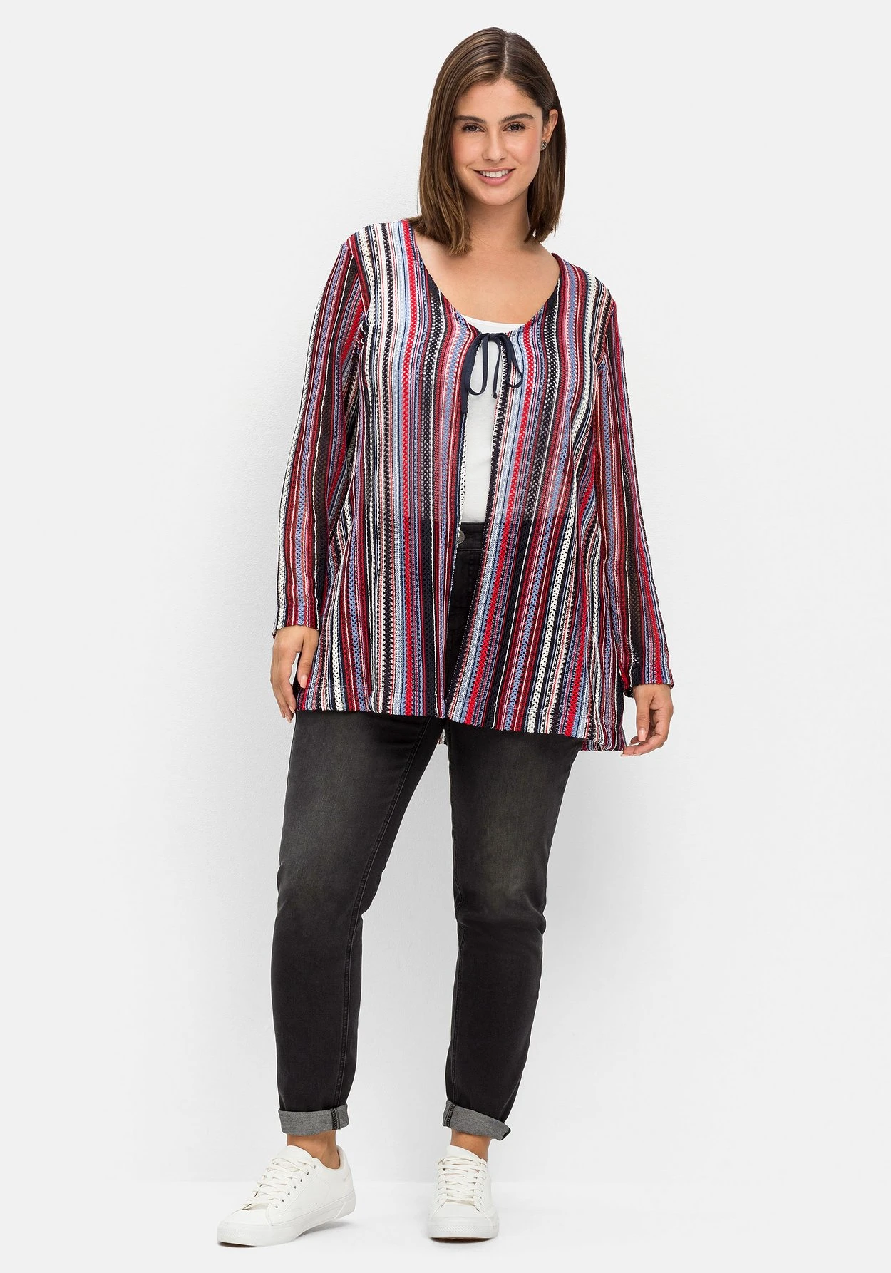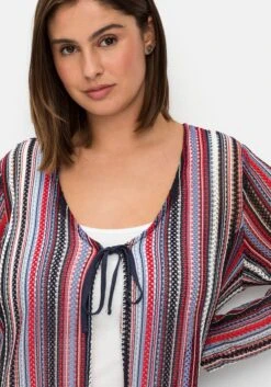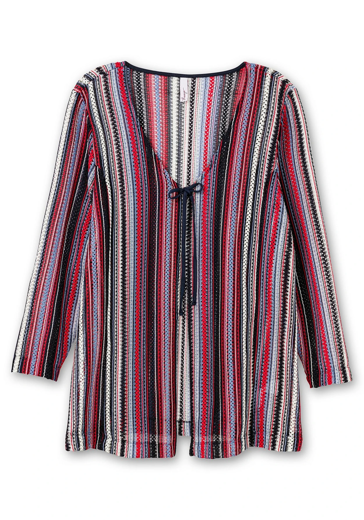 Shirtjacke in leichter A-Linie. Das garngefärbte Muster in Häkel-Optik ist leicht transparent und sorgt für Festival-Charme. Das Bindeband am V-Ausschnitt ist dazu eine entspannte Ergänzung.
