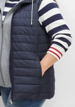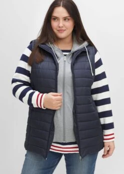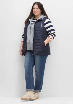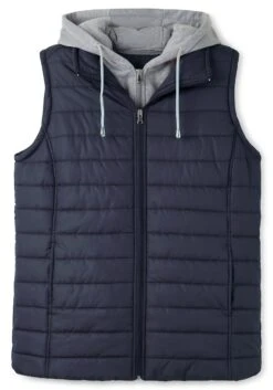 Steppweste in 2-in-Optik. Der Einsatz aus Sweatware und eine Kapuze lassen den lässigen Lagenlook entstehen. Die Steppweste ist mit Umlegekragen, Eingrifftaschen und durchgehendem 2-Wege-Reißverschluss gearbeitet. Besonders praktisch: Der Einsatz kann mit einem Zipper herausgetrennt werden.