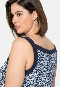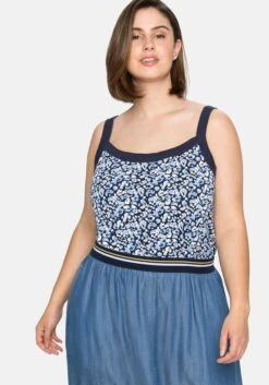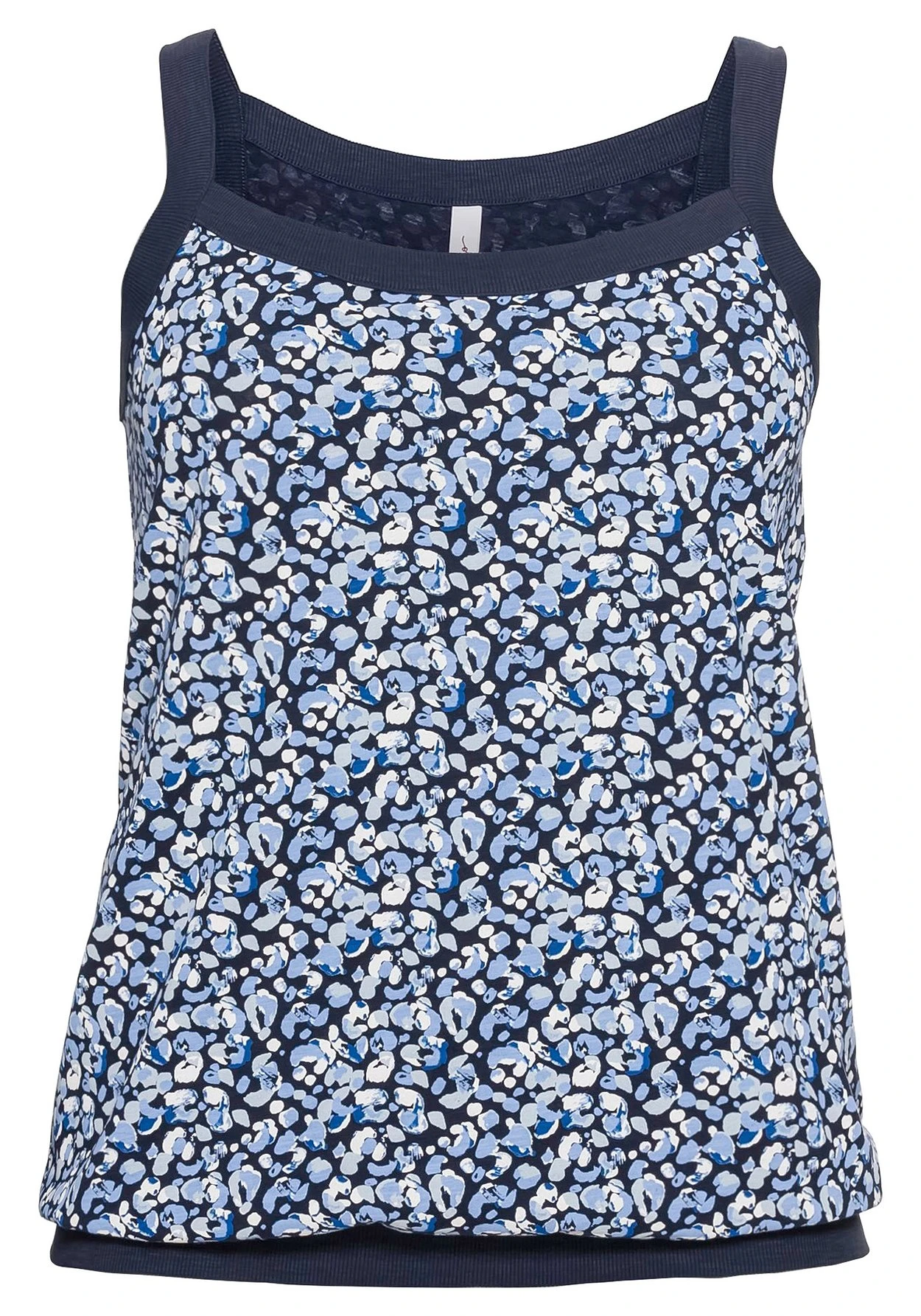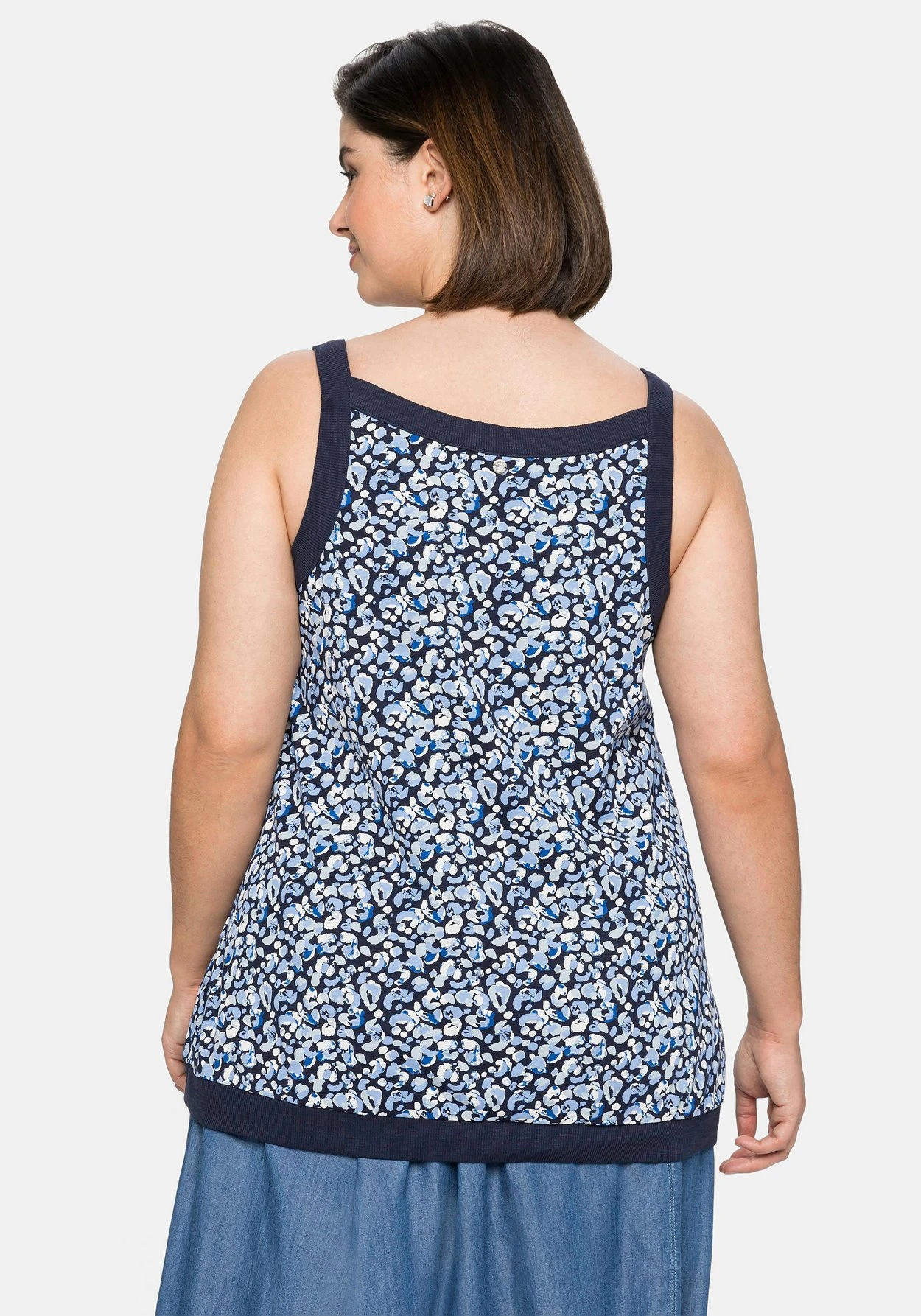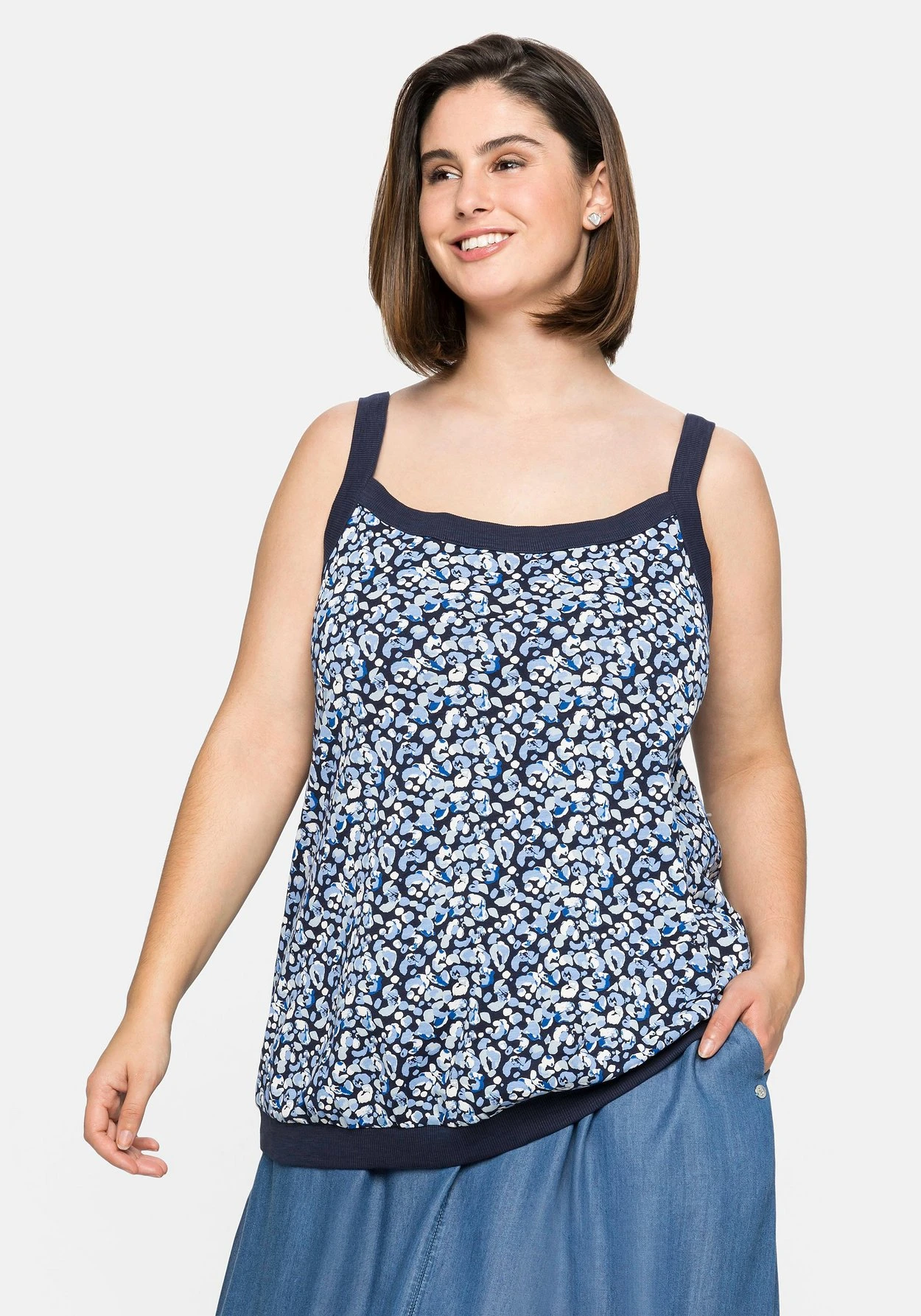Top mit schmalen Trägern. Zum sommerlichen Alloverdruck setzen Träger und Saumbündchen einen dekorativen Kontrast. Der weite Karree-Ausschnitt ergänzt den femininen Style.