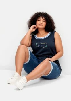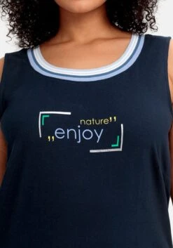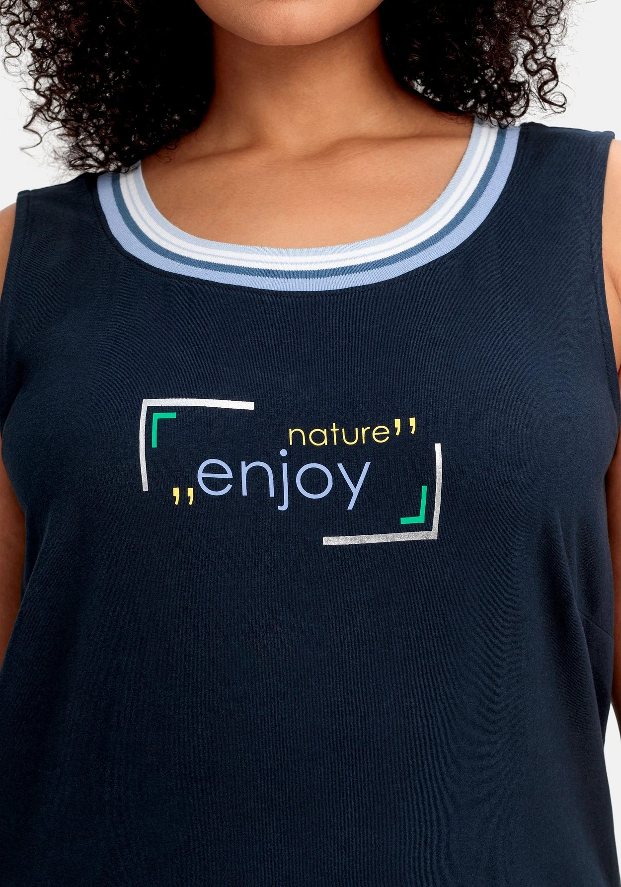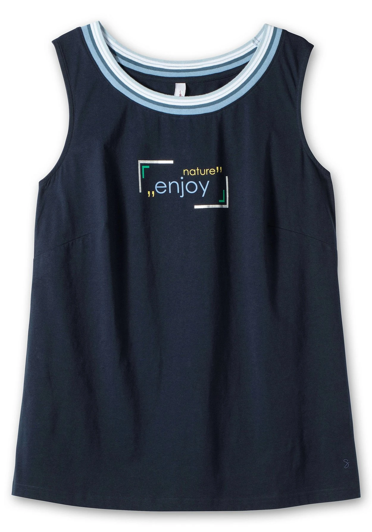 Top mit Frontdruck. Der Wordingprint und die kontraststark gestreifte Rippblende am Rundhalsausschnitt verleihen dem Oberteil einen sportiven Touch.