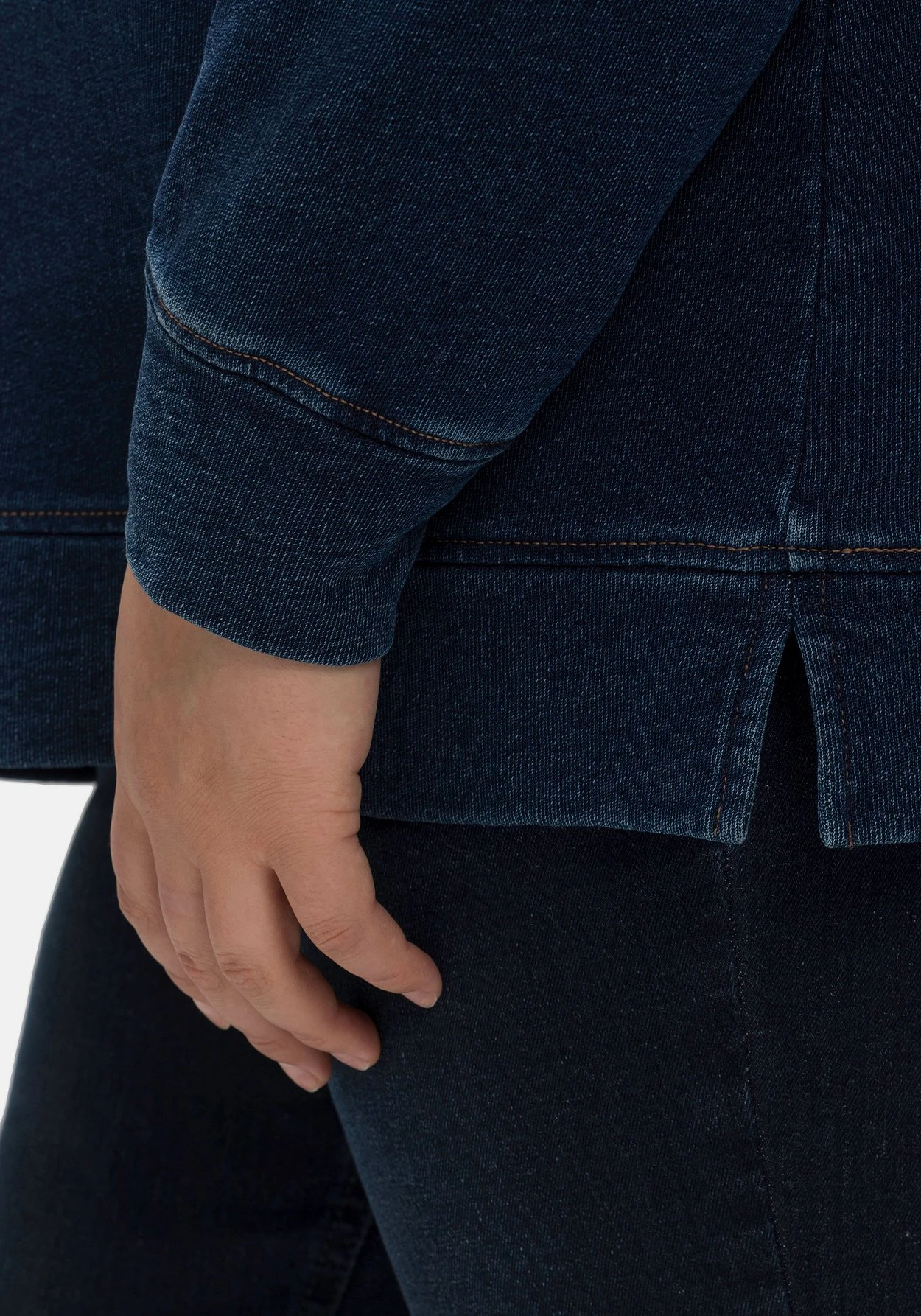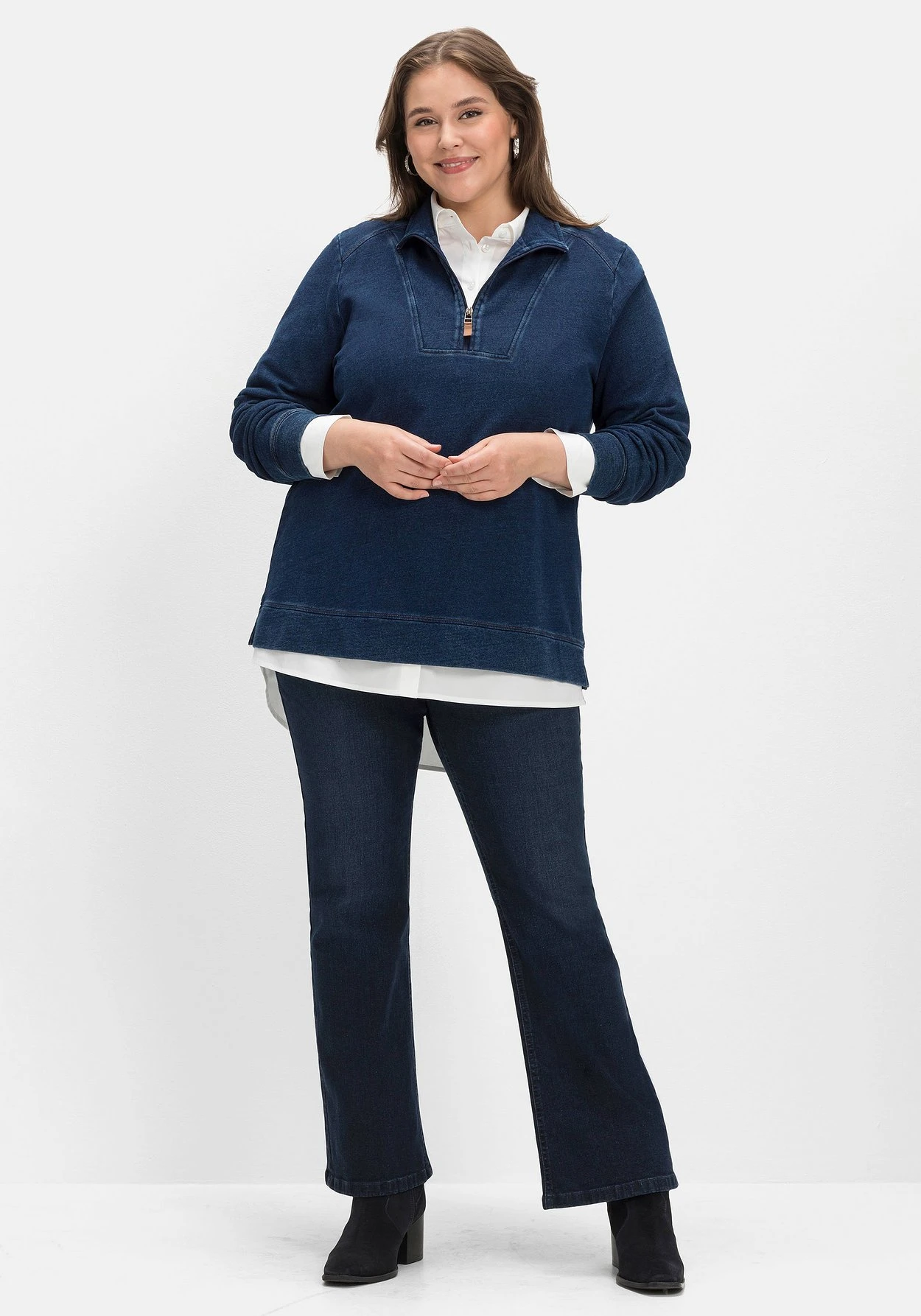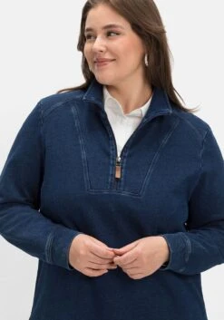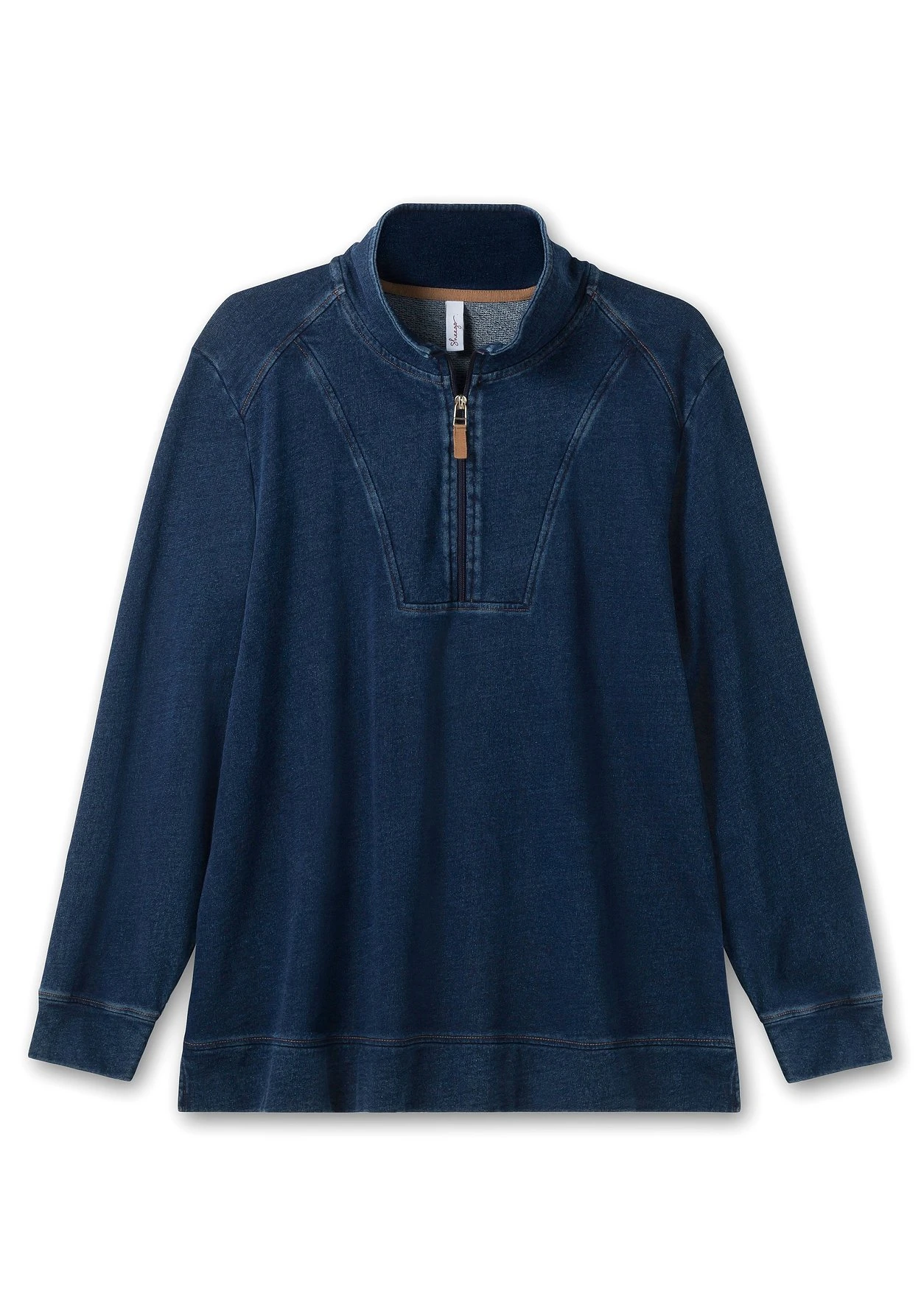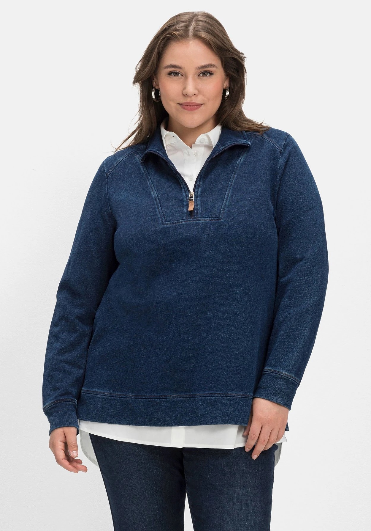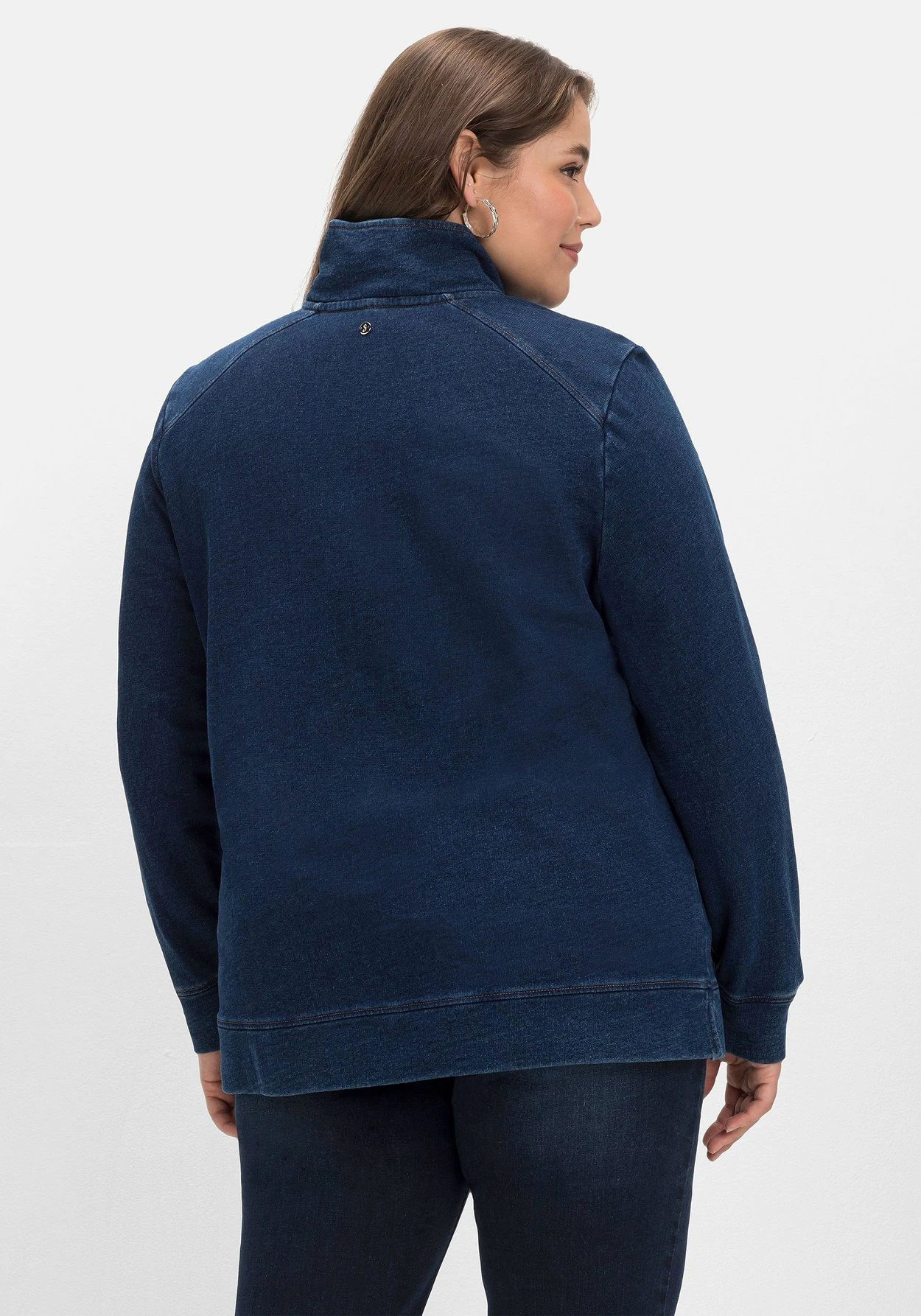 Sweatshirt mit Troyerkragen. Mit dem Reißverschluss lässt sich der Kragen offen oder geschlossen tragen. Besonders lässig wirkt der Troyer durch die verwaschene Denimoptik, die jedem Teil Individualität verleiht. Schräge Schulterpassen und markante Nähte unterstreichen den legeren Look.