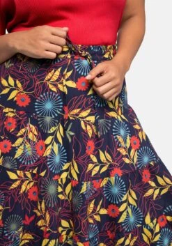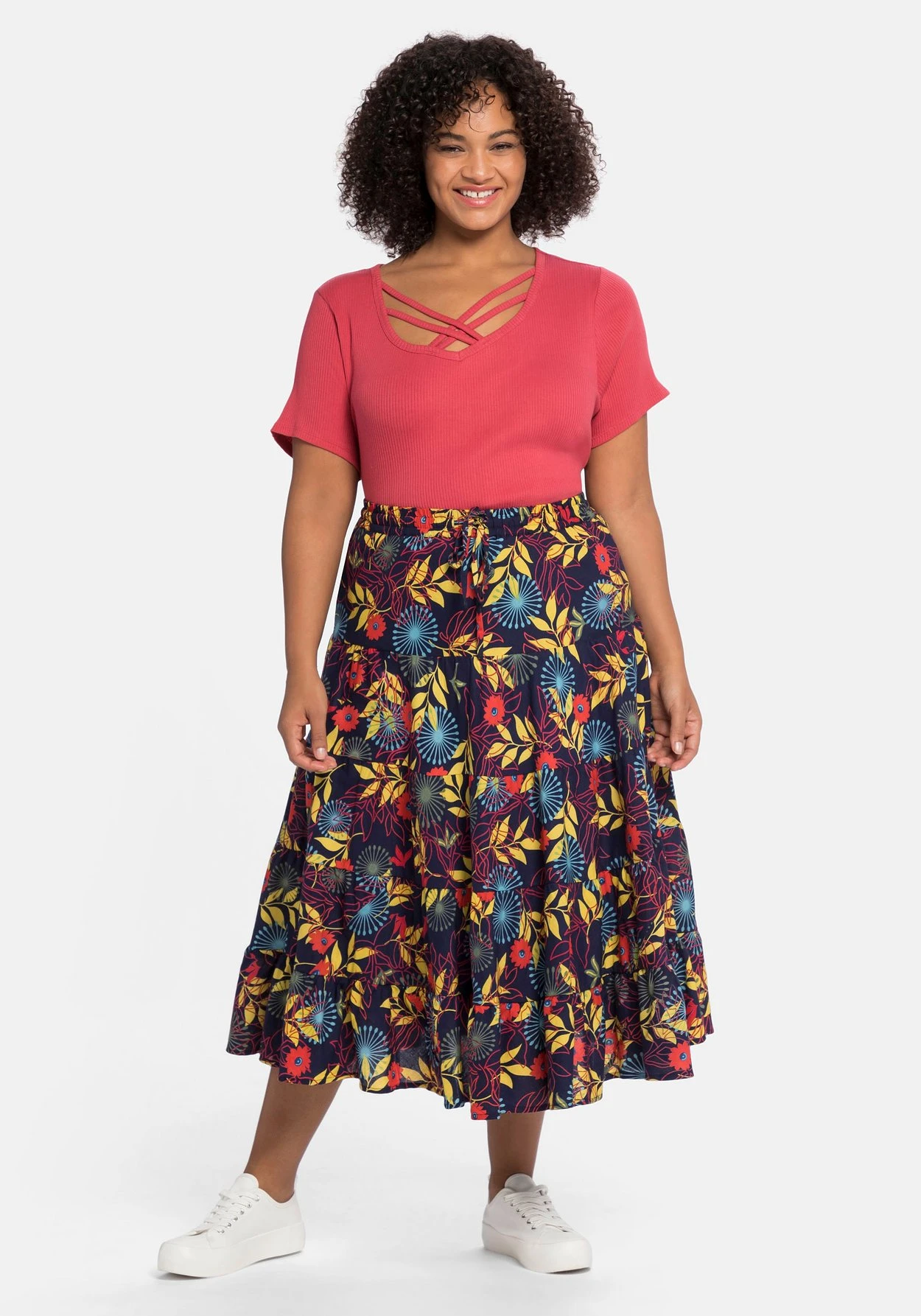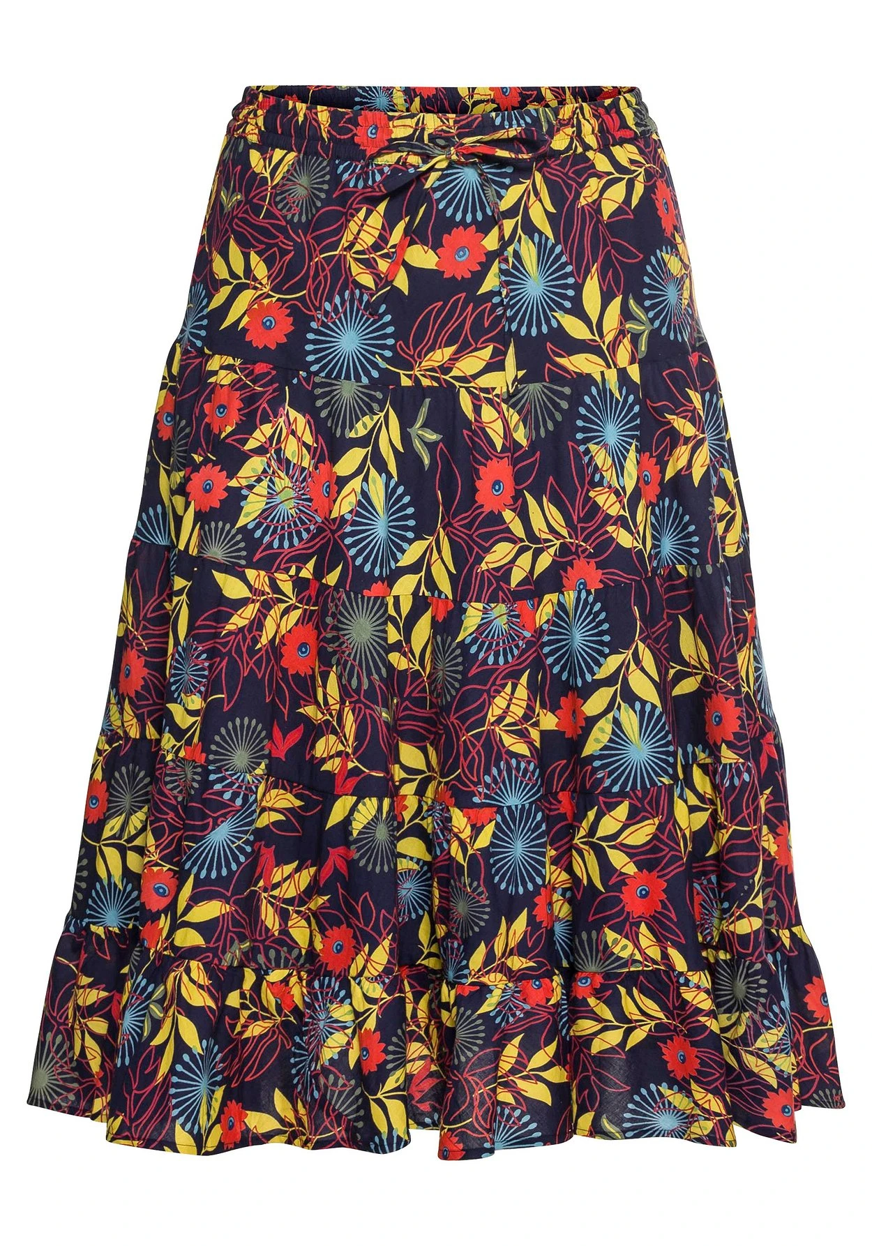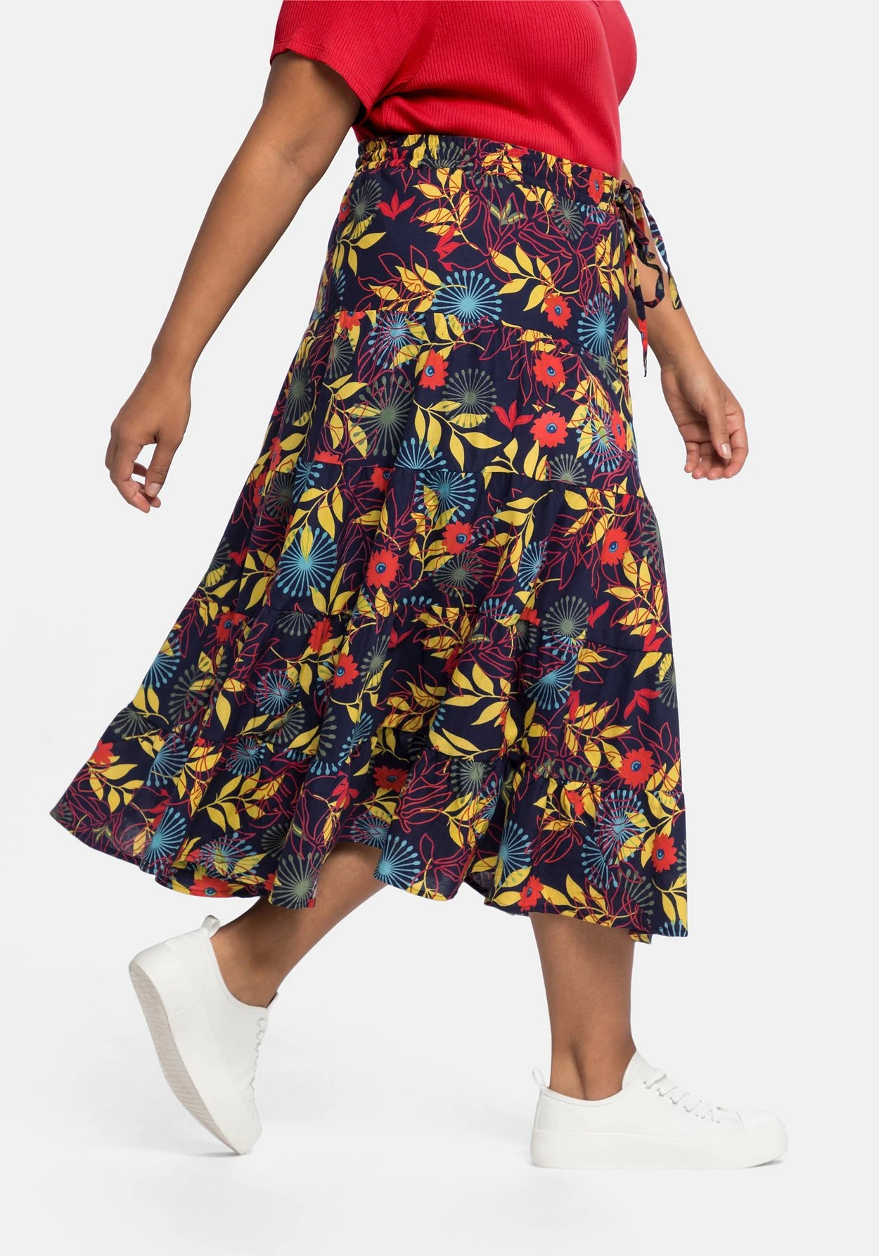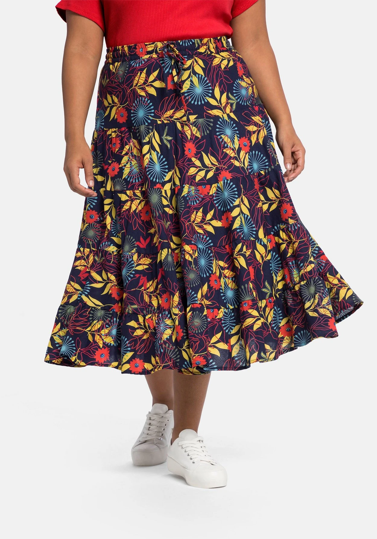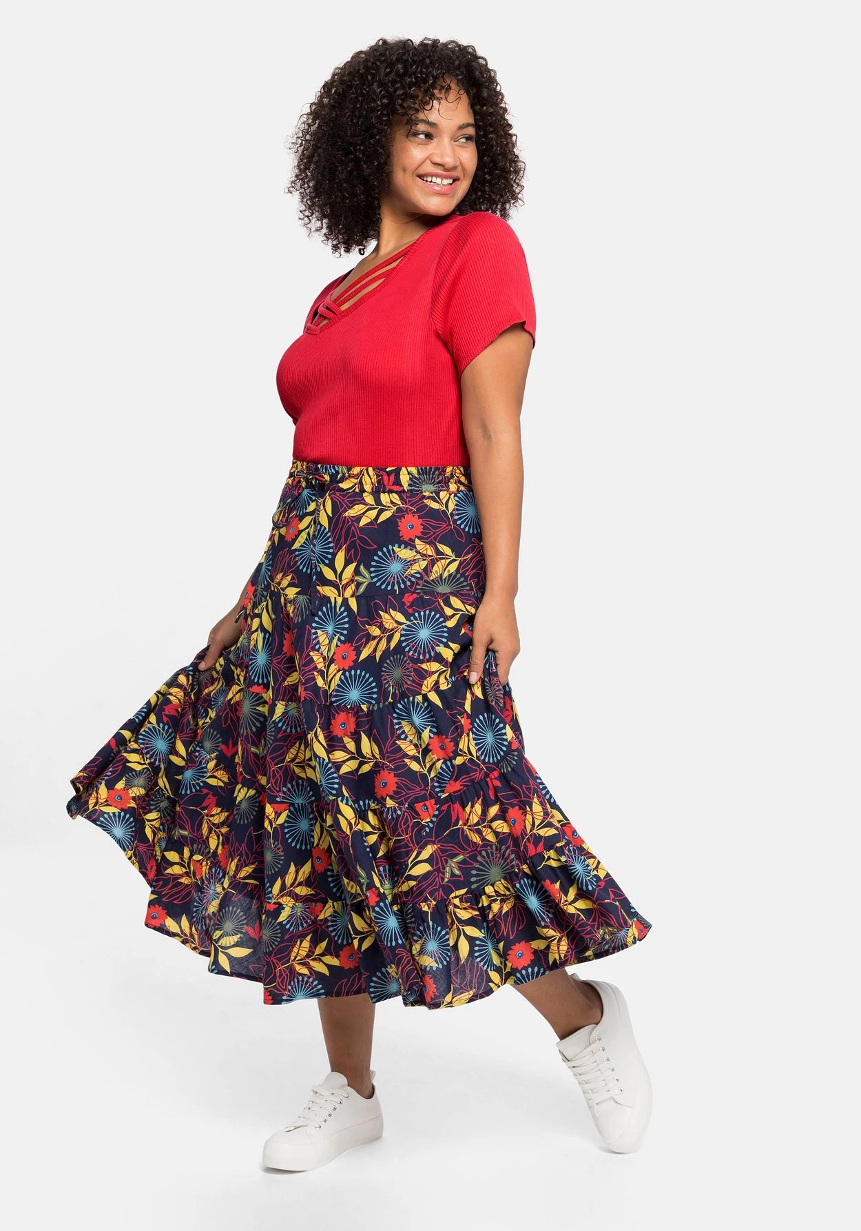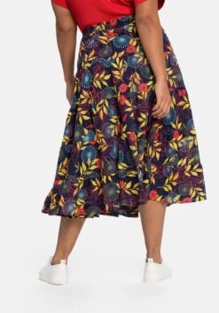 Die ausgestellte Schnittform mit Volant am Saum schwingt mit jedem Schritt schön mit. Die wadenlange Midilänge macht den Rock zum modischen Stylingpartner.