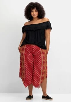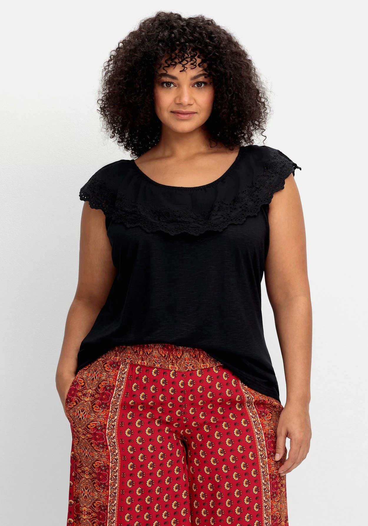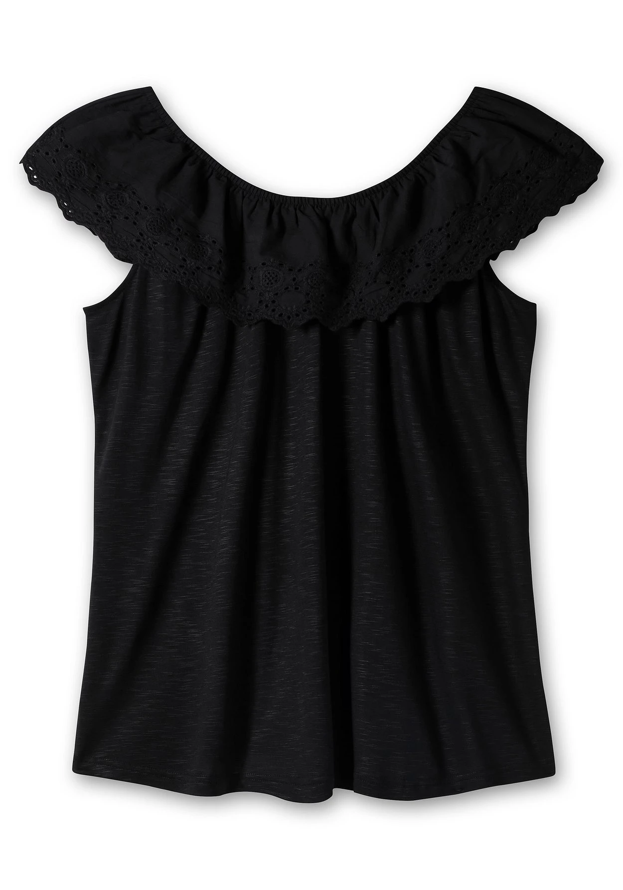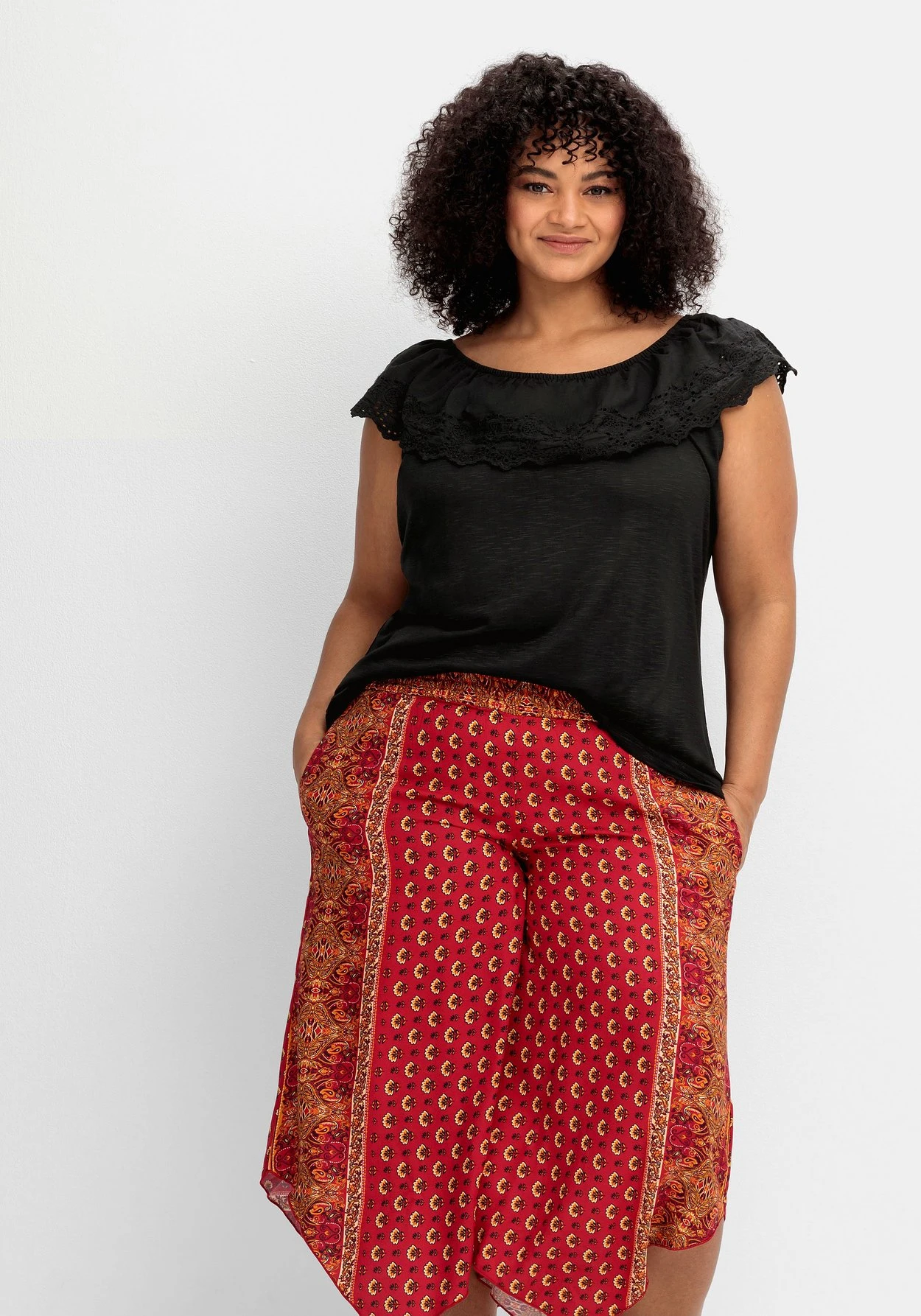Shirt aus Slubgarn von sheego by Joe Browns. Eyecatcher ist der weite Carmen-Ausschnitt, der durch den Gummizug optimalen Halt bekommt. Lochstickereien und die Wellensaumkante unterstreichen die feminine Optik.