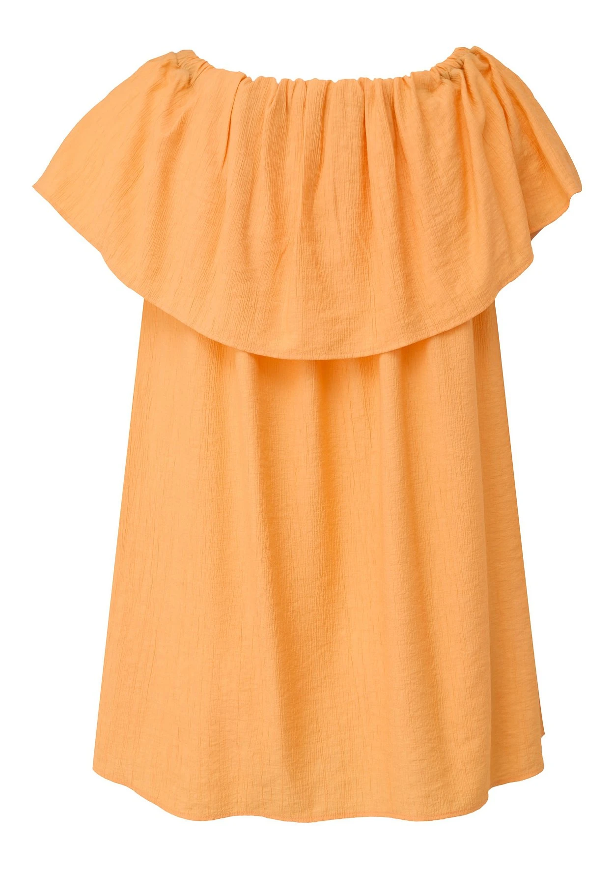 Ärmellose Bluse von s.Oliver. Für den sommerlich-raffinierten Look sorgt der schulterfreie Carmenausschnitt mit Raffung und breitem Volant. Auch die gecrinkelte Struktur wirkt luftig und leger.