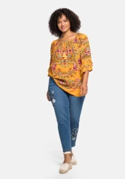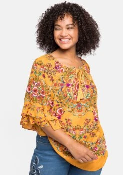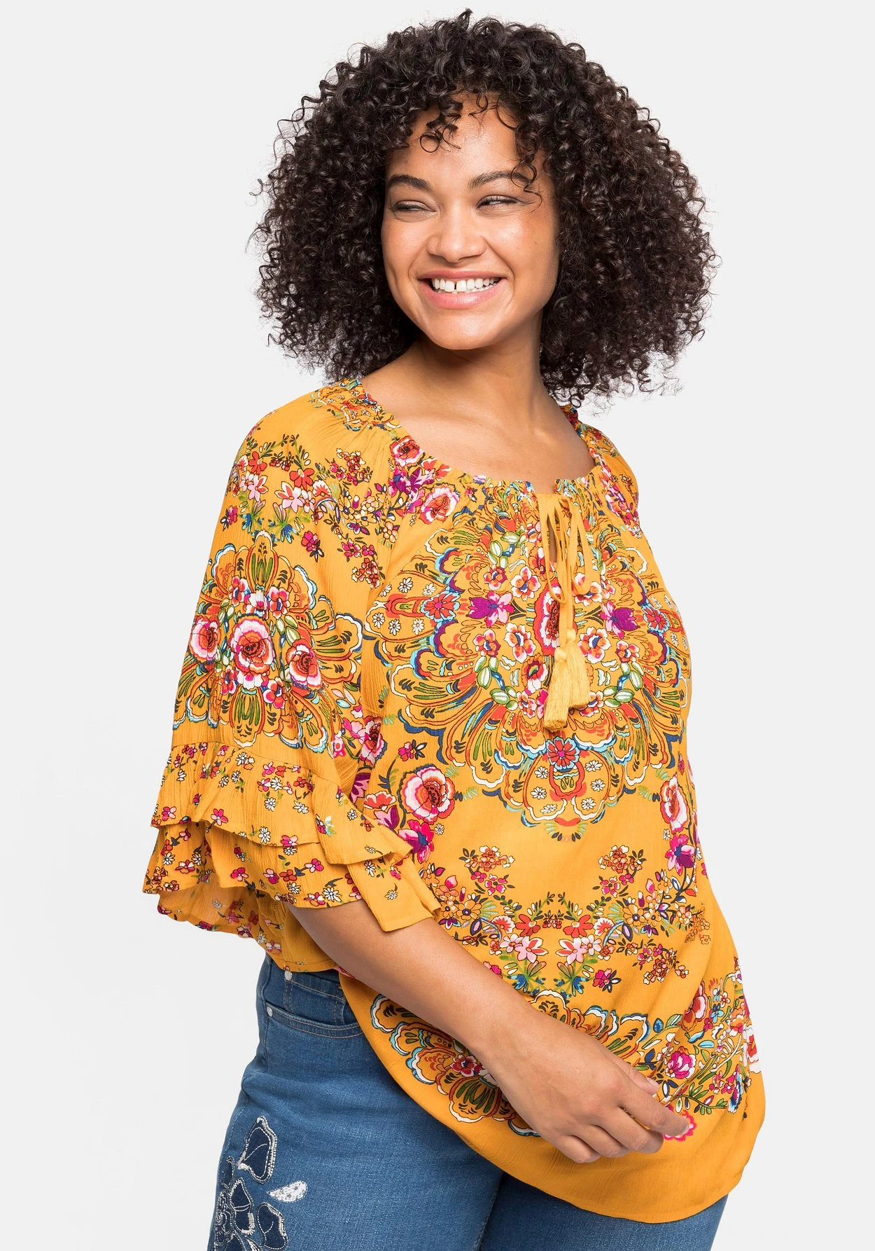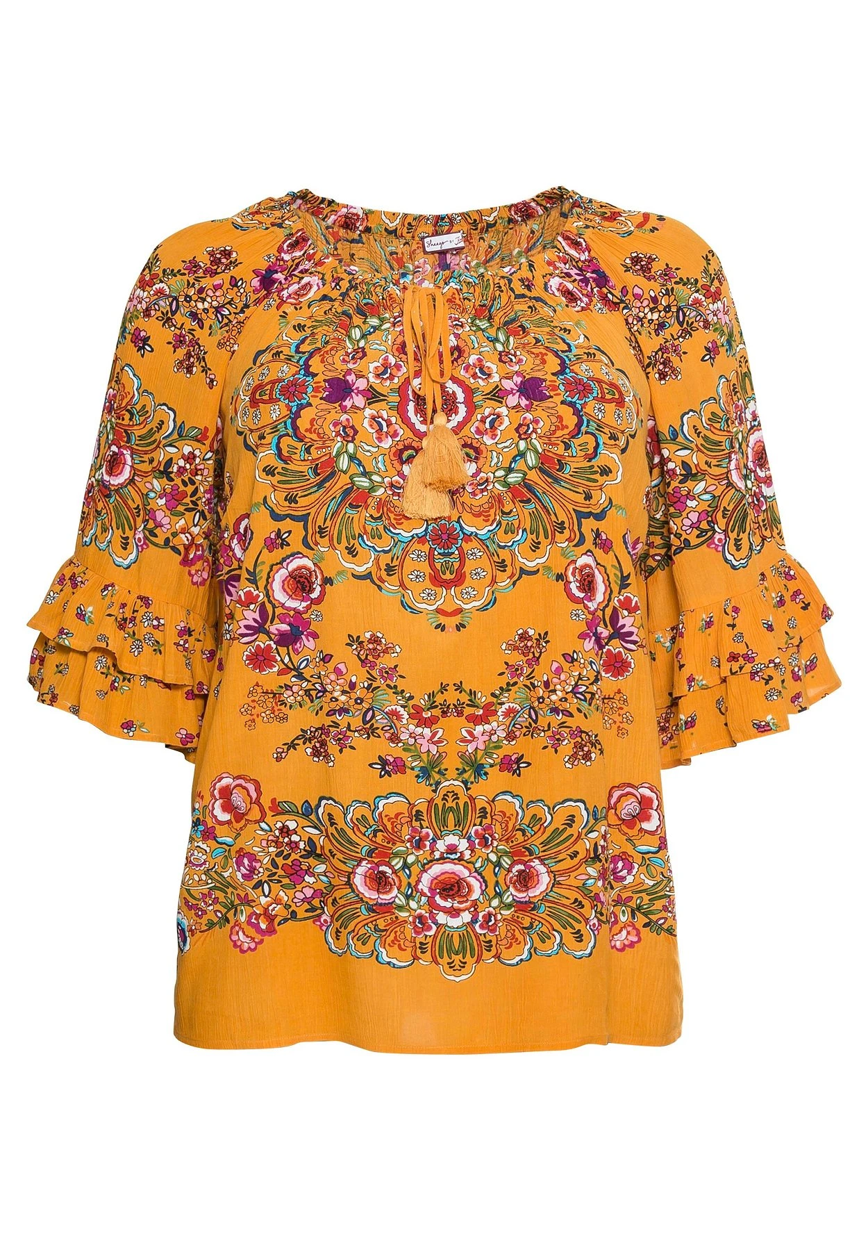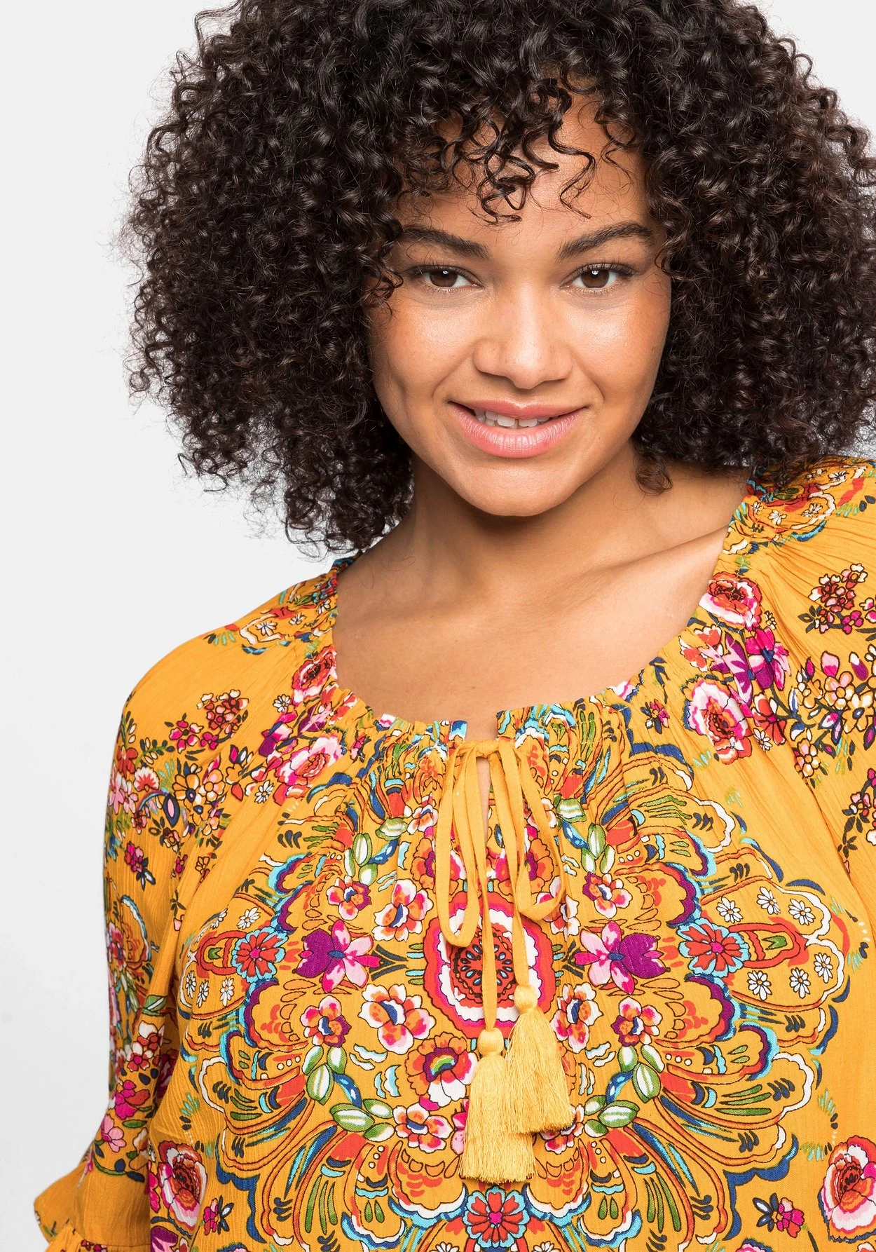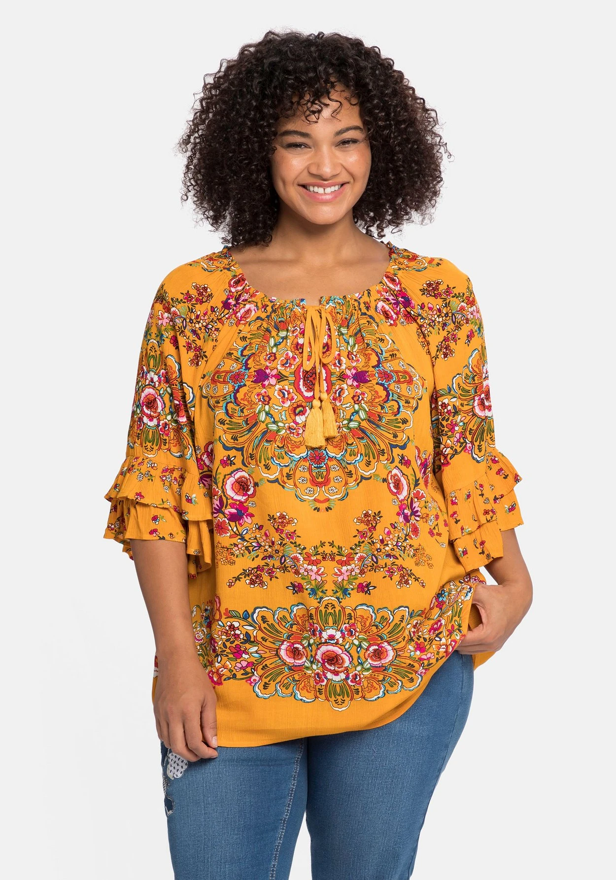 Tunika mit floralem Alloverdruck und rundum verlaufendem Borderprint von sheego by Joe Browns. Der modische Boho-Look zeigt sich mit elastischem Rundhalsausschnitt und Schlitz, das Bindeband mit Quasten unterstreicht die verspielte, romantische Optik. Die Raglanärmel enden in 3/4-Länge und werden durch Rüschen feminin ergänzt.