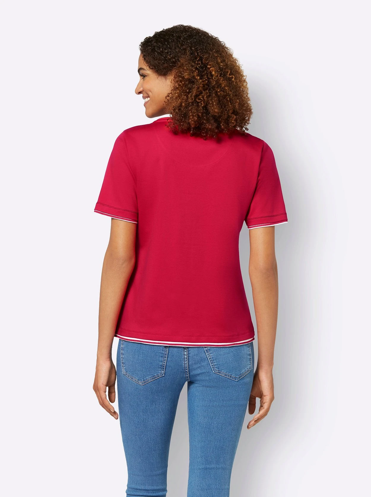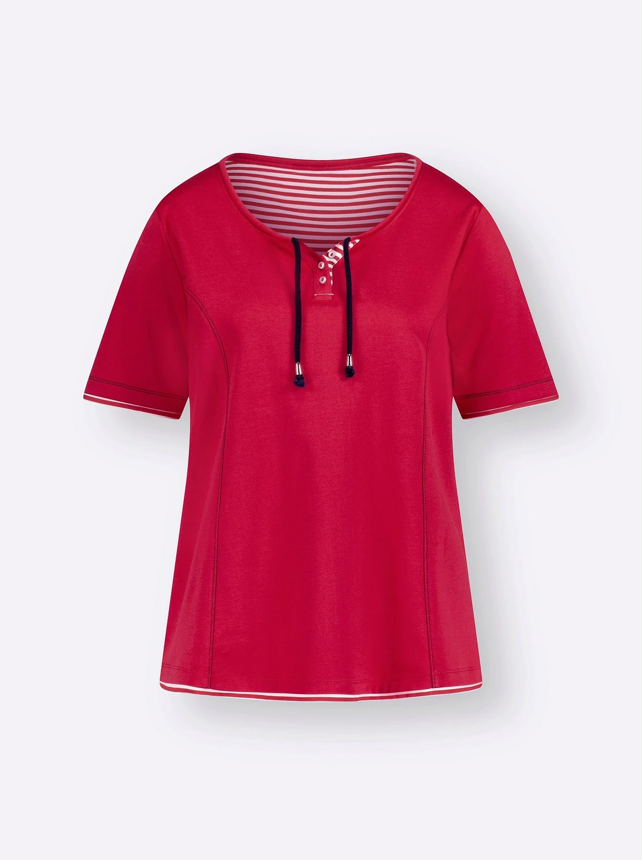 Shirt von WITT WEIDEN, aus formstabiler Interlock-Qualität. Das Bindeband mit silberfarbenen Stoppern am Rundhalsausschnitt lässt einen sportiven Look entstehen. Auch die Wiener Nähte sind kontrastfarben gearbeitet. So sorgen sie nicht nur für einen guten Sitz, sondern setzen auch modische Akzente. Die kurze Knopfleiste, die Ärmelabschlüsse sowie der gerade Saum sind gestreift unterlegt und runden den Style charmant ab.
